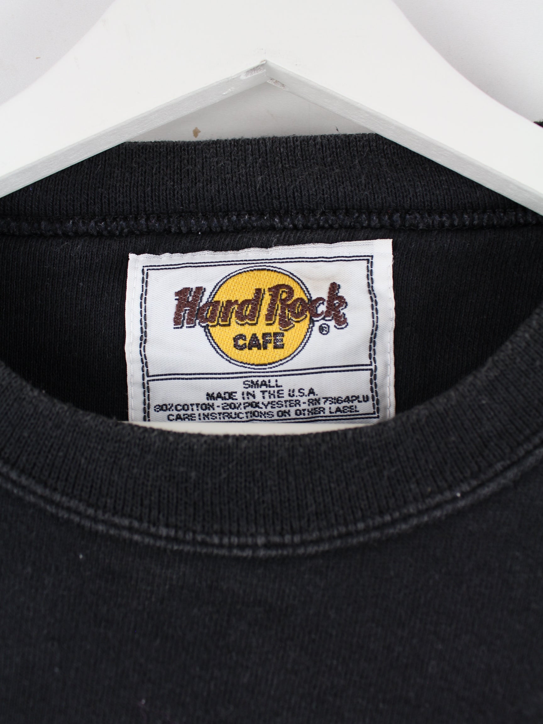 Sweater des Labels Hard Rock Cafe mit Stick in Größe S aus den 90'ern. Er ist aus einer Baumwollmischung gefertigt und in Schwarz zu haben.