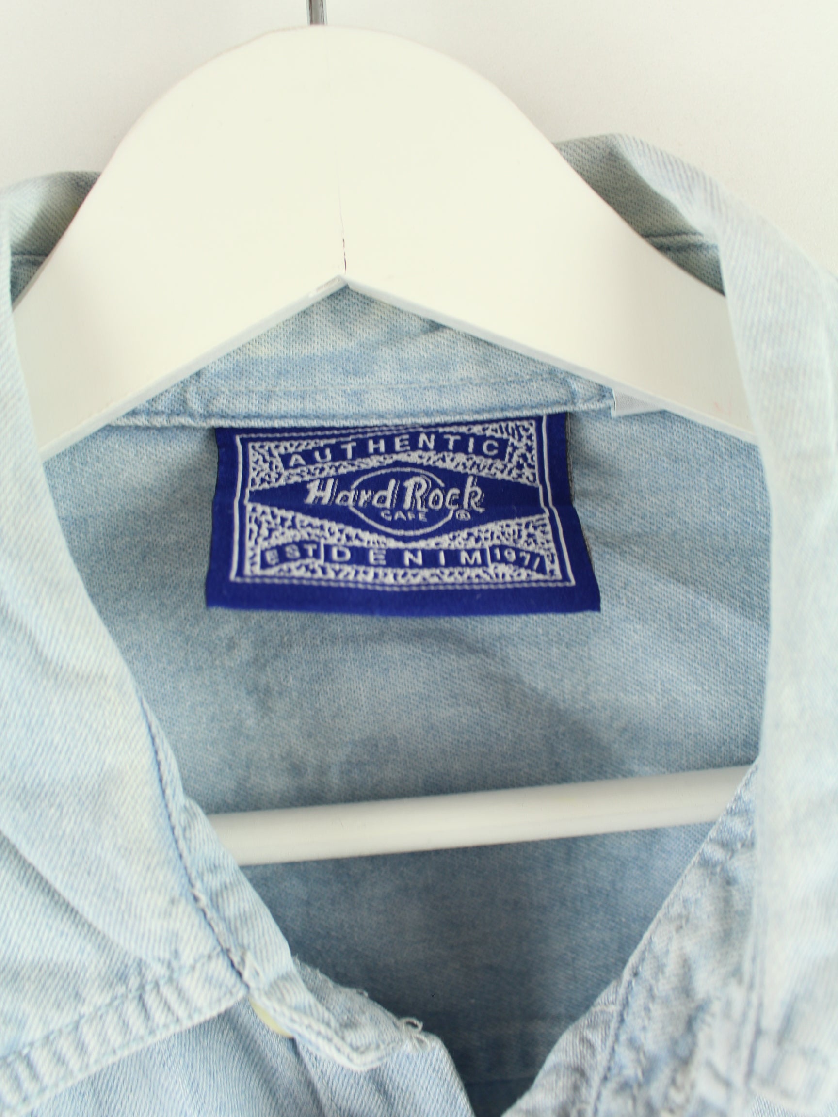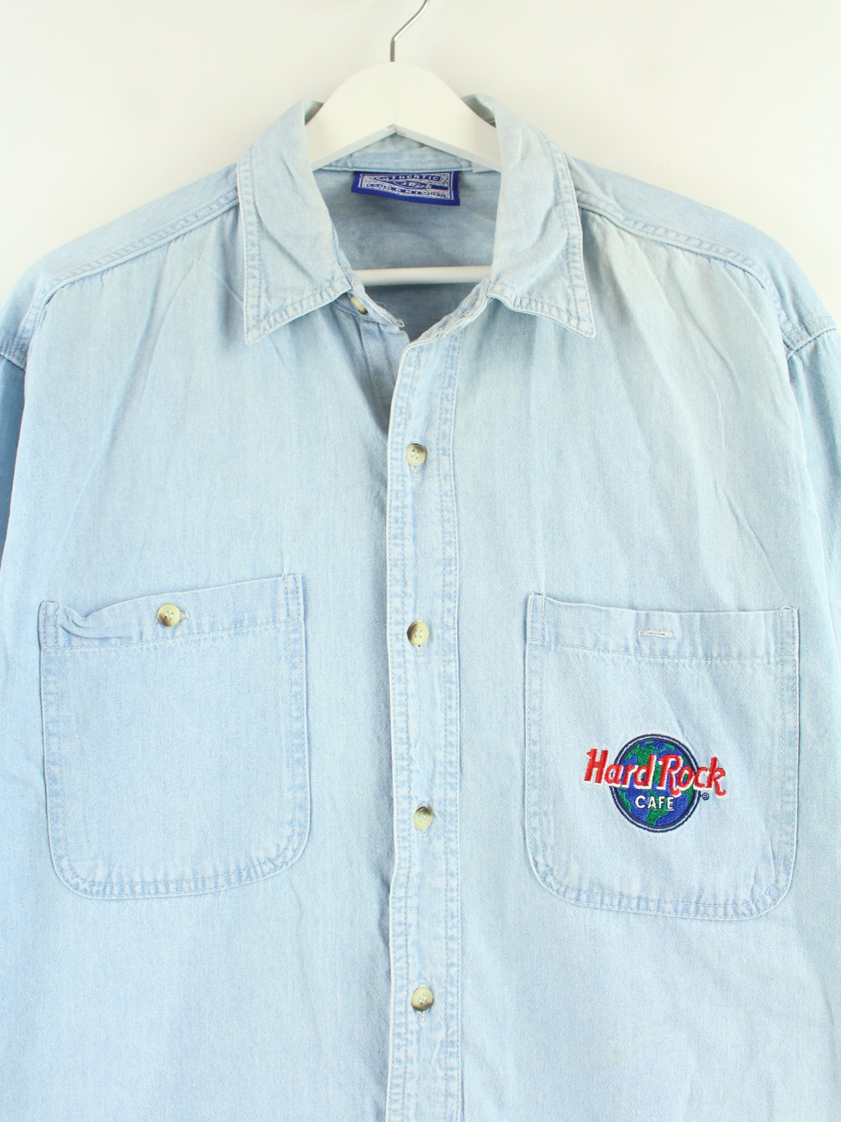 Freizeit Hemd vom Label Hard Rock Cafe mit Stick in Größe L aus den 90'ern. Es ist aus Baumwolle gefertigt und in Blau im Bestand.