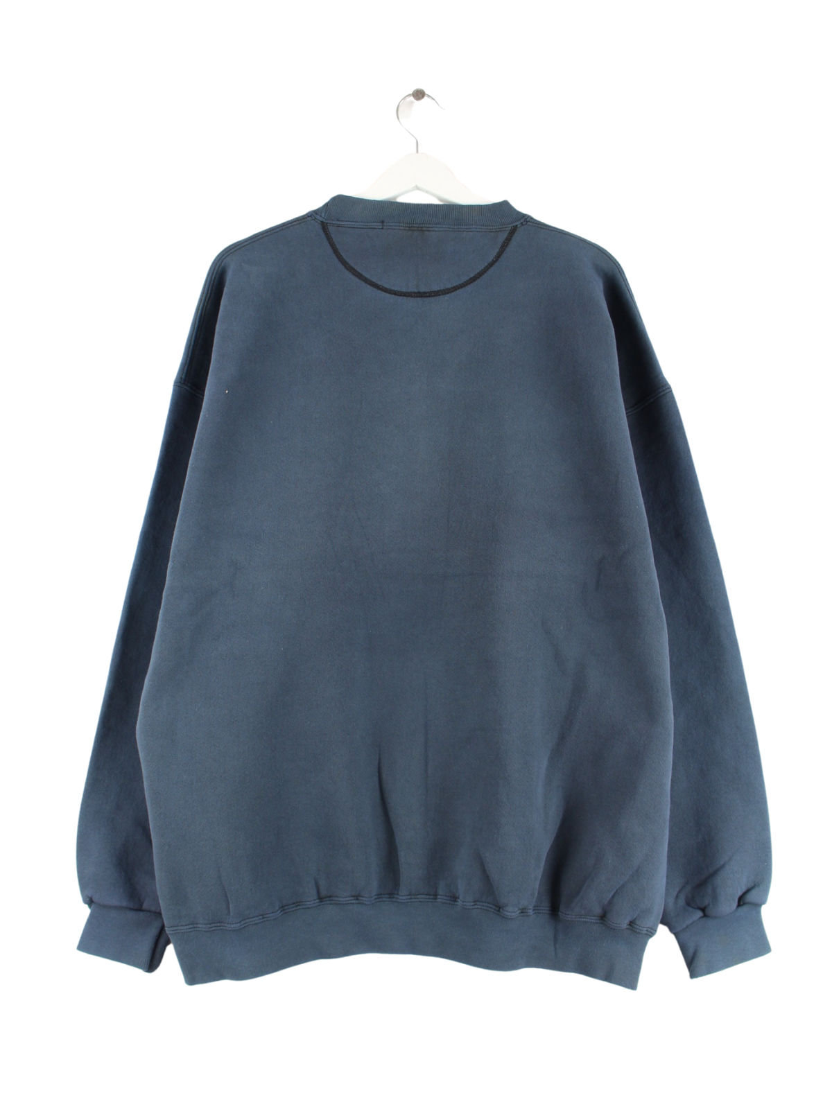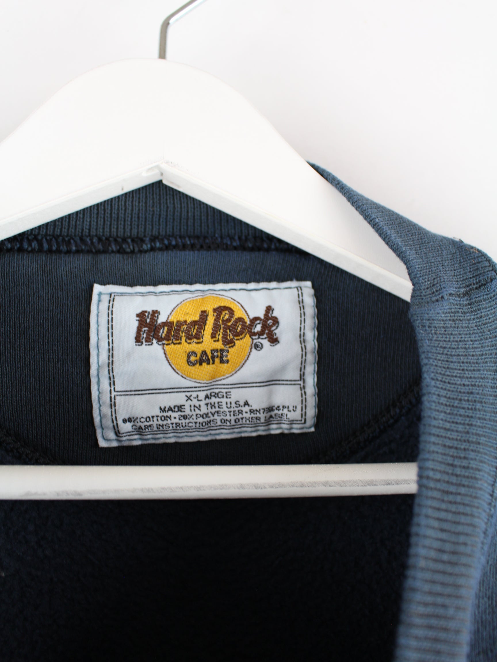 Sweater vom Label Hard Rock Cafe mit Stickereien in Größe XL aus den 90'ern. Er ist aus einer Baumwollmischung gefertigt und in Blau im Bestand.