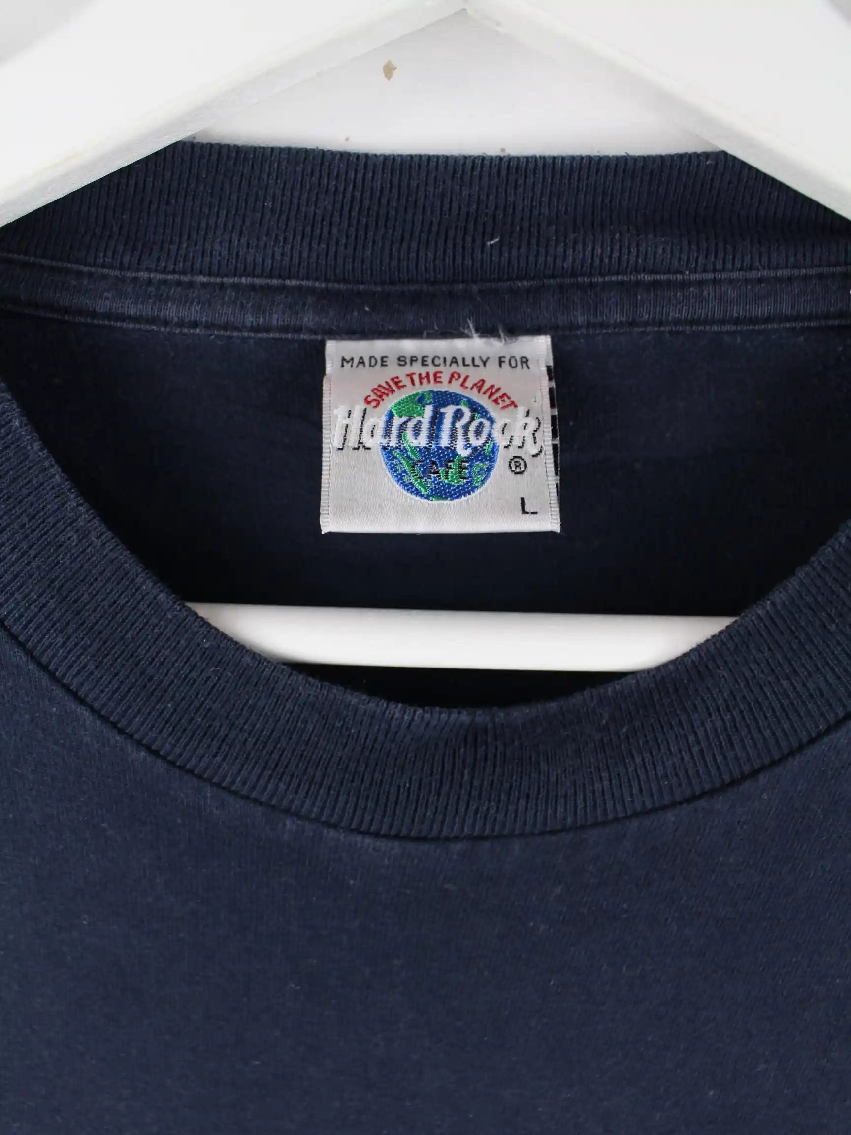 T-Shirt des Labels Hard Rock Cafe in Größe L aus den 90'ern. Es ist aus Baumwolle gefertigt und in Blau lieferbar.