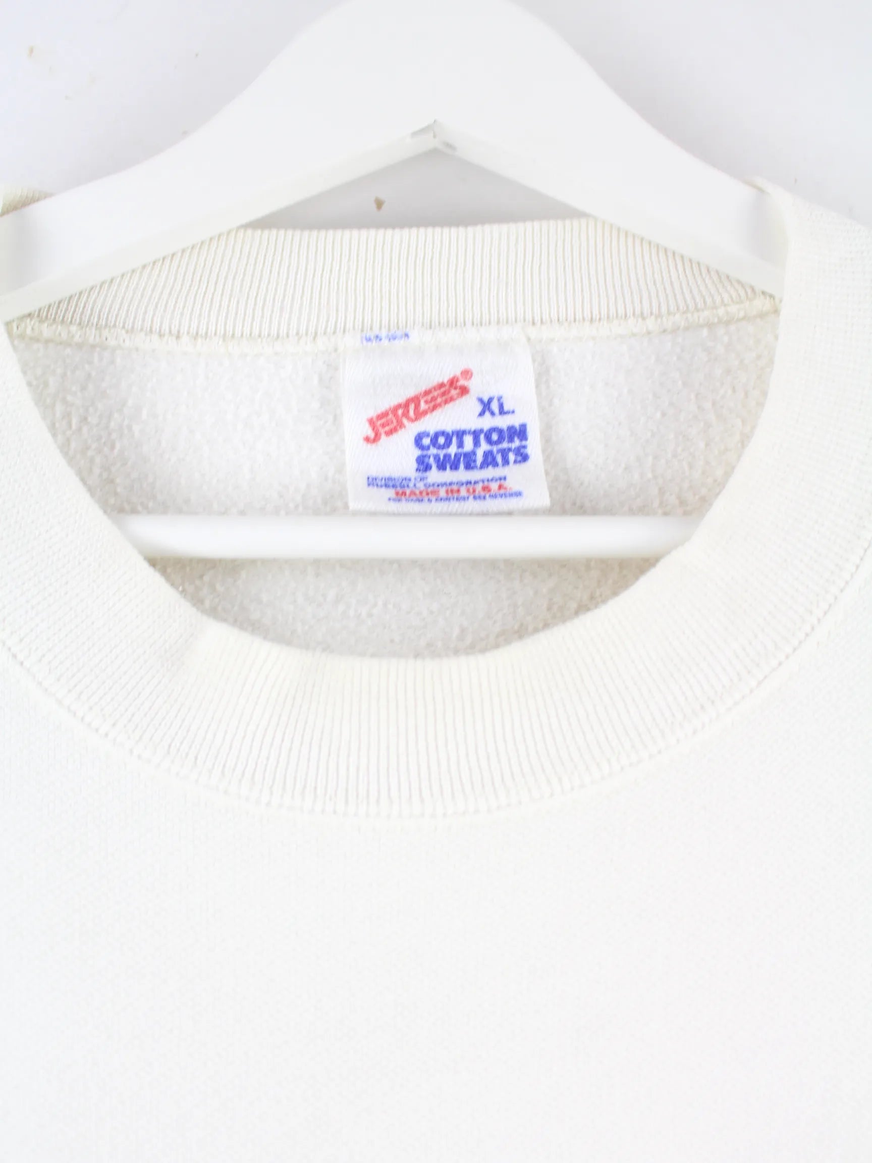 Weißer Sweater mit Stick vom Label Jerzees in Größe XL. Er ist aus einer Baumwollmischung produziert und in sehr gutem Zustand zu haben.