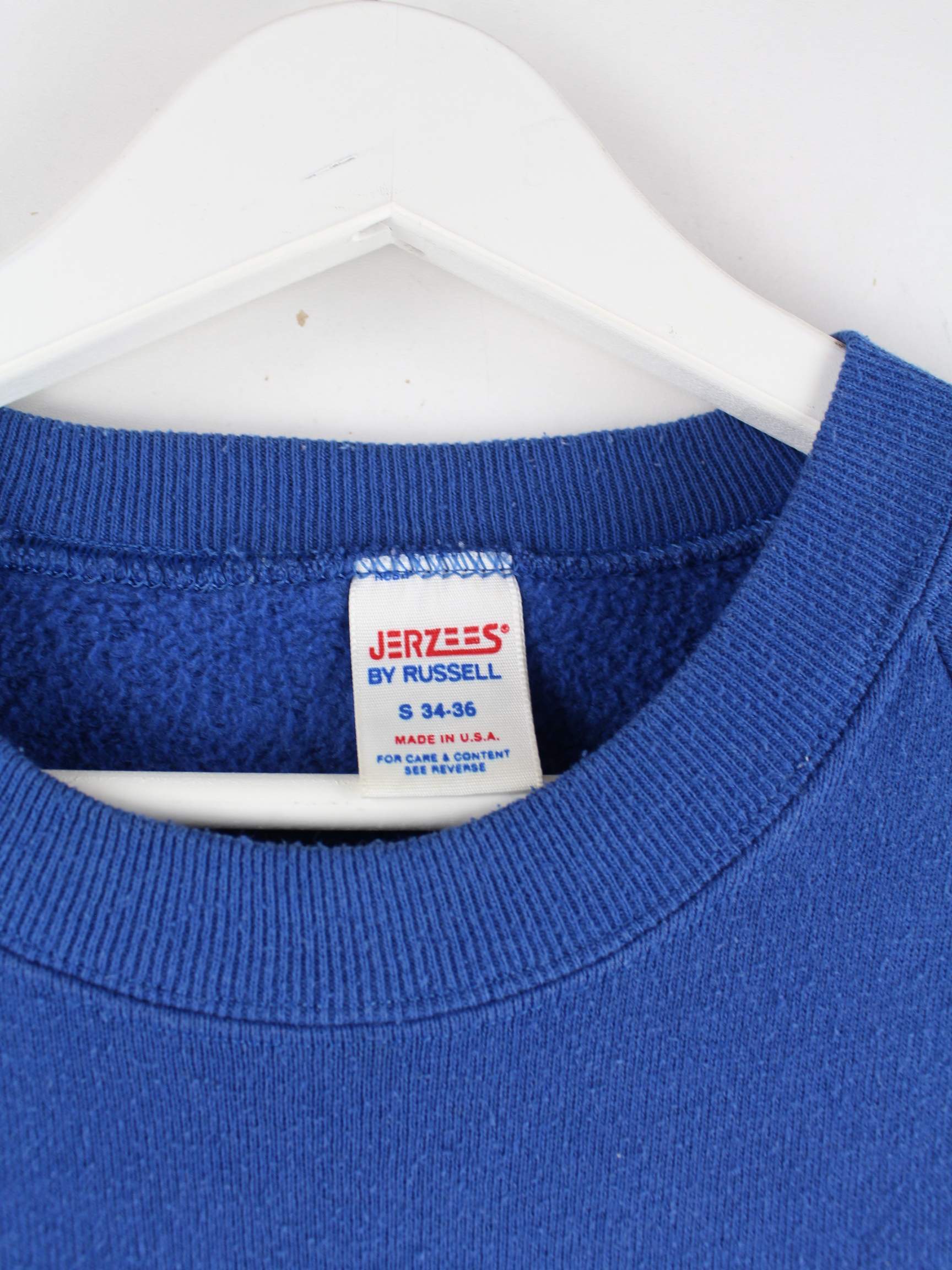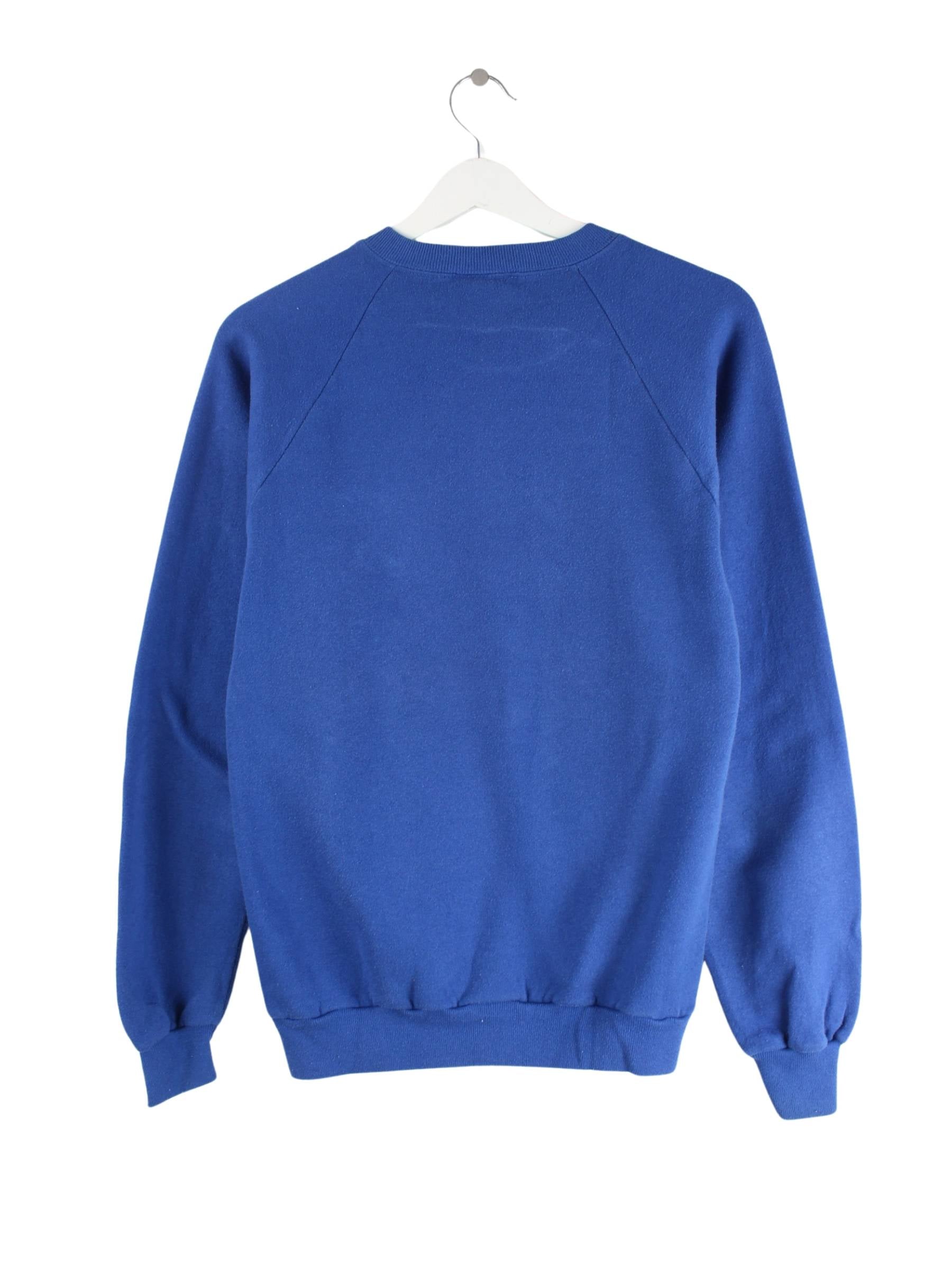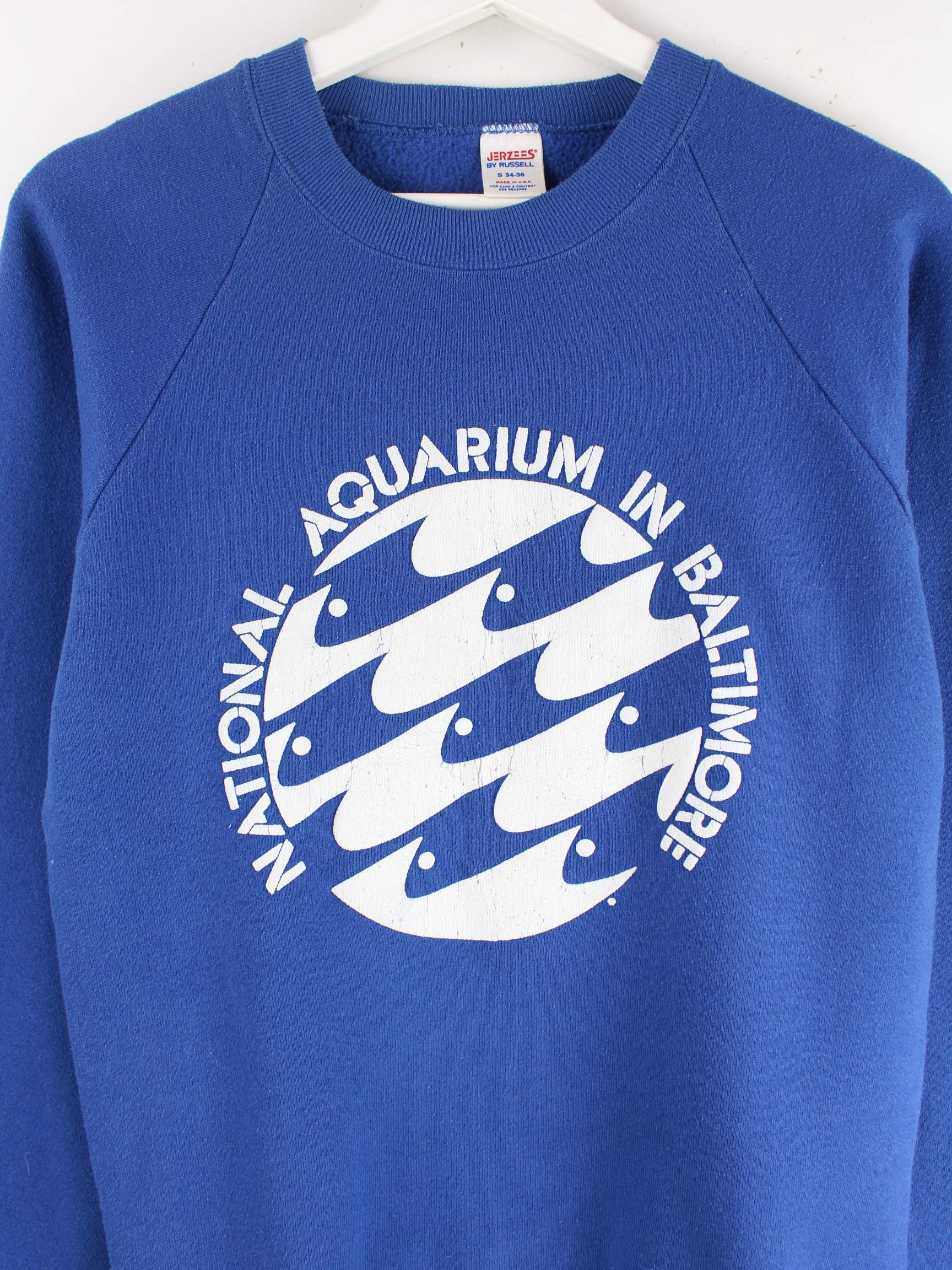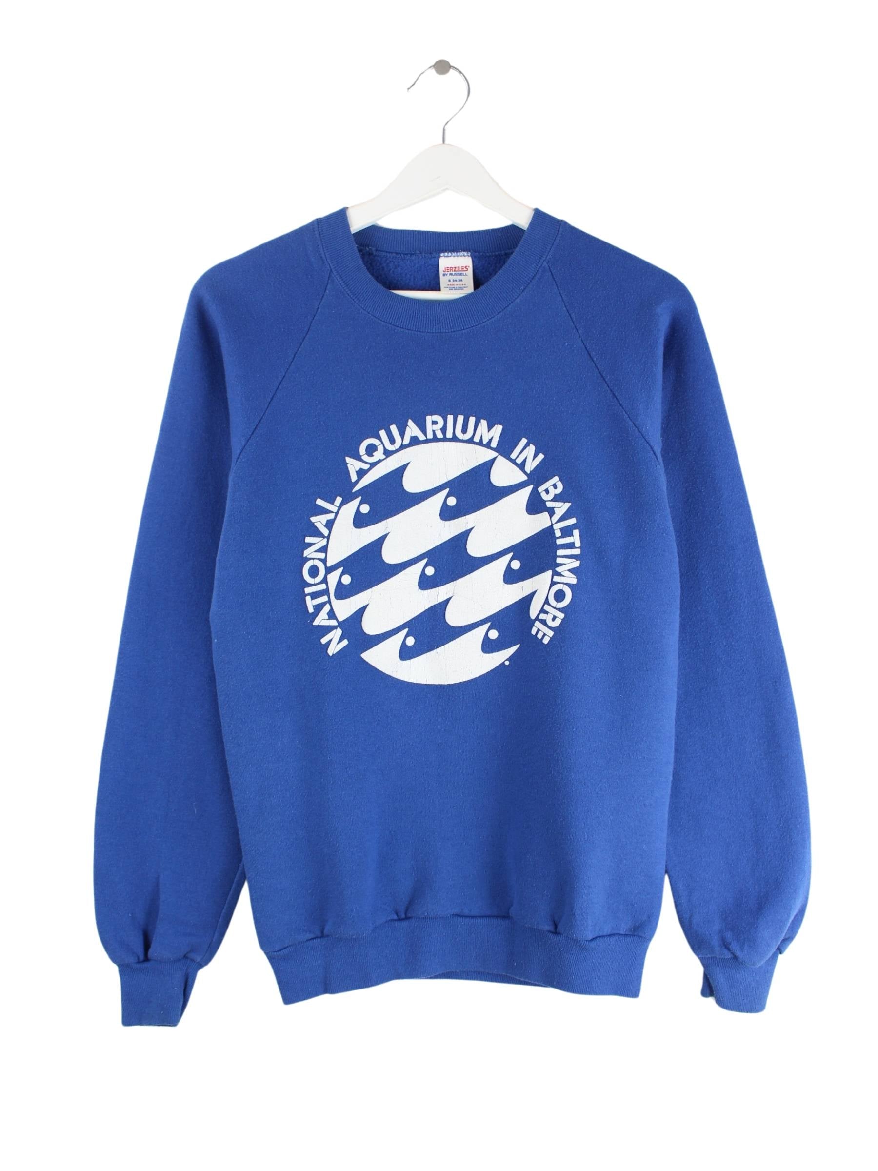Blauer Sweater vom Label Jerzees aus den 90'ern in Größe S. Er ist aus einer Baumwollmischung gemacht und in sehr gutem Zustand im Angebot. Mit schönem Aquarium Print.