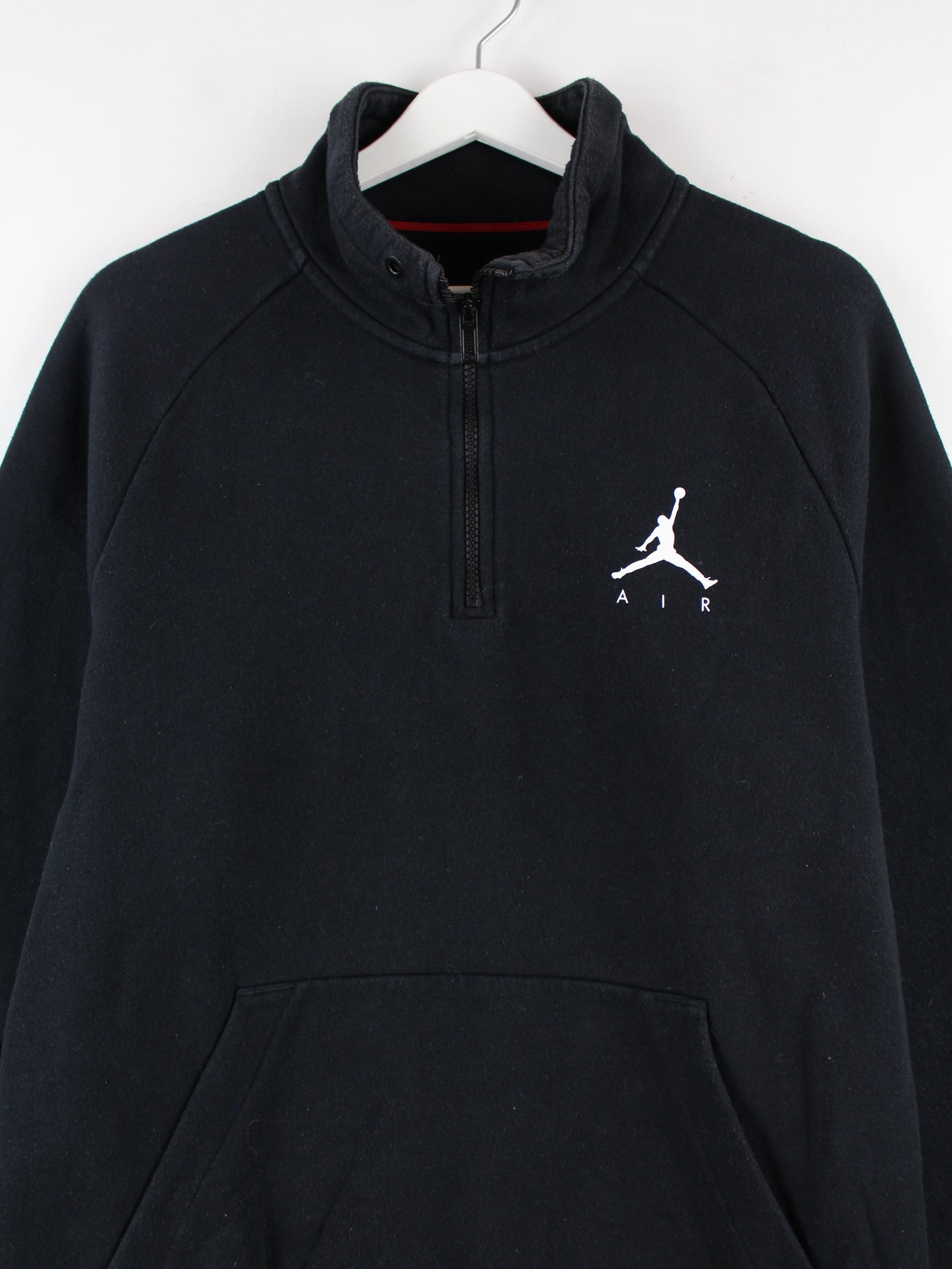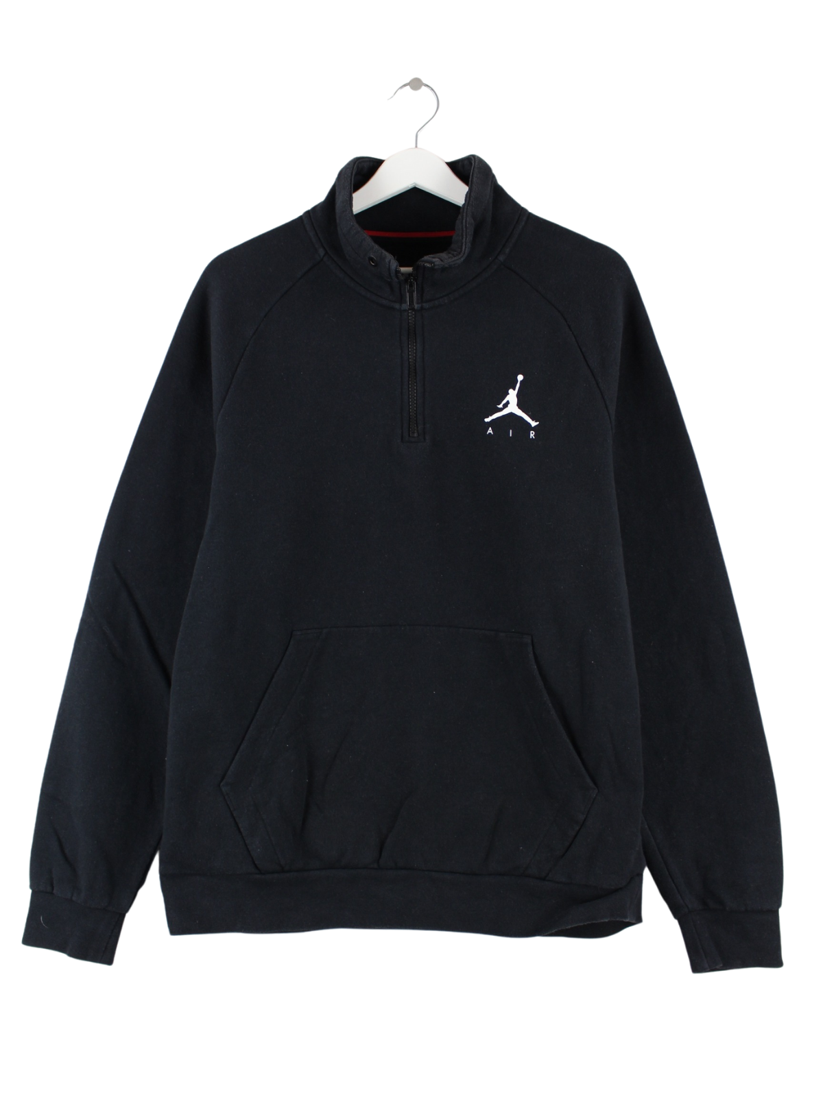 Sweater der Marke Jordan mit halbem Reißverschluß in Größe M. Er ist aus einer Baumwollmischung produziert und in Schwarz zu haben. Mit seltenem Air Print.