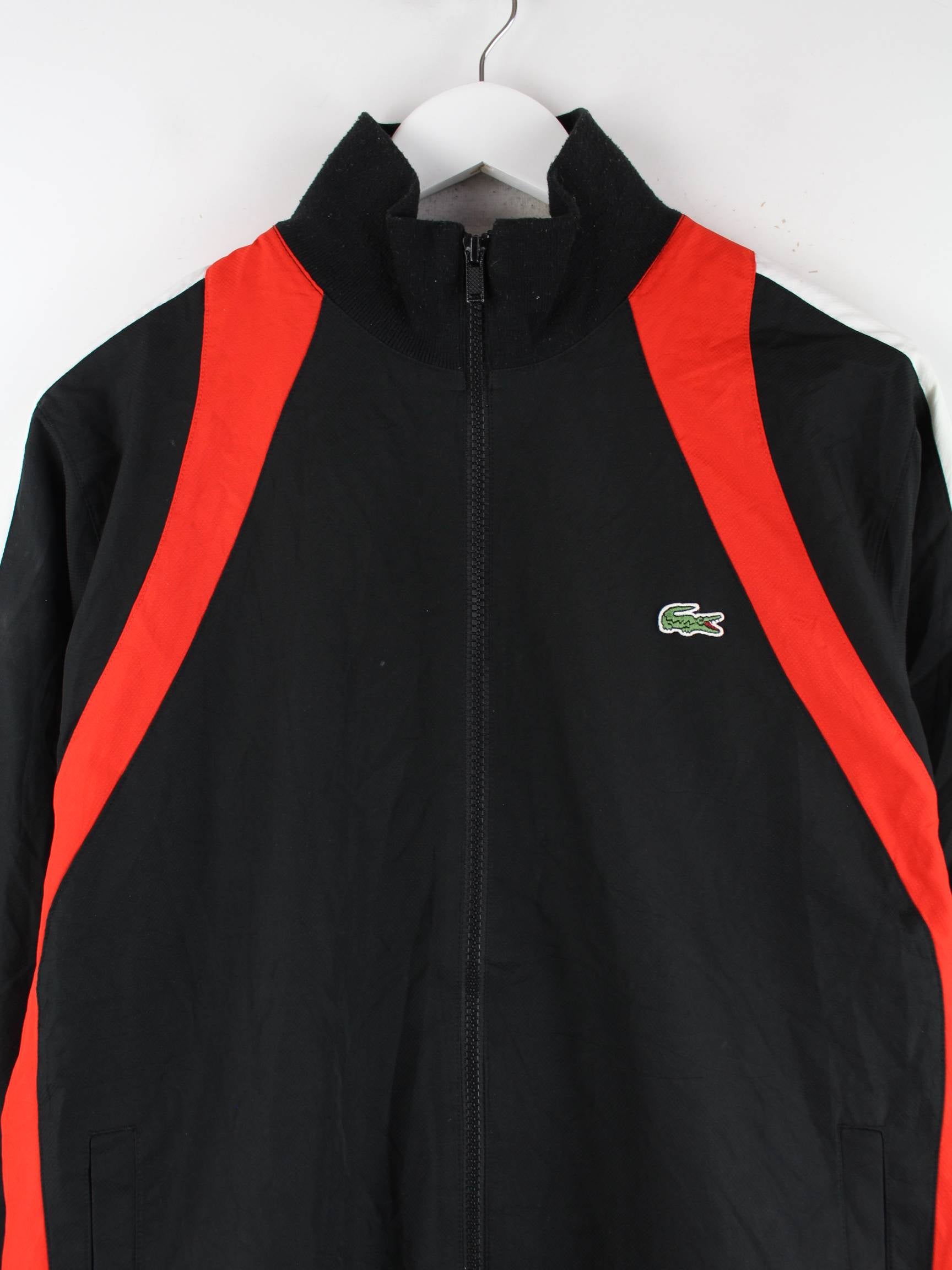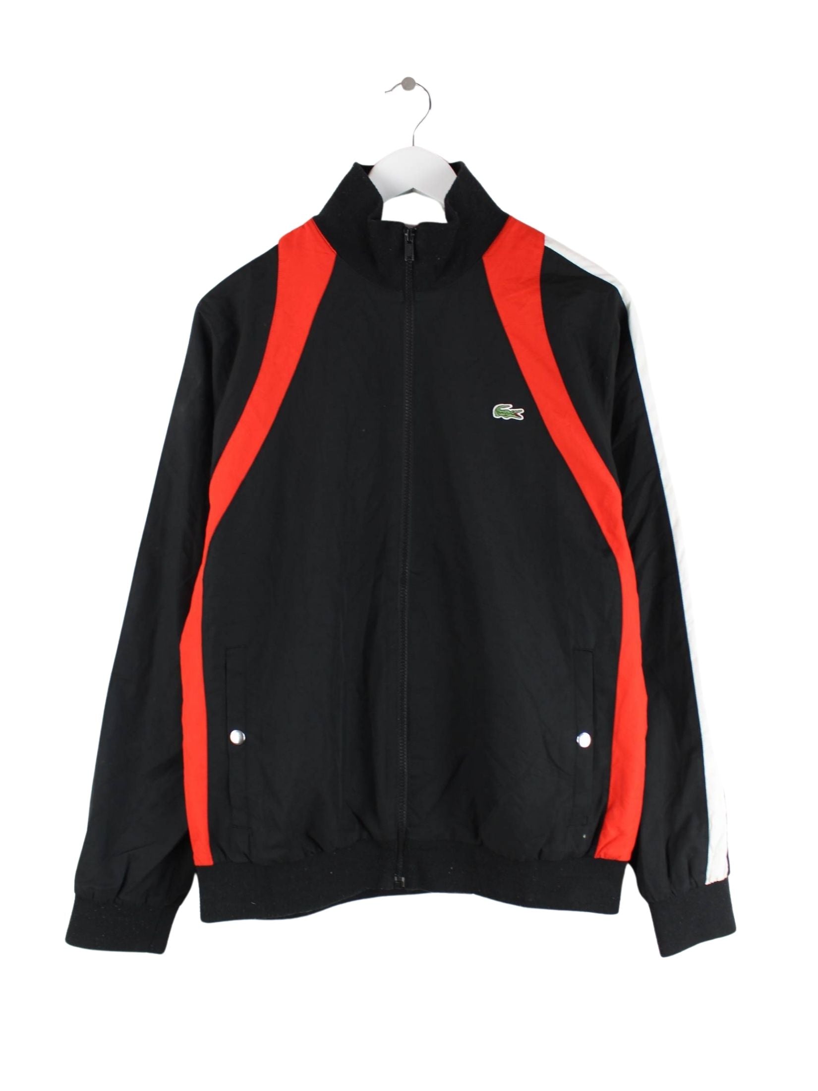 Schwarze Trainingsjacke des Labels Lacoste in Größe L. Sie ist aus Synthetik gemacht und in sehr gutem Zustand in Stock.