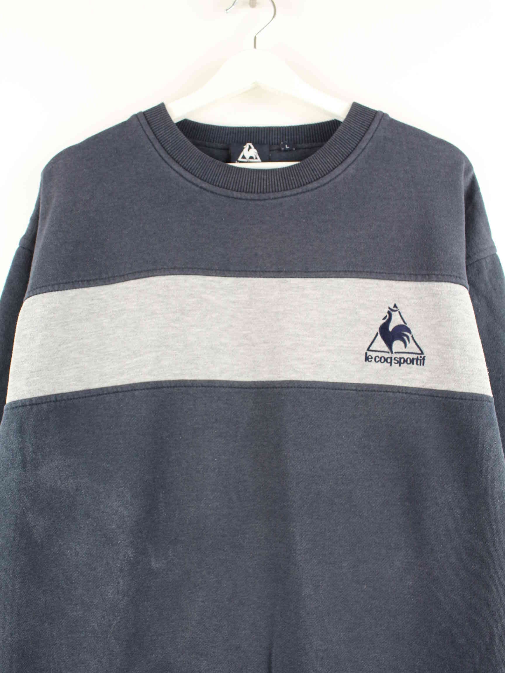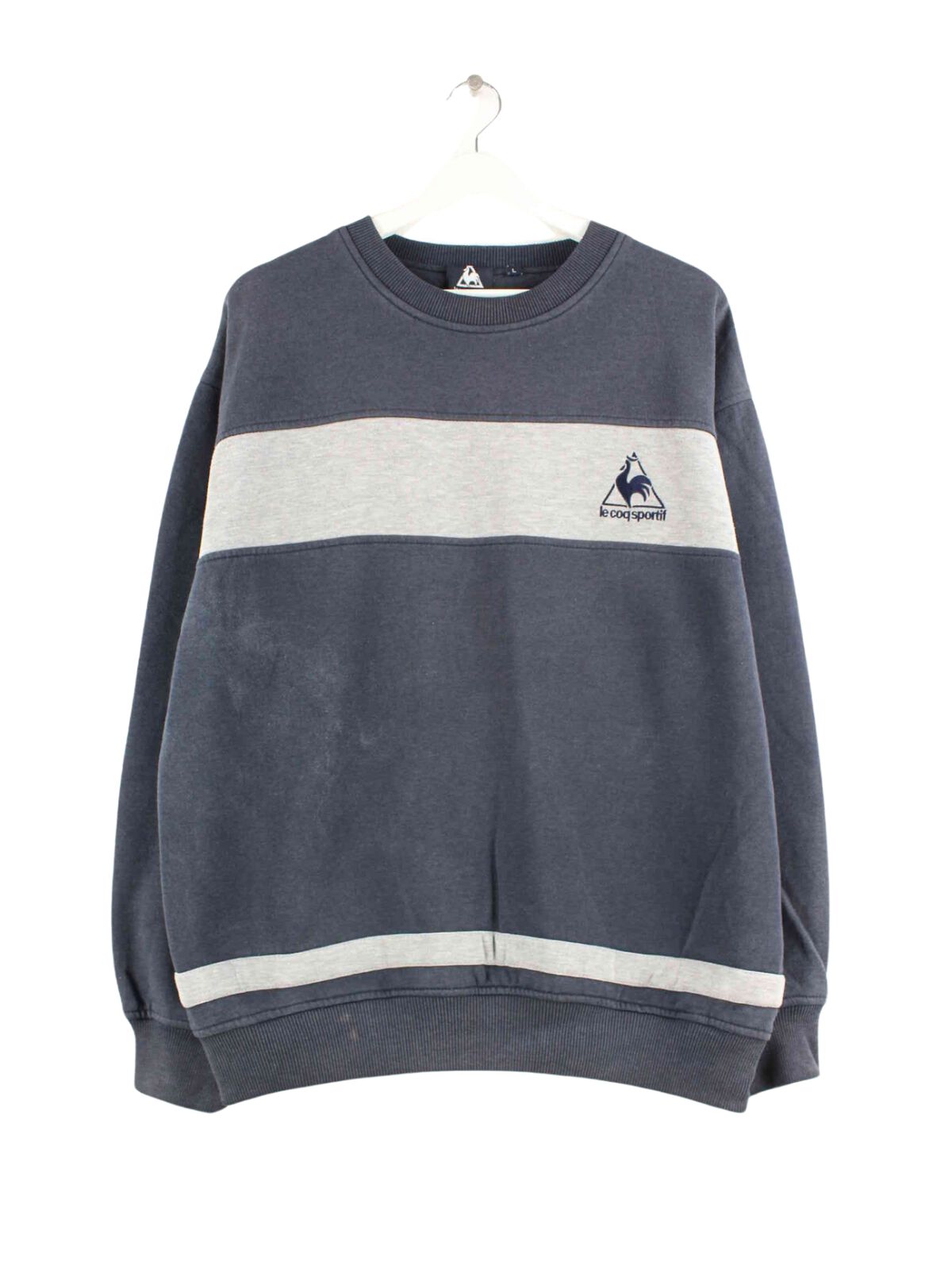 Sweater aus dem Hause Le Coq Sportif mit gestickten Motiven in Größe L. Er ist aus einer Baumwollmischung gemacht und in Blau zu haben.