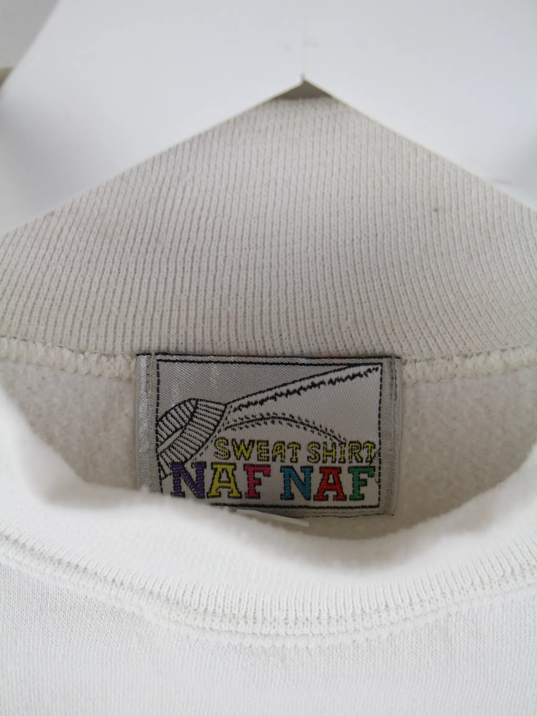 Sweater der Brand Naf Naf in Größe S aus den 90'ern. Er ist aus einer Baumwollmischung und in Weiß zu haben.