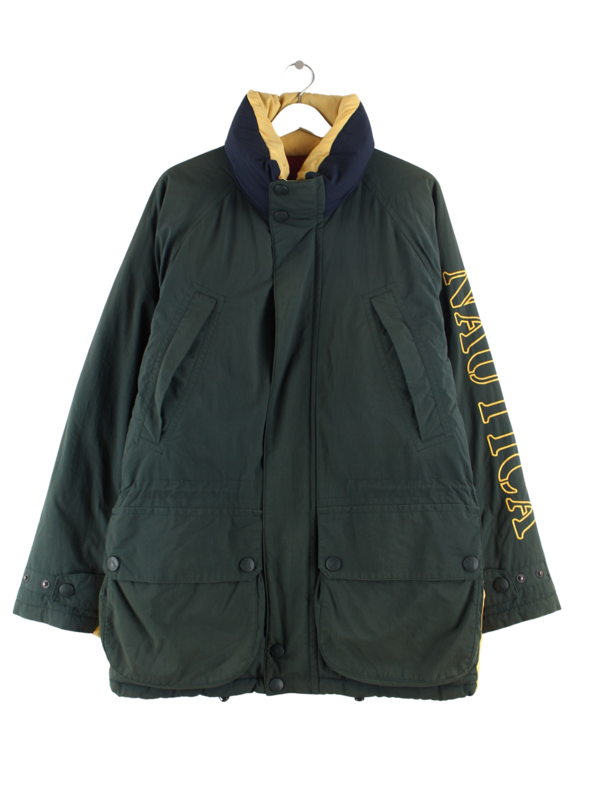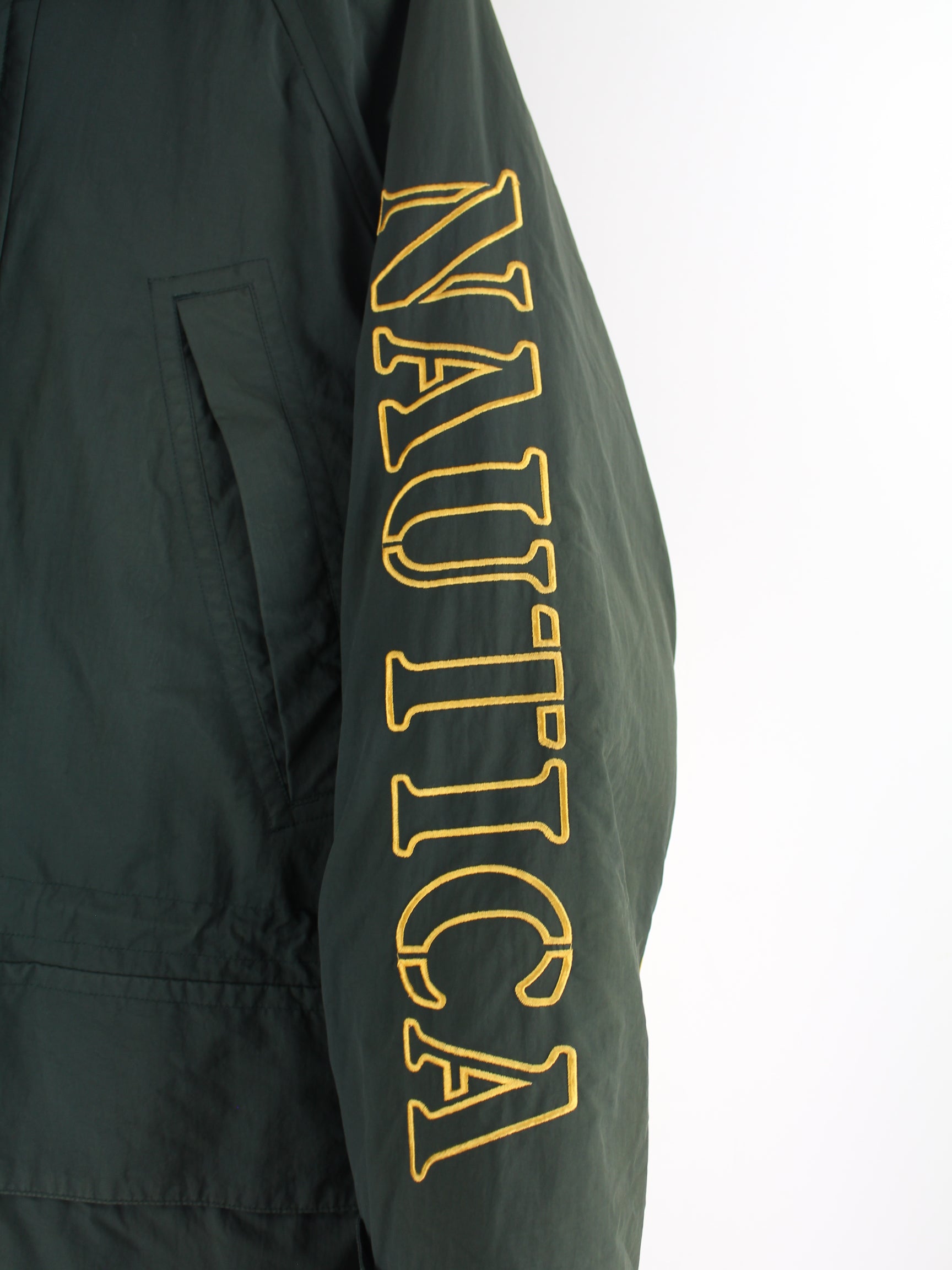 Grüne Jacke mit Stickereien vom Brand Nautica aus den 90'ern in Größe M. Sie ist aus Synthetik produziert und in gutem Zustand zu haben.