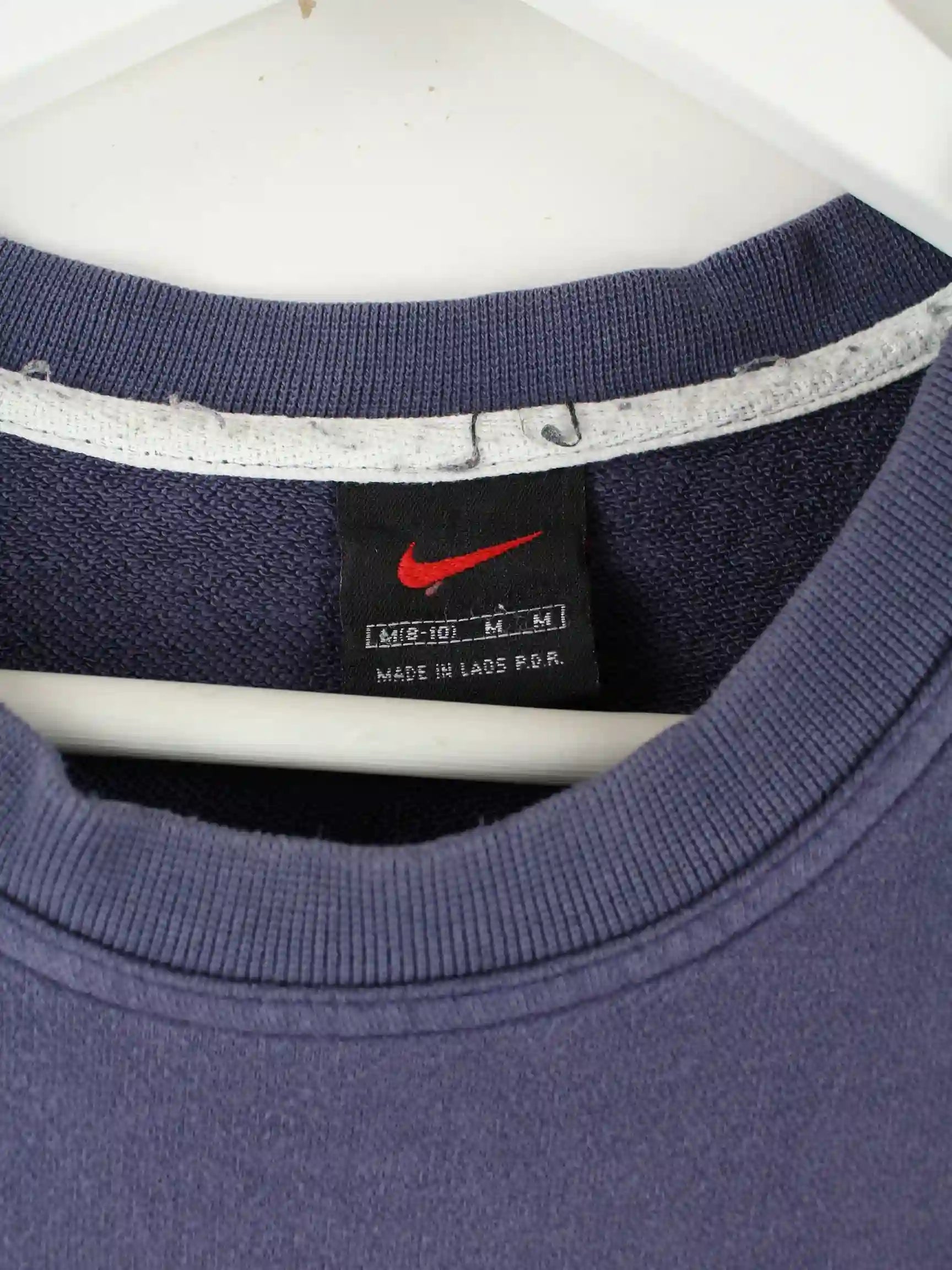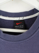 Blauer Sweater mit Stickereien vom Label Nike in Größe M. Er ist aus einer Baumwollmischung hergestellt und in gutem Zustand im Bestand.