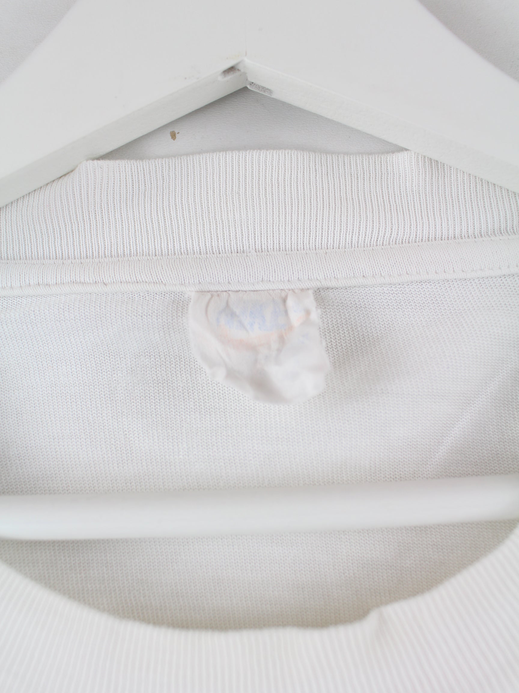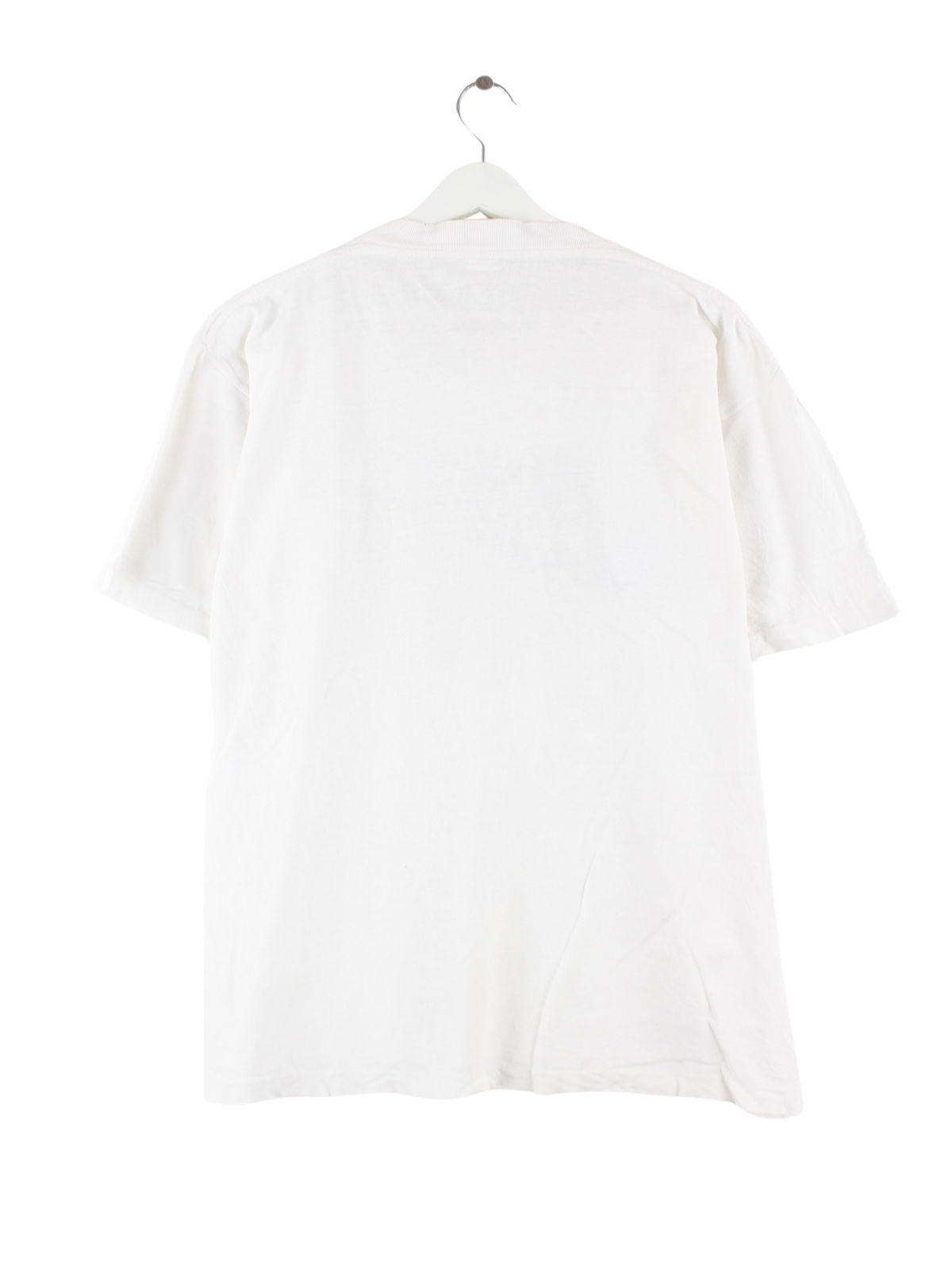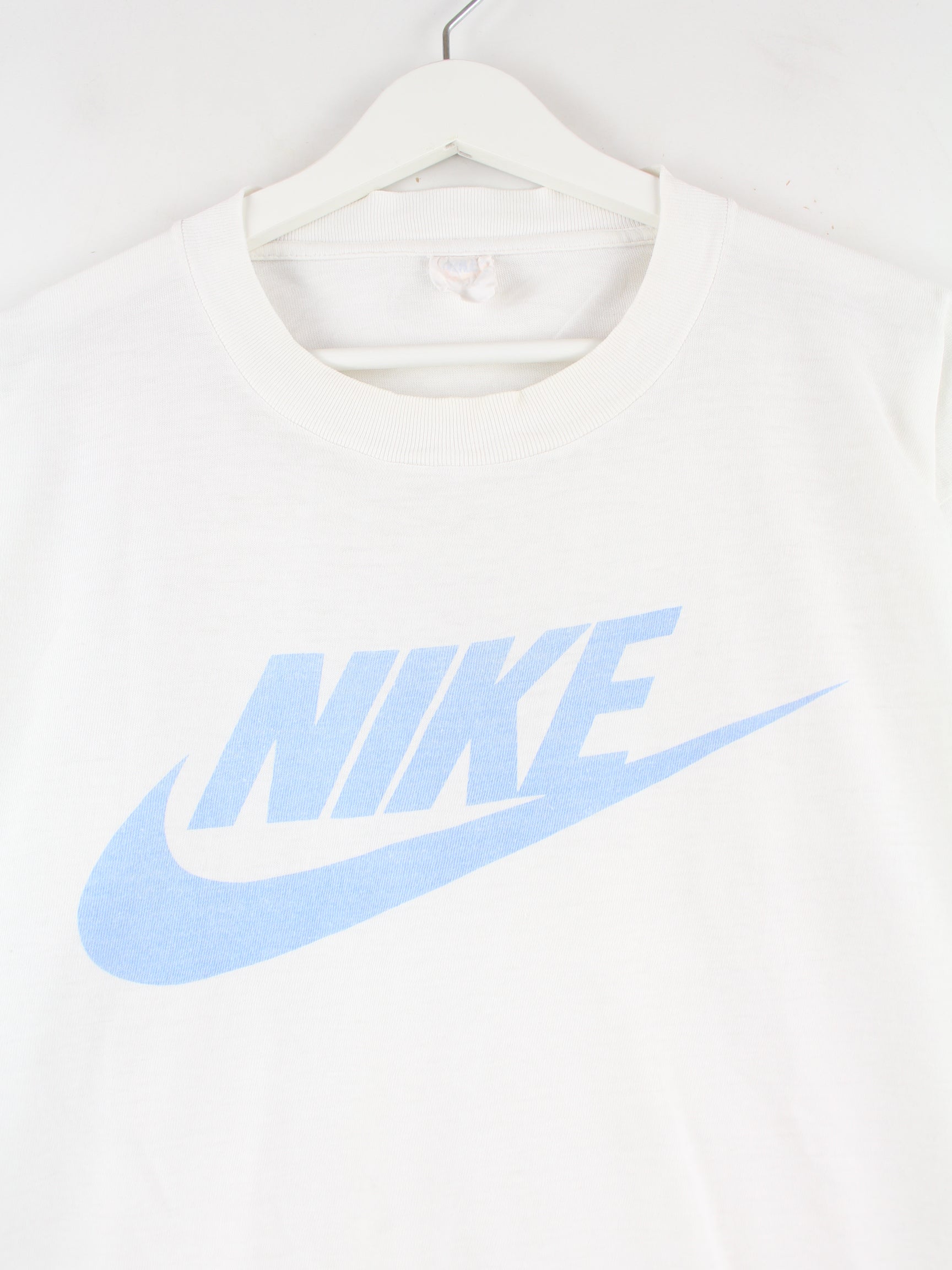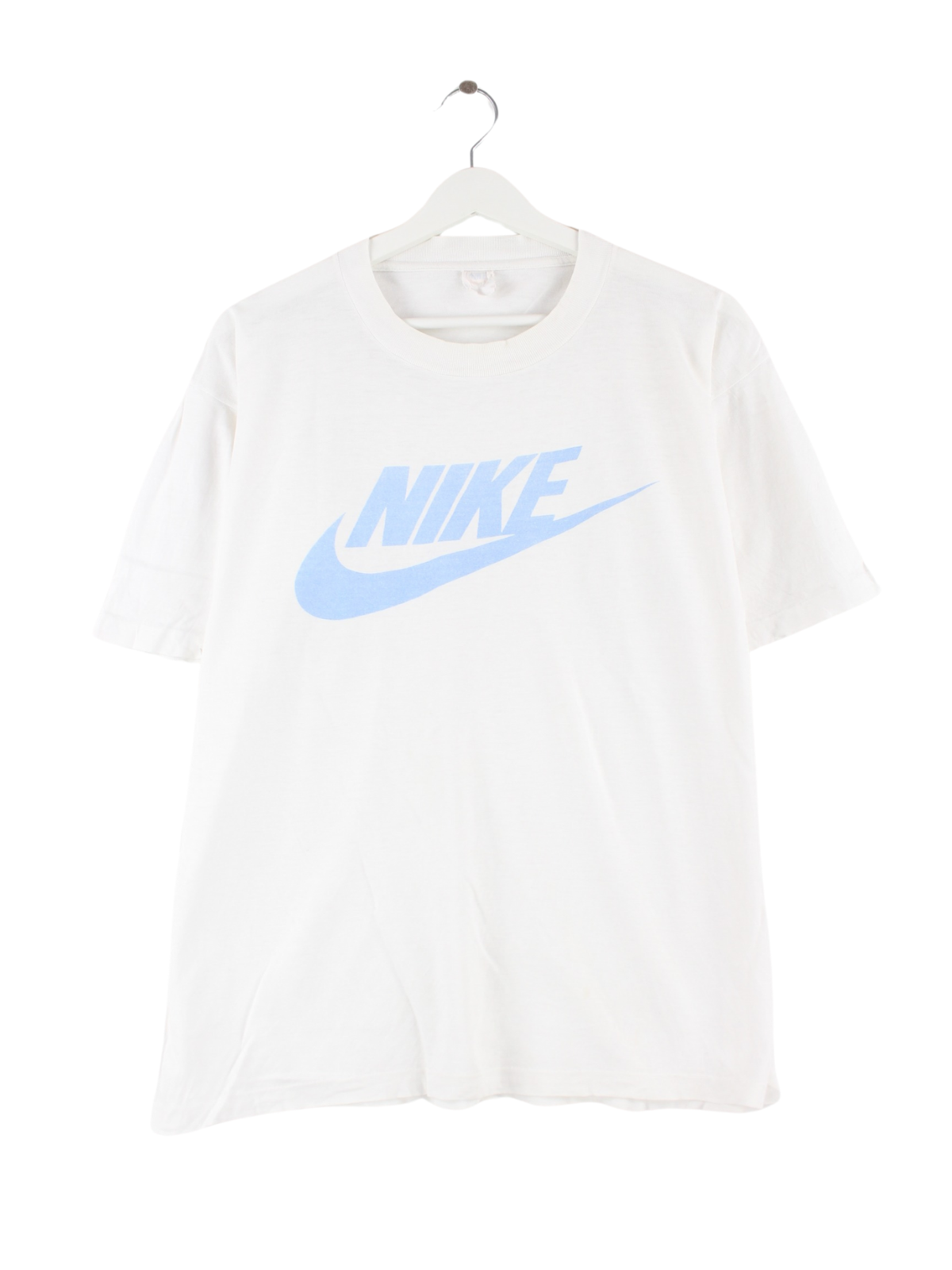 Weißes T-Shirt der Marke Nike aus den 70'ern in Größe S. Es ist aus einer Baumwollmischung und in gutem Zustand lieferbar. Mit schickem Vintage Print.