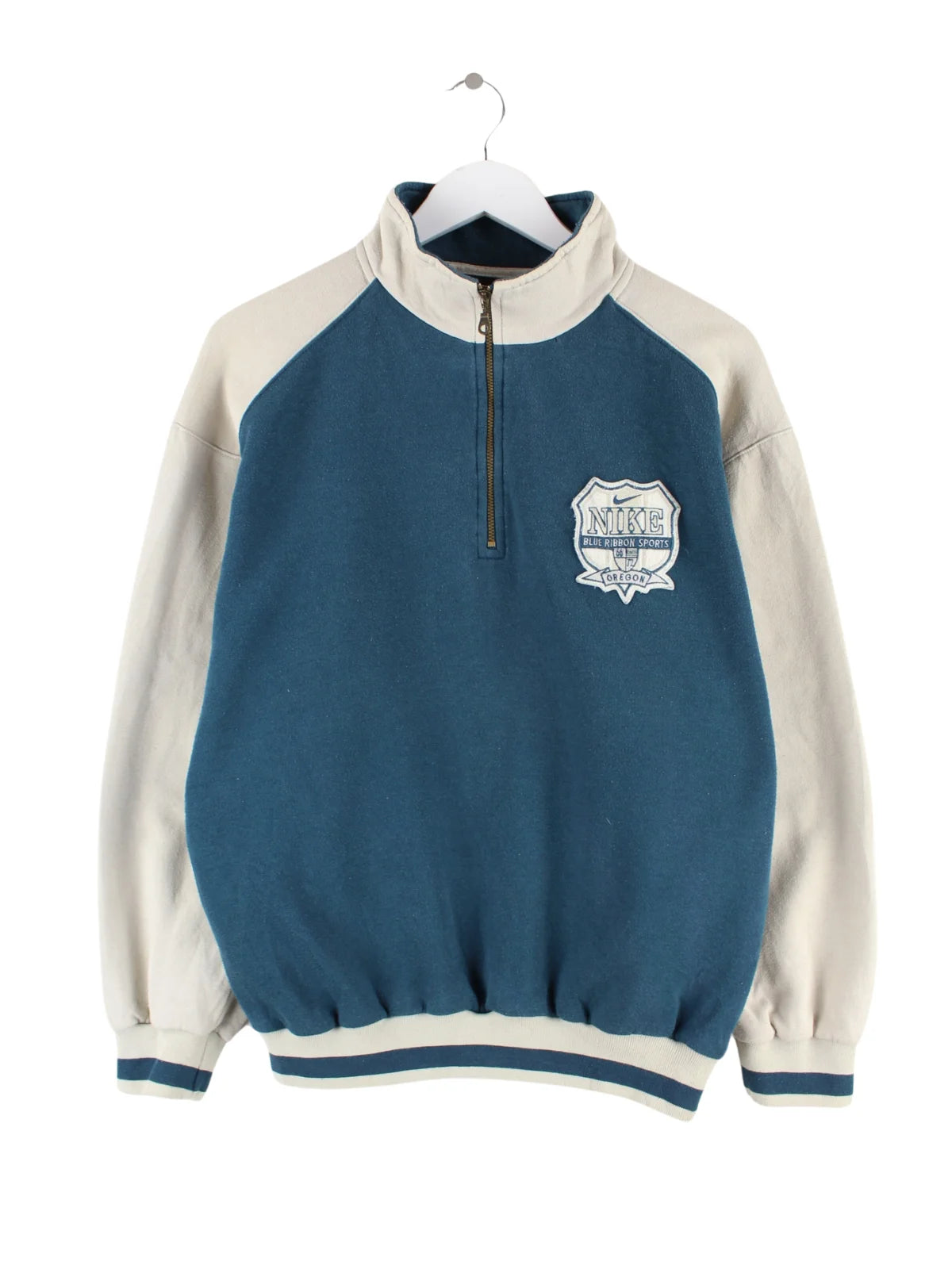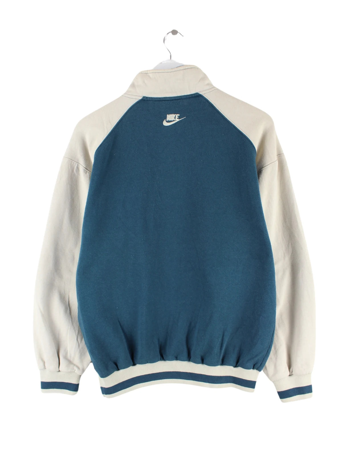 Grüner Sweater mit half Zip des Labels Nike aus den 90'ern in Größe S. Er ist aus einer Baumwollmischung produziert und in sehr gutem Zustand lieferbar.