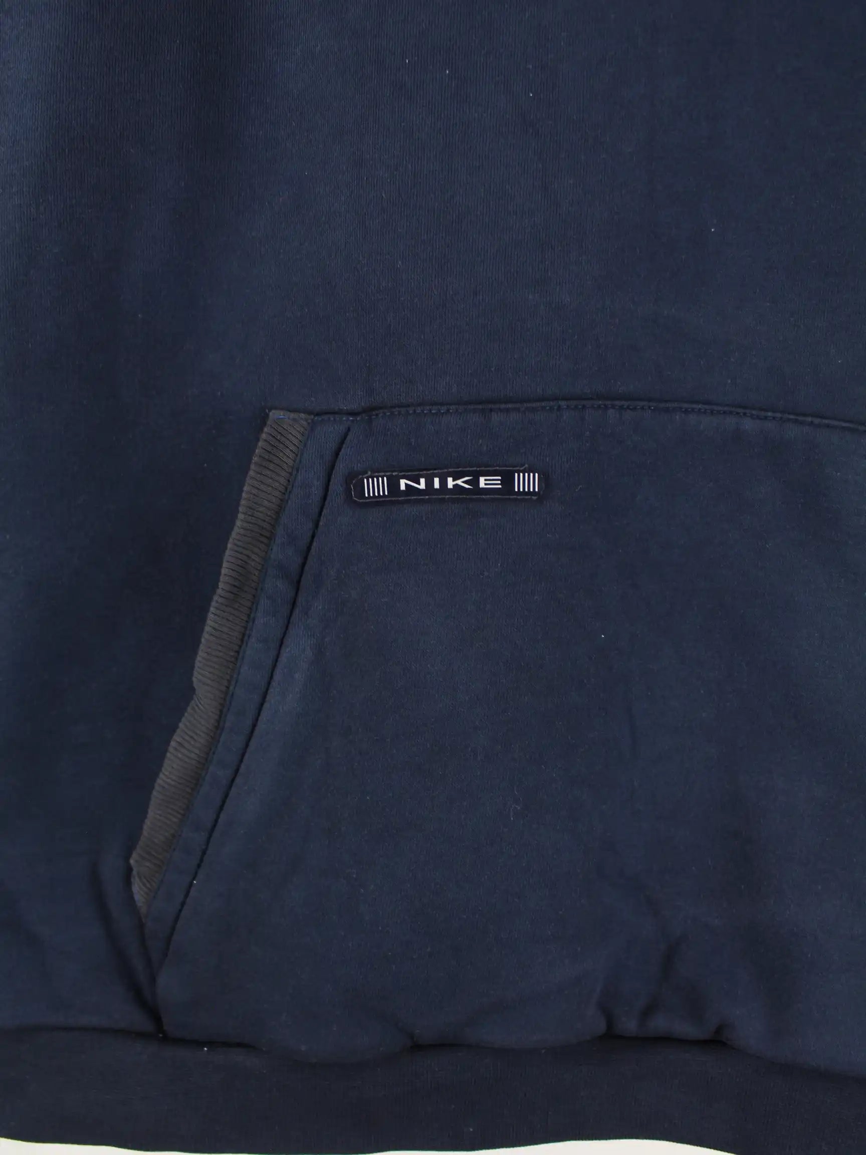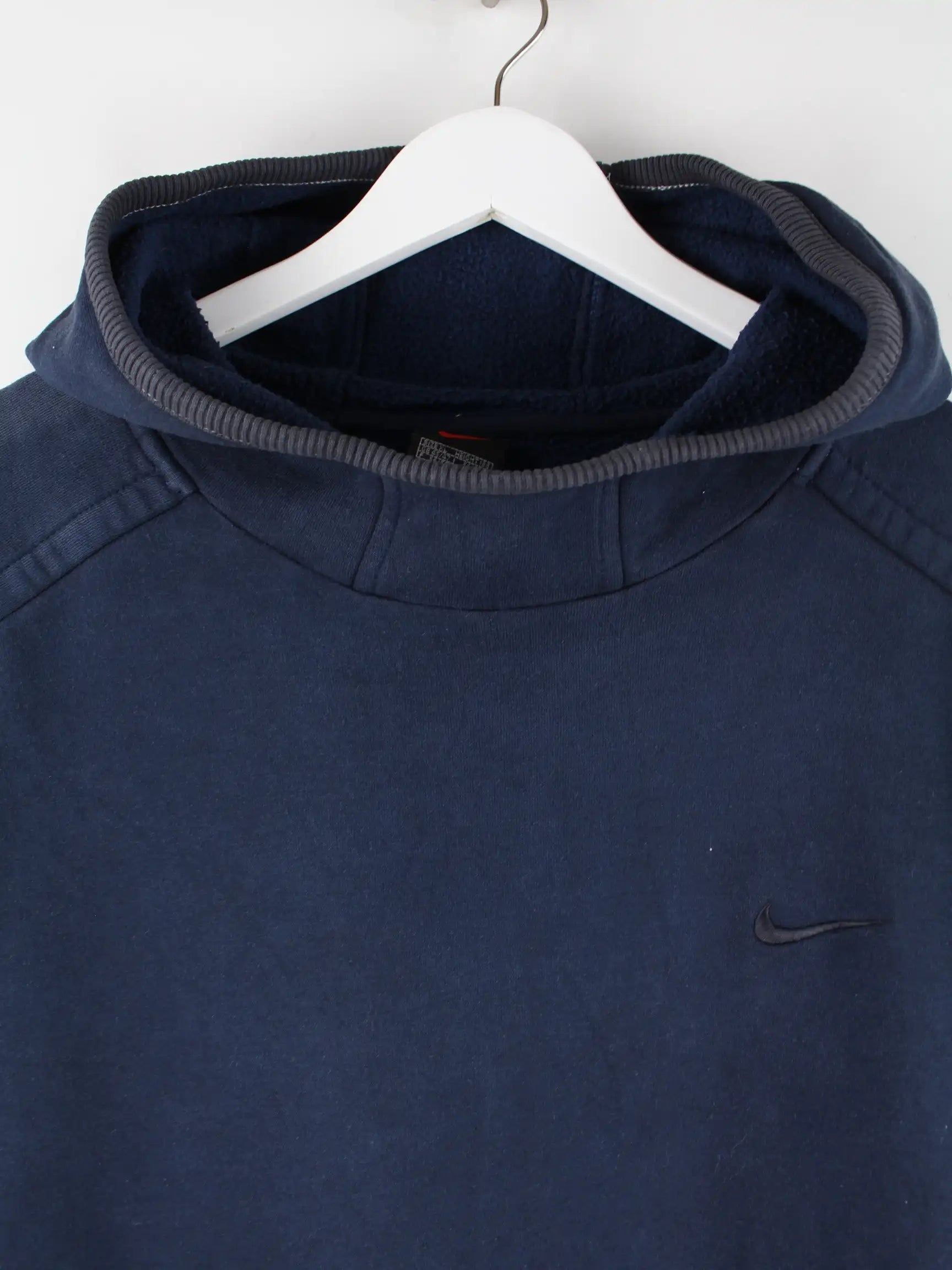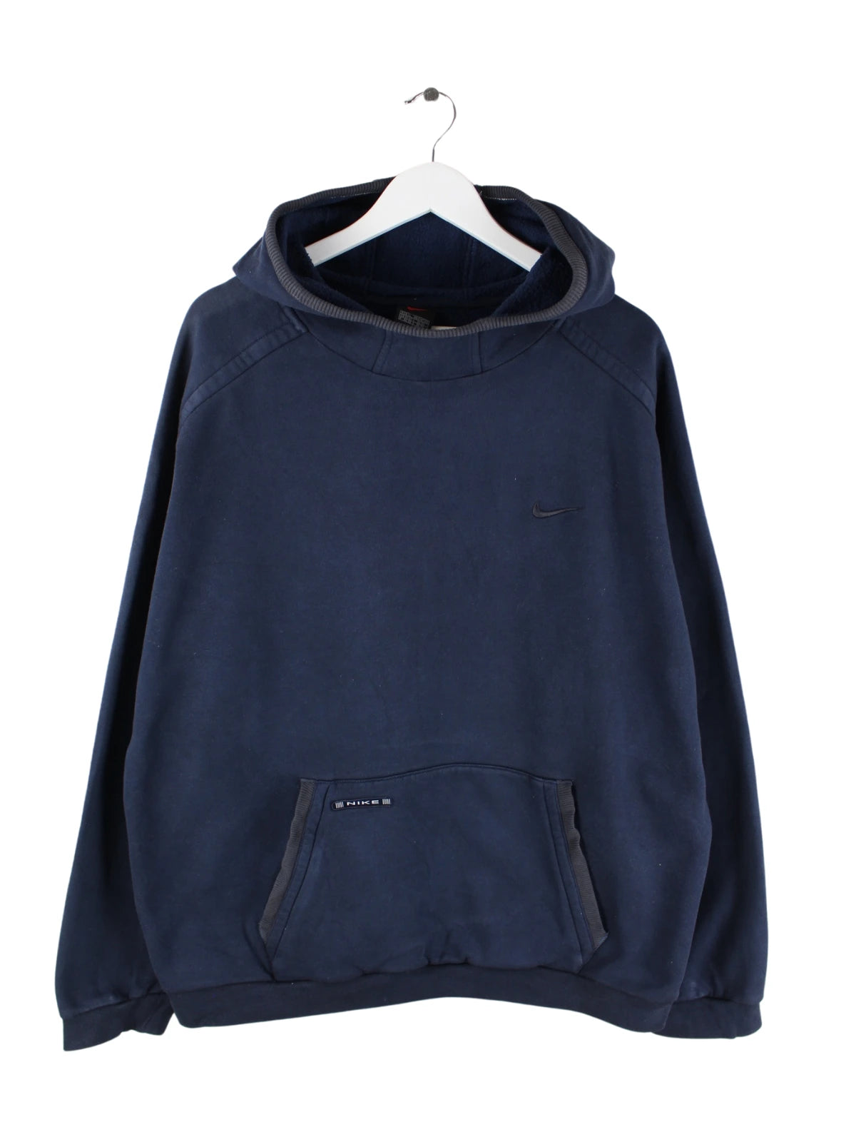 Vintage 90s Basic Hoodie vom Label Nike in Größe XL. Er ist aus einer Baumwollmischung produziert und in Blau bei uns vorrätig.