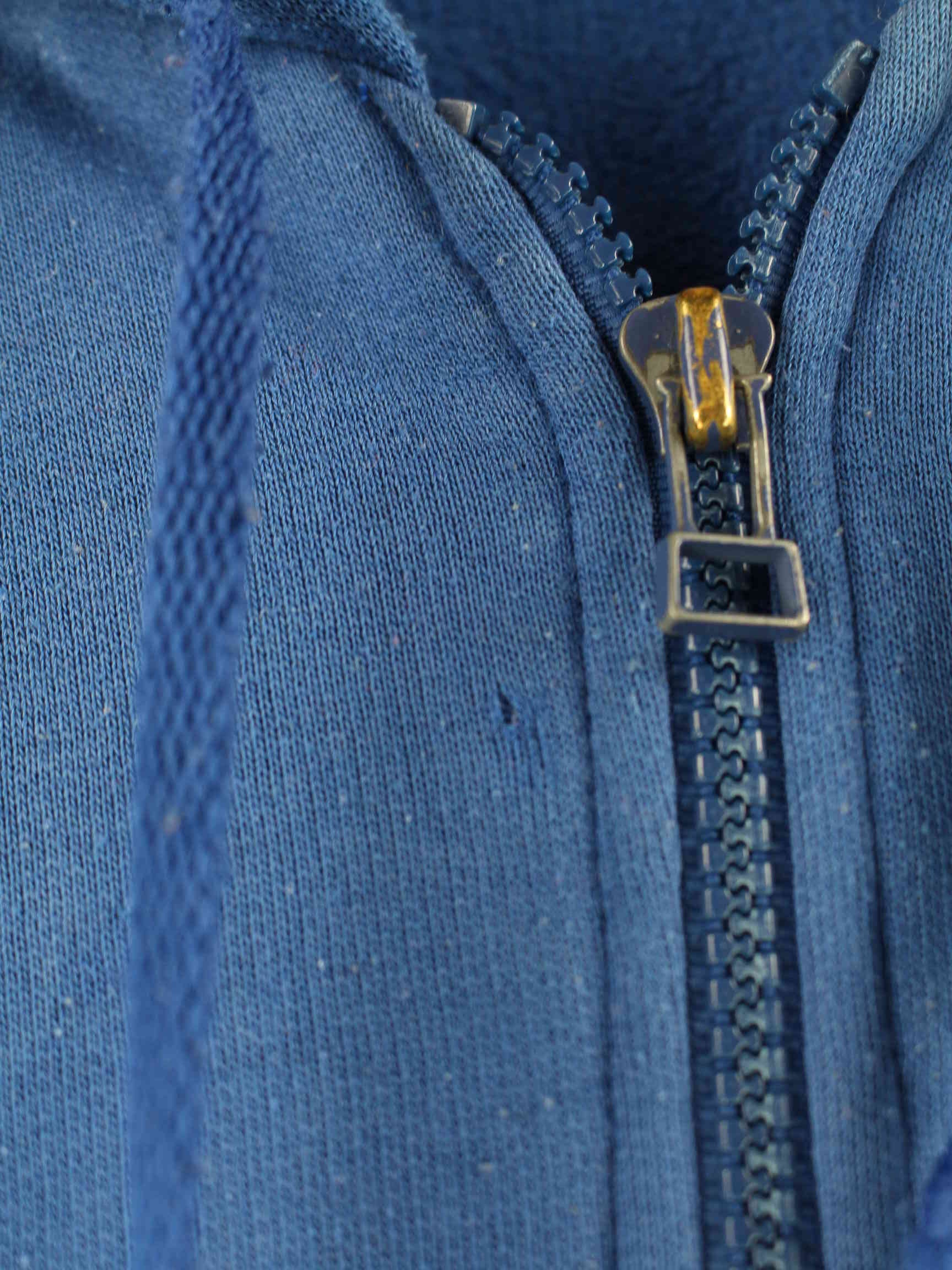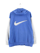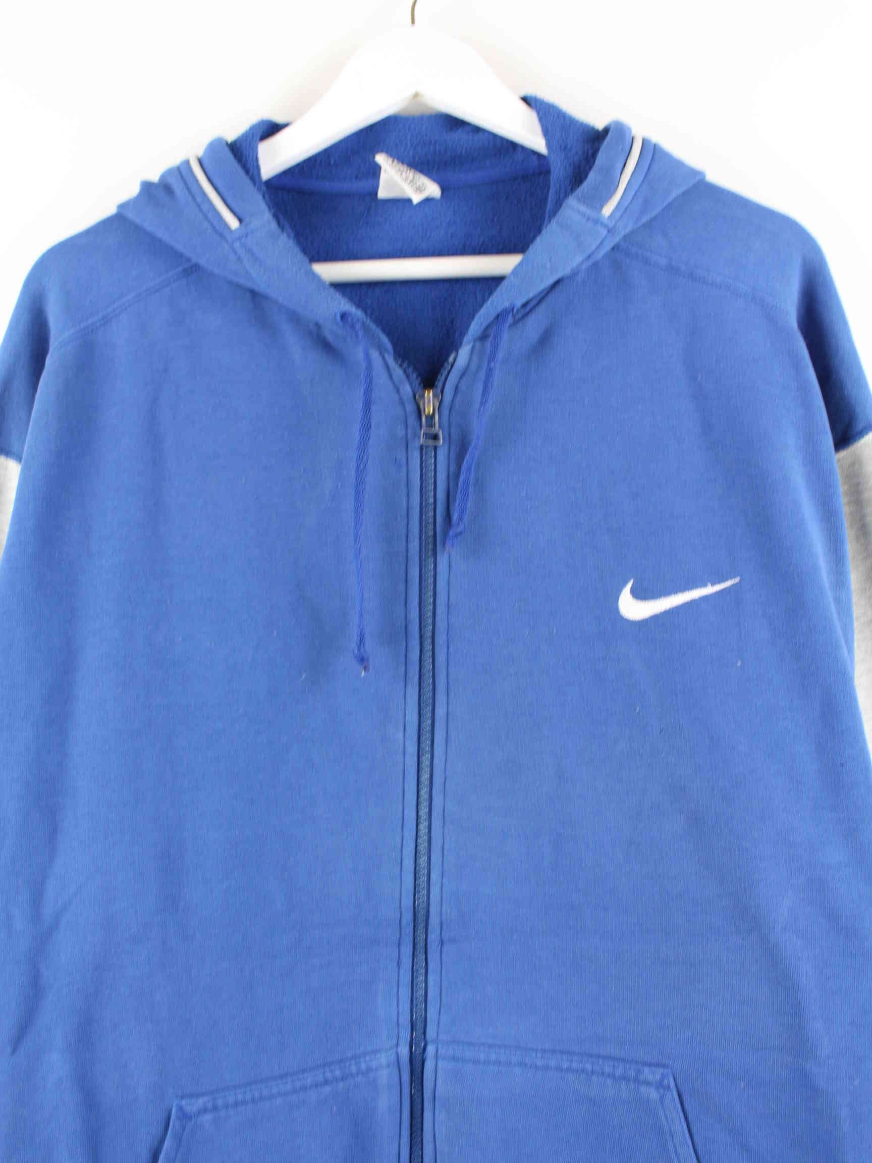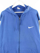 Blauer Hoodie mit Zip aus dem Hause Nike aus den 90'ern in Größe L. Er ist aus einer Baumwollmischung gefertigt und in gutem Zustand bei uns vorrätig.