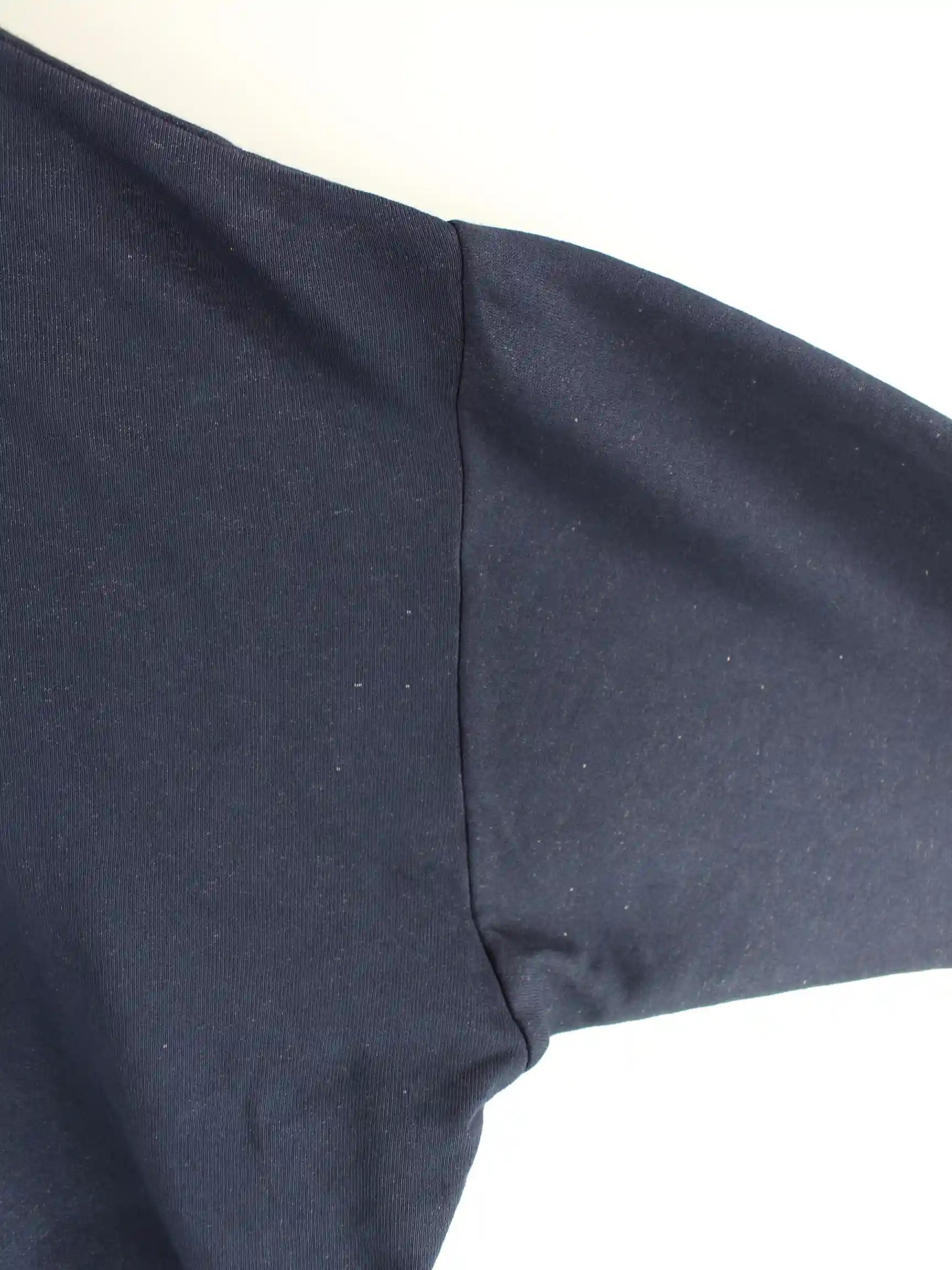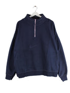 Blauer Sweater mit halbem Reißverschluß des Labels Nike in Größe L. Er ist aus einer Baumwollmischung hergestellt. Den Zustand würden wir als 'In Ordnung' bezeichnen (vergl. Bilder).