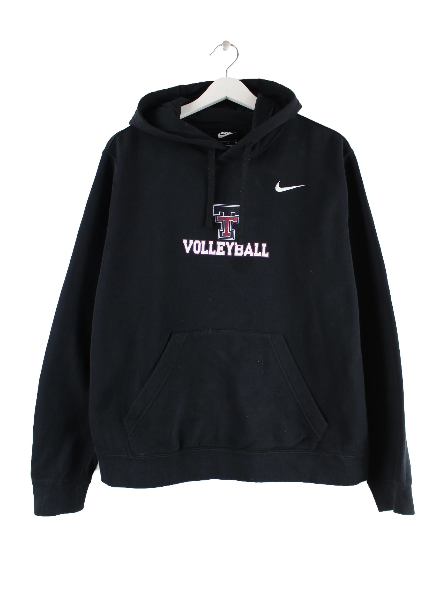 Schwarzer Hoodie der Marke Nike in Größe XL. Er ist aus einer Baumwollmischung . Den Zustand würden wir als 'In Ordnung' bezeichnen (vergl. Bilder).Mit tollem Volleyball Print.