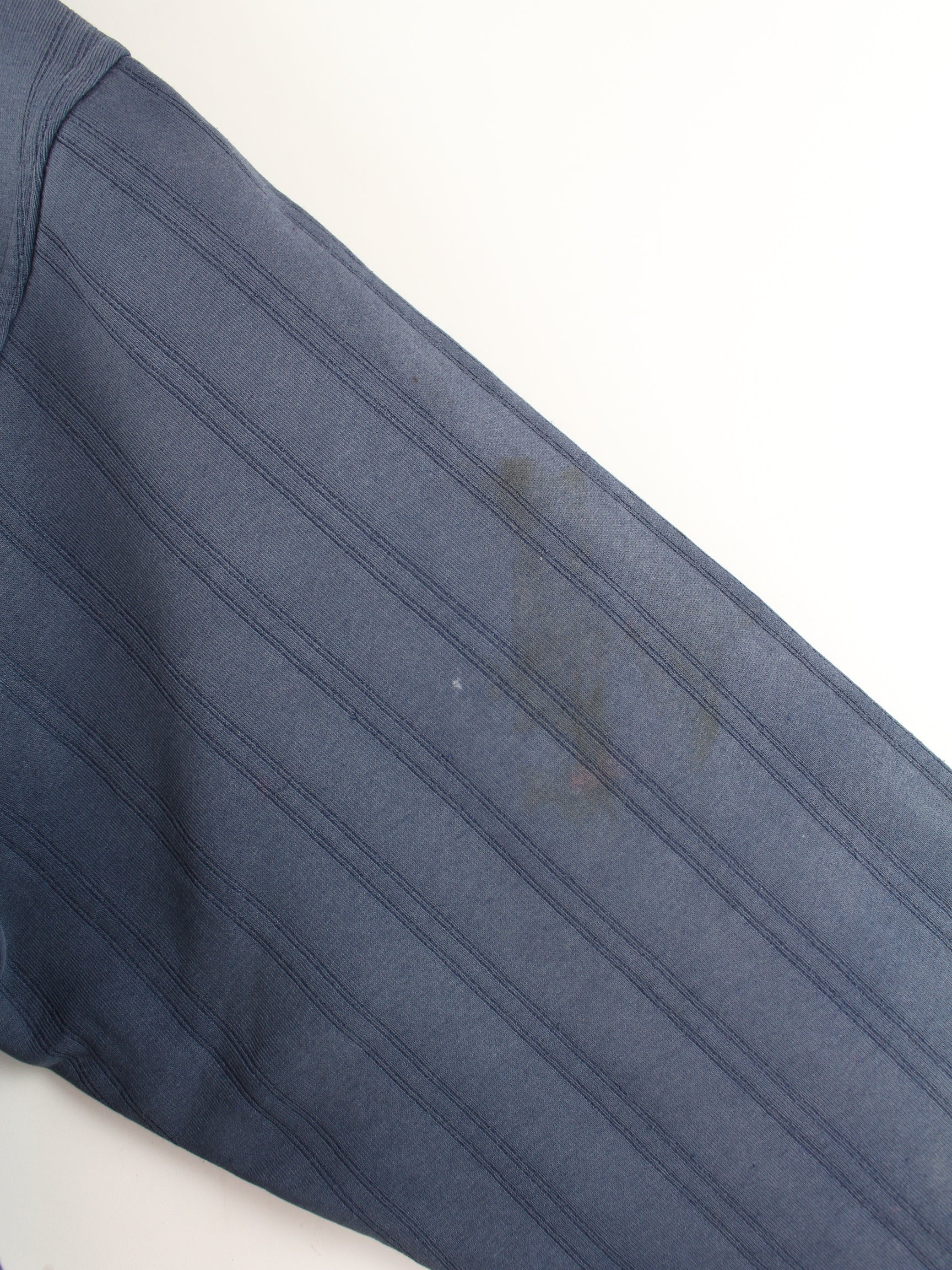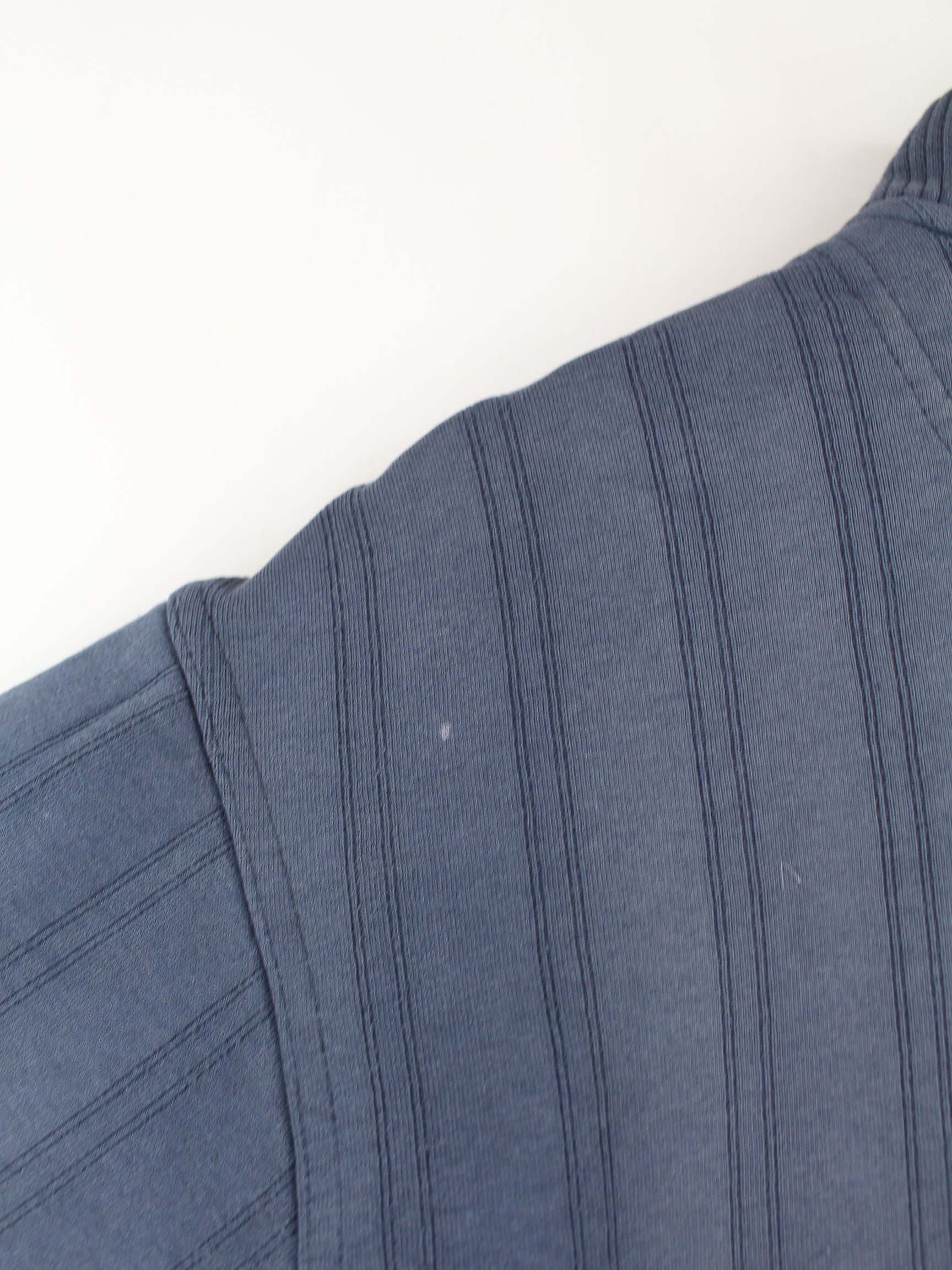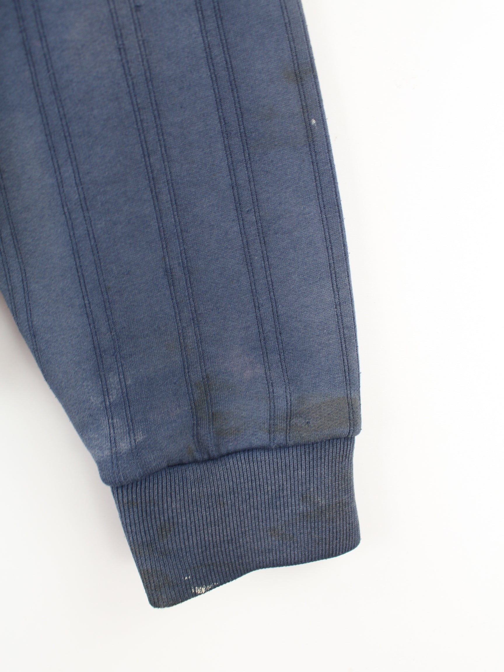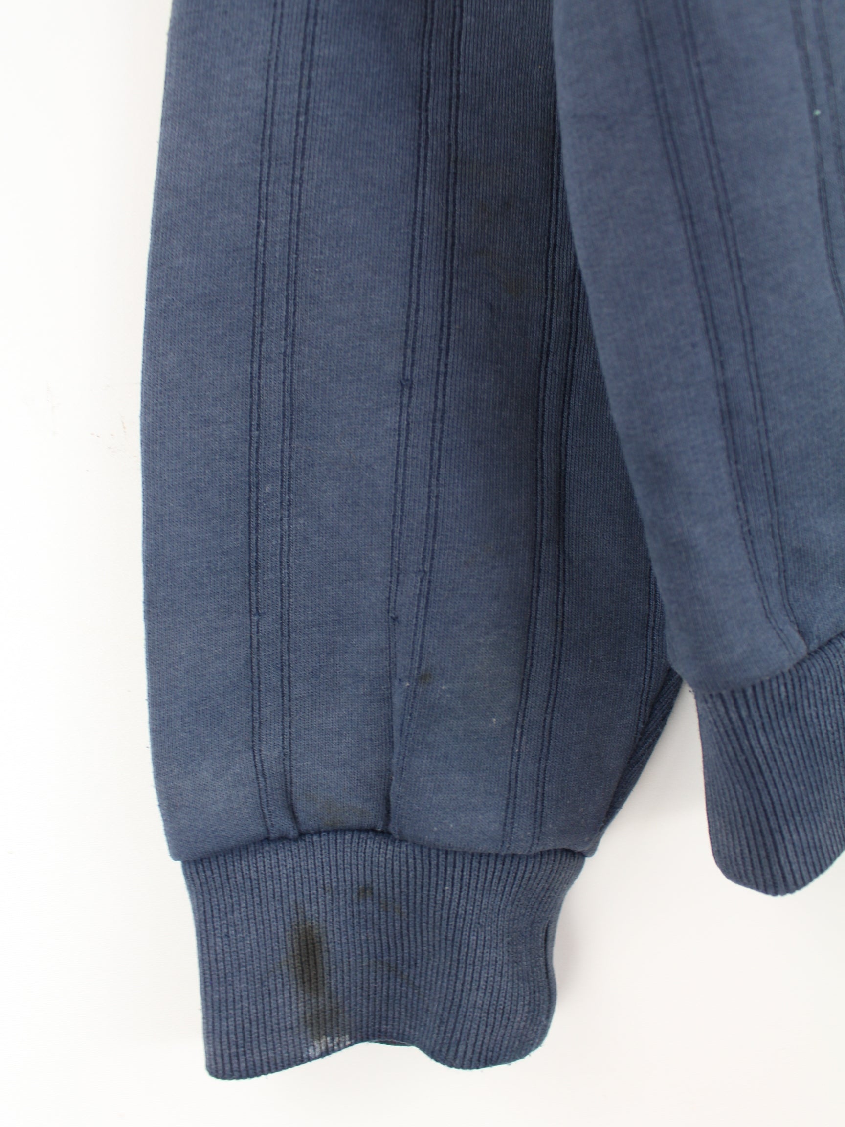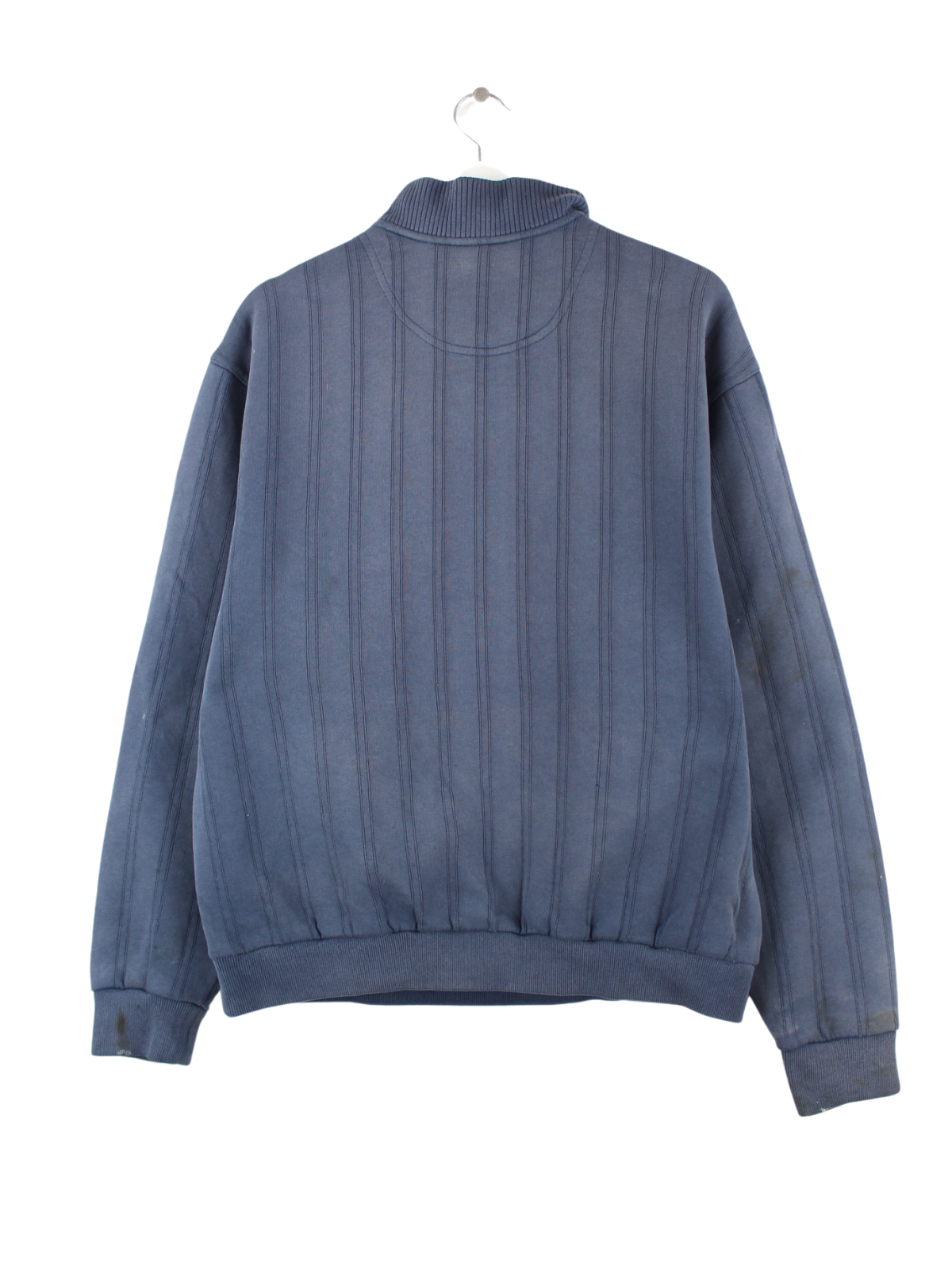 Blauer Sweater mit gesticktem Logo und kurzem Reißverschluß der Marke Nike in Größe M. Er ist aus Baumwolle angefertigt. Den Zustand würden wir als 'In Ordnung' bezeichnen (vergl. Bilder).