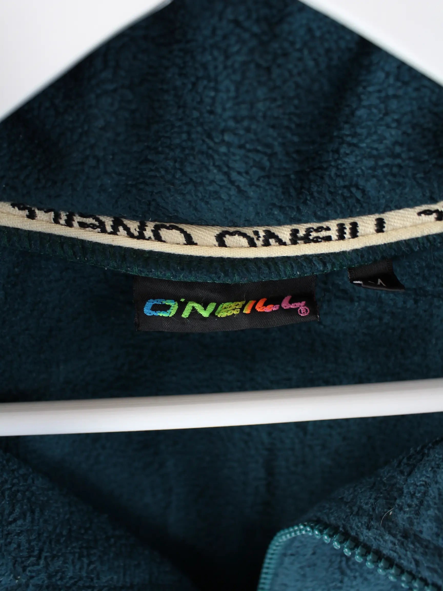 Leichte Jacke des Labels O'Neill mit halbem Reißverschluß in Größe M aus den 90'ern. Sie ist aus angenehmem Fleece hergestellt und in Grün bei uns vorrätig.