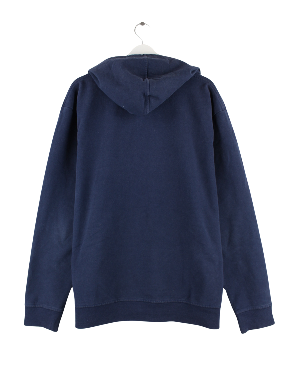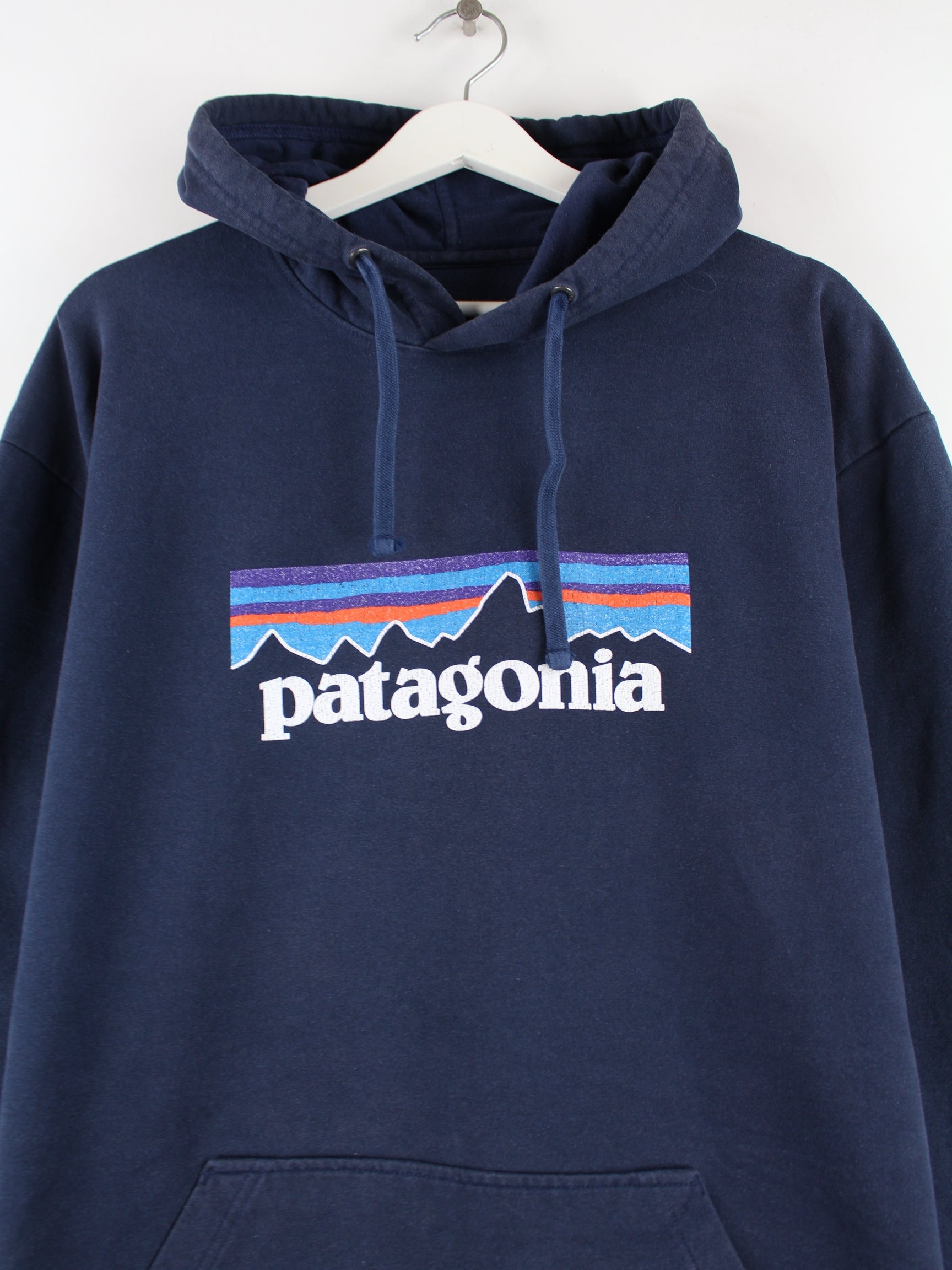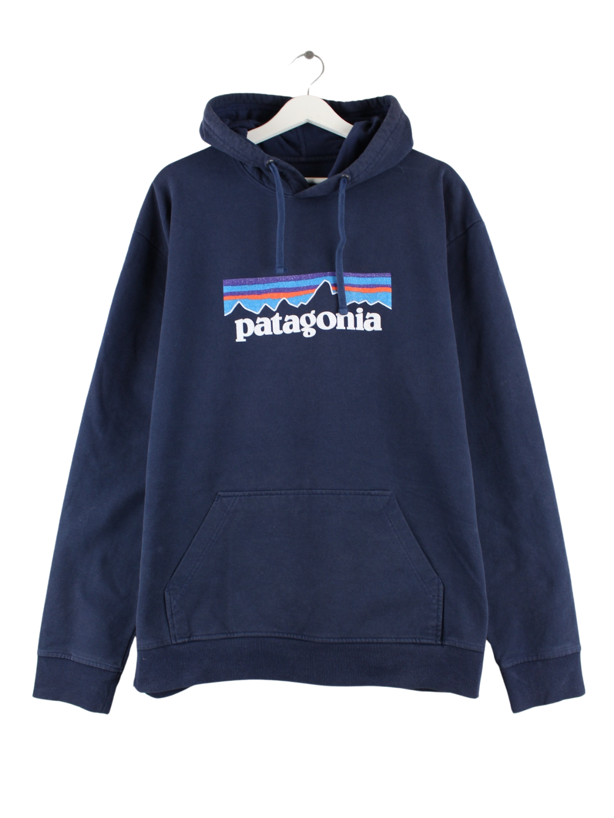 Blauer Hoodie von Patagonia in Größe XL. Er ist aus einer Baumwollmischung hergestellt und in gutem Zustand bei uns vorrätig. Mit schönem Print.