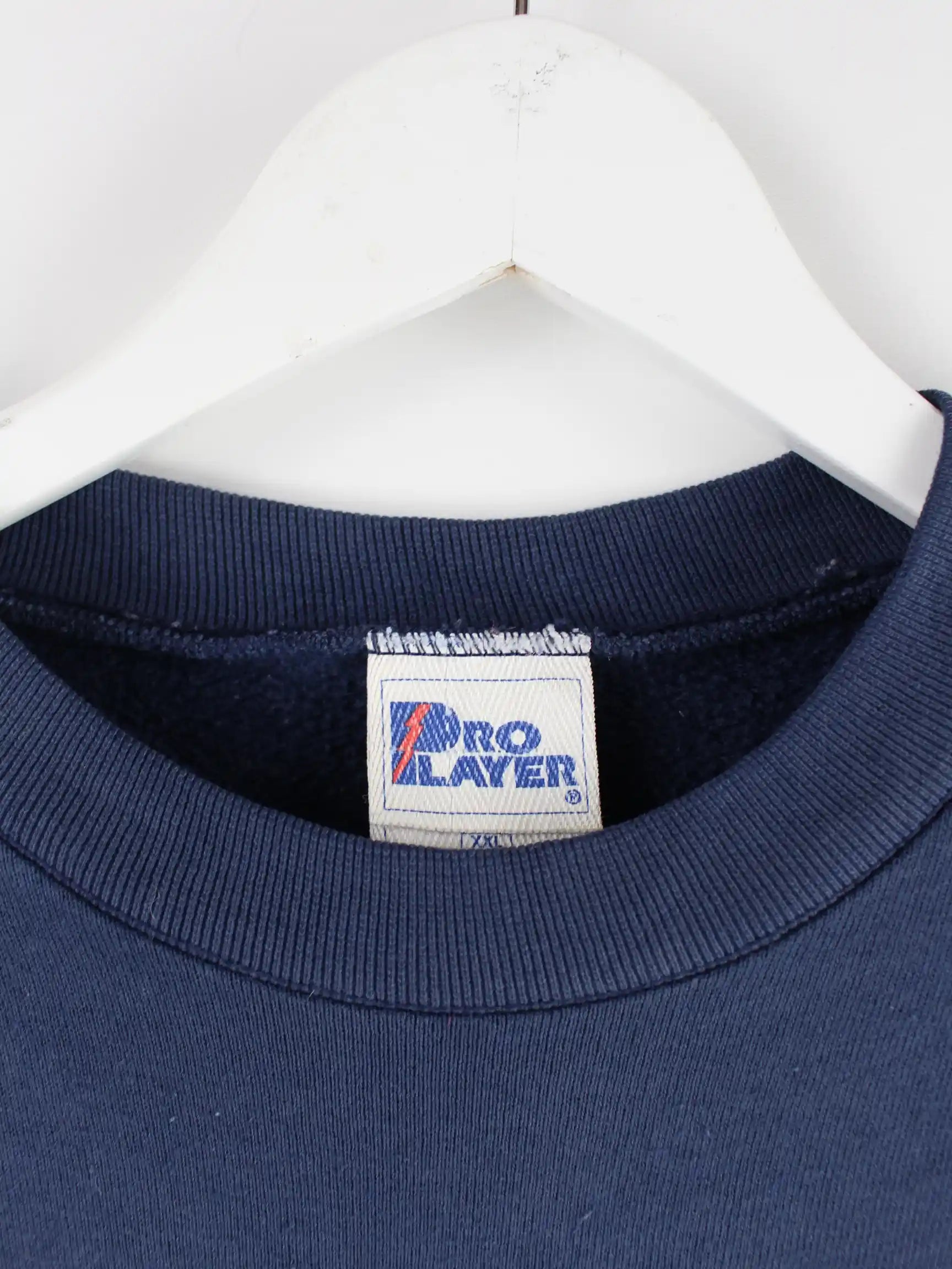 Sweater der Brand Pro Player in Größe XXL aus den 90'ern. Er ist aus einer Baumwollmischung produziert und in Blau bei uns zu bekommen.