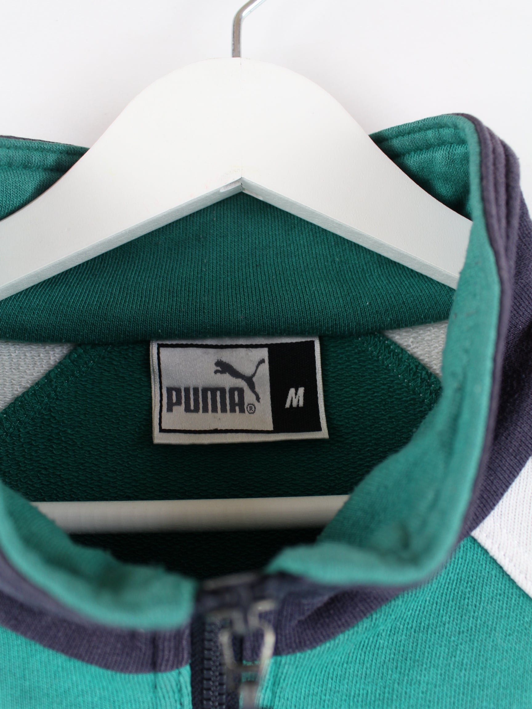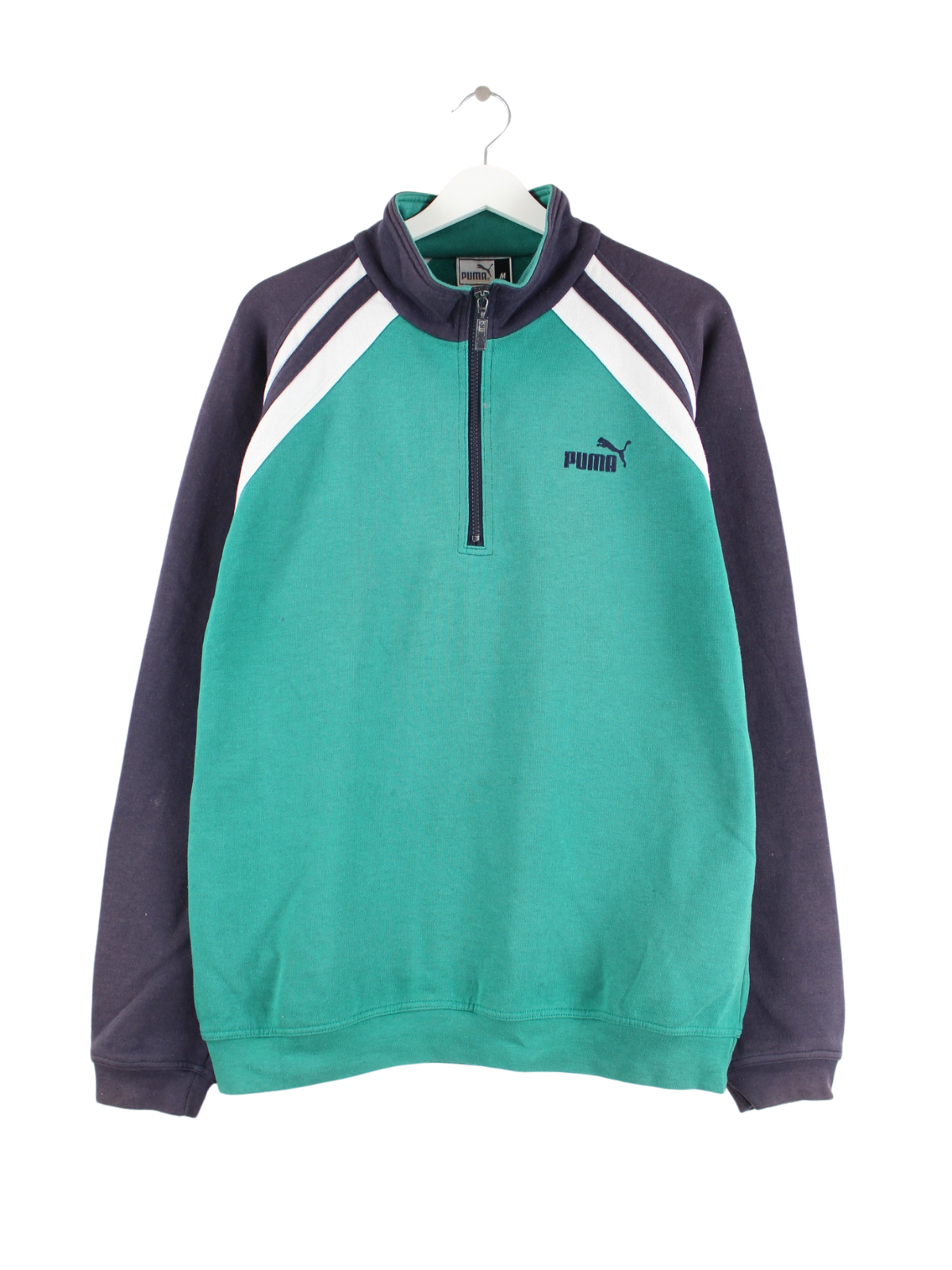 Grüner Sweater mit Stick und halbem Reißverschluß vom Brand Puma in Größe M. Er ist aus einer Baumwollmischung gemacht und in gutem Zustand bei uns zu bekommen.