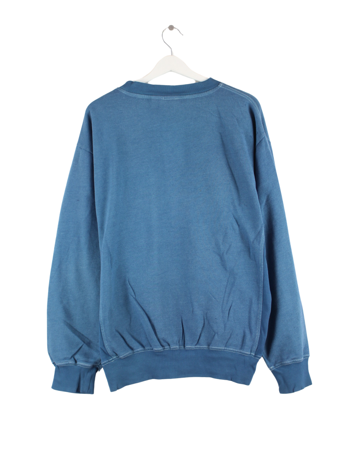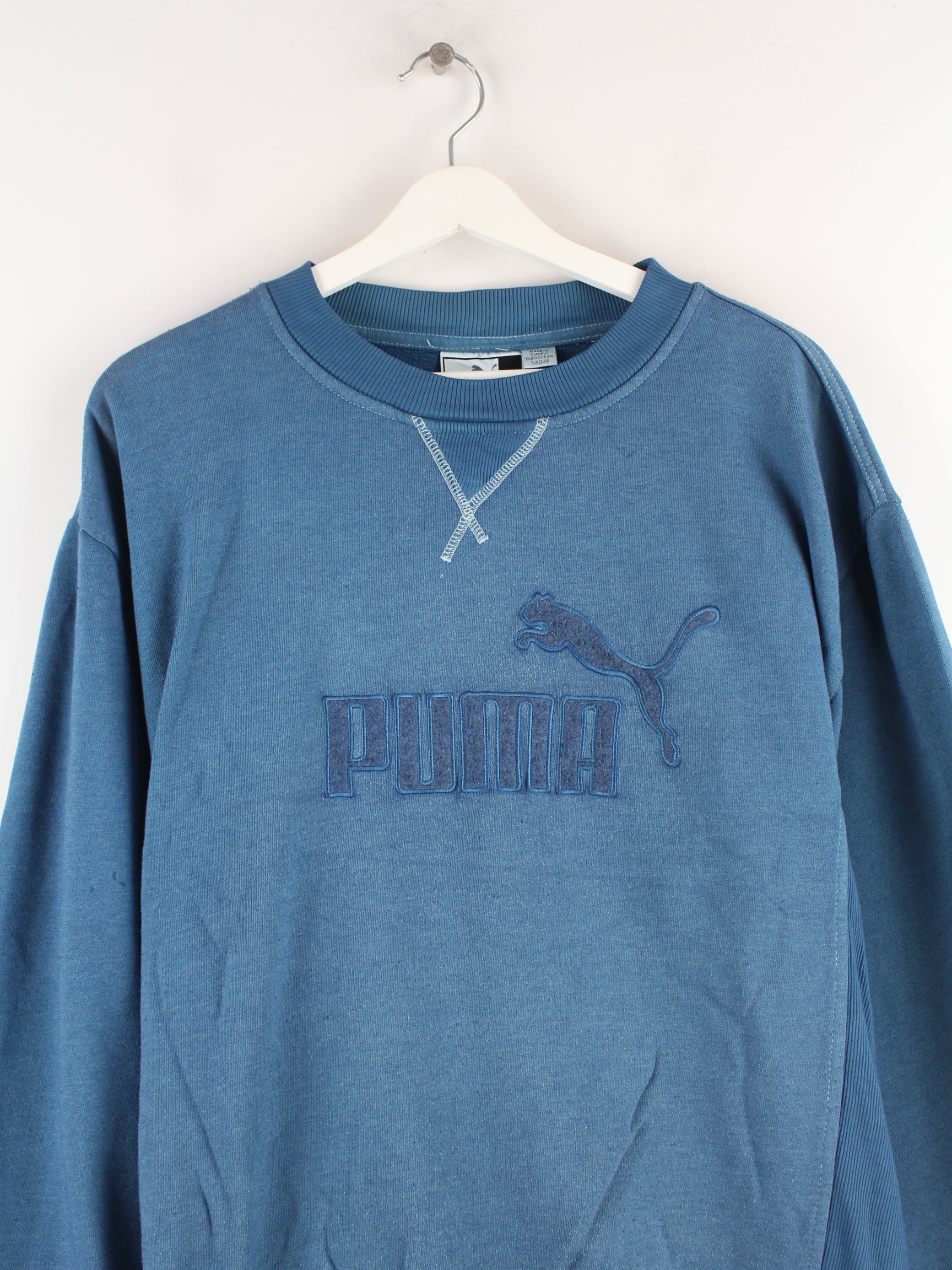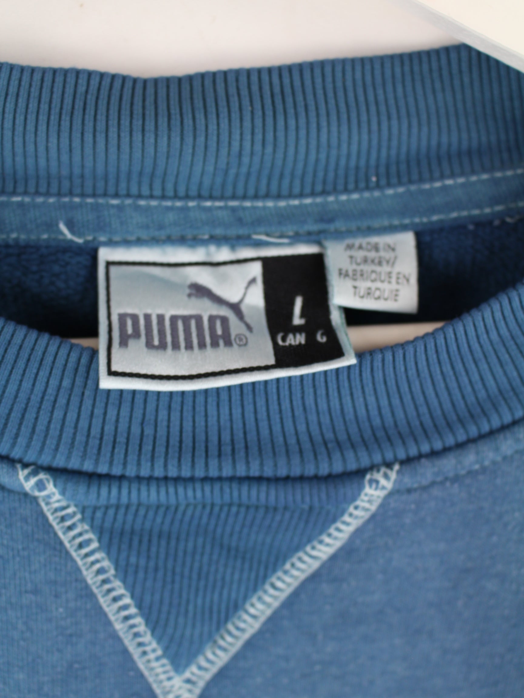 Sweater der Marke Puma mit gestickten Motiven in Größe L. Er ist aus einer Baumwollmischung angefertigt und in Blau in Stock.