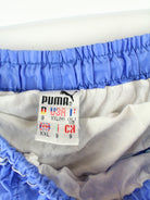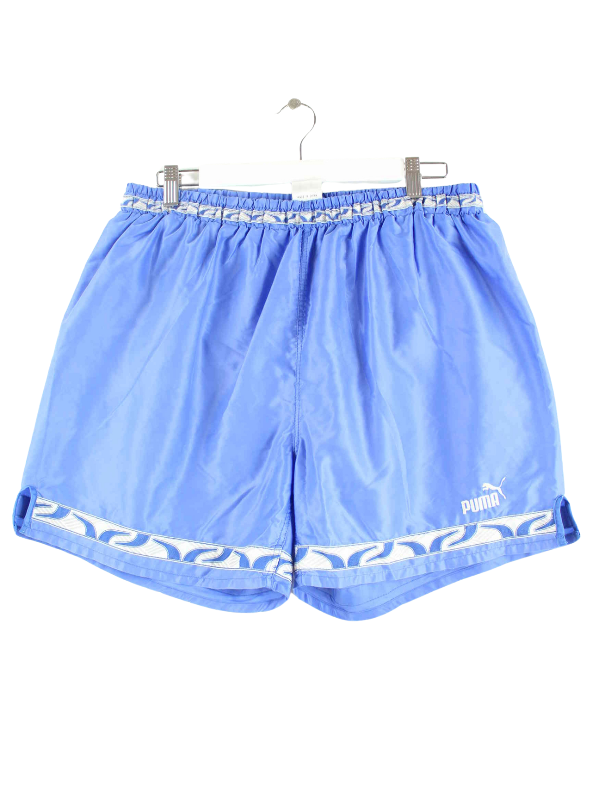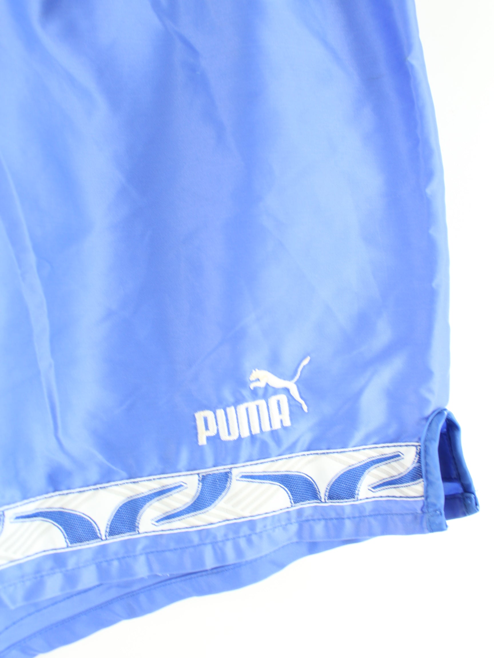 Blaue Shorts mit gesticktem Logo von Puma aus den 80'ern in Größe M. Sie sind aus Synthetik produziert und in sehr gutem Zustand bei uns zu bekommen.