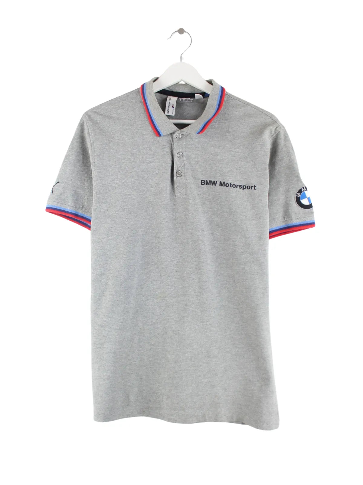 Graues Poloshirt der Brand Puma in Größe M. Es ist aus Baumwolle gemacht und in gutem Zustand bei uns zu bekommen. Mit schickem BMW Print.