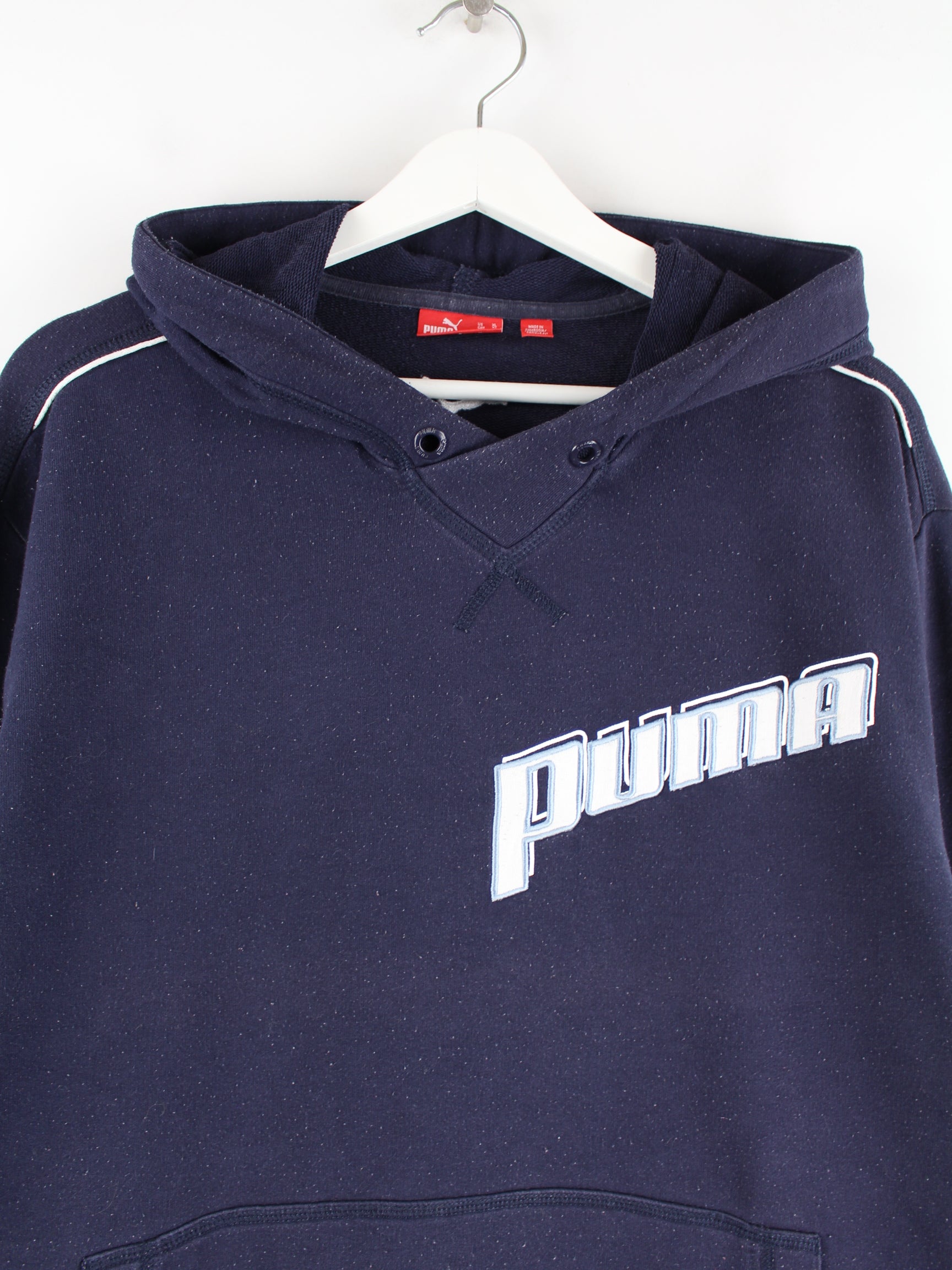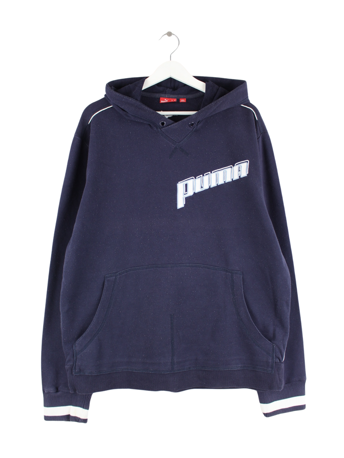 Blauer Hoodie mit Stickereien vom Brand Puma in Größe XL. Er ist aus einer Baumwollmischung angefertigt und in sehr gutem Zustand im Angebot.