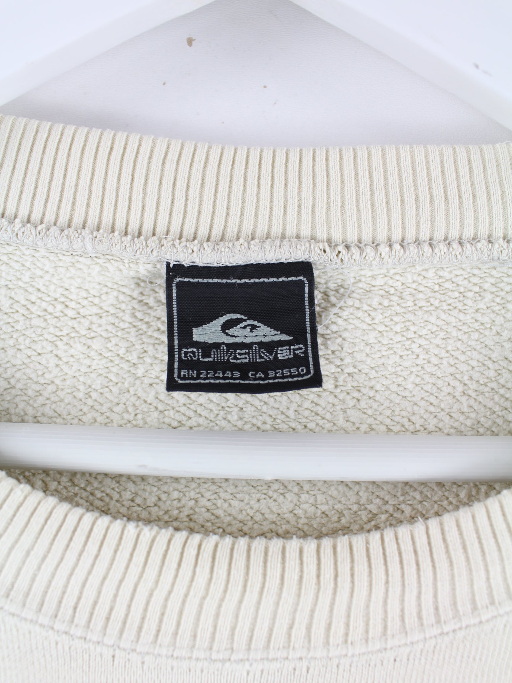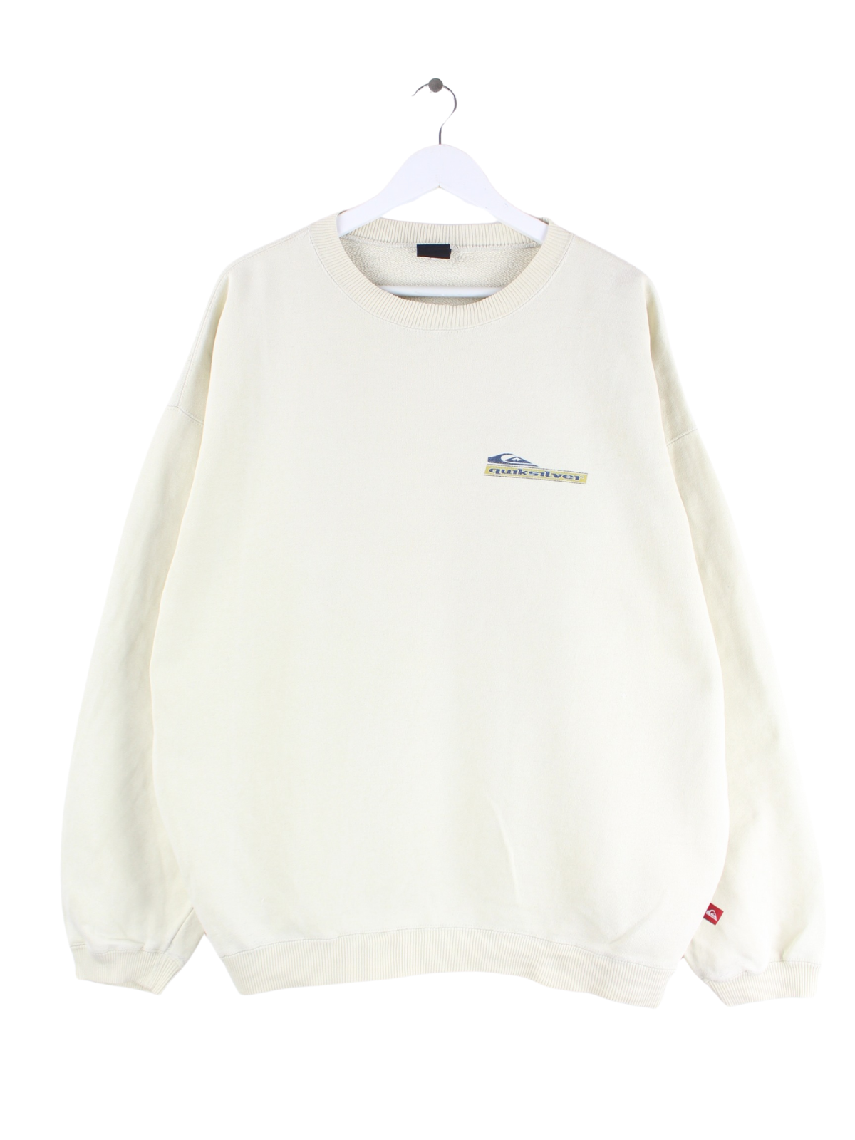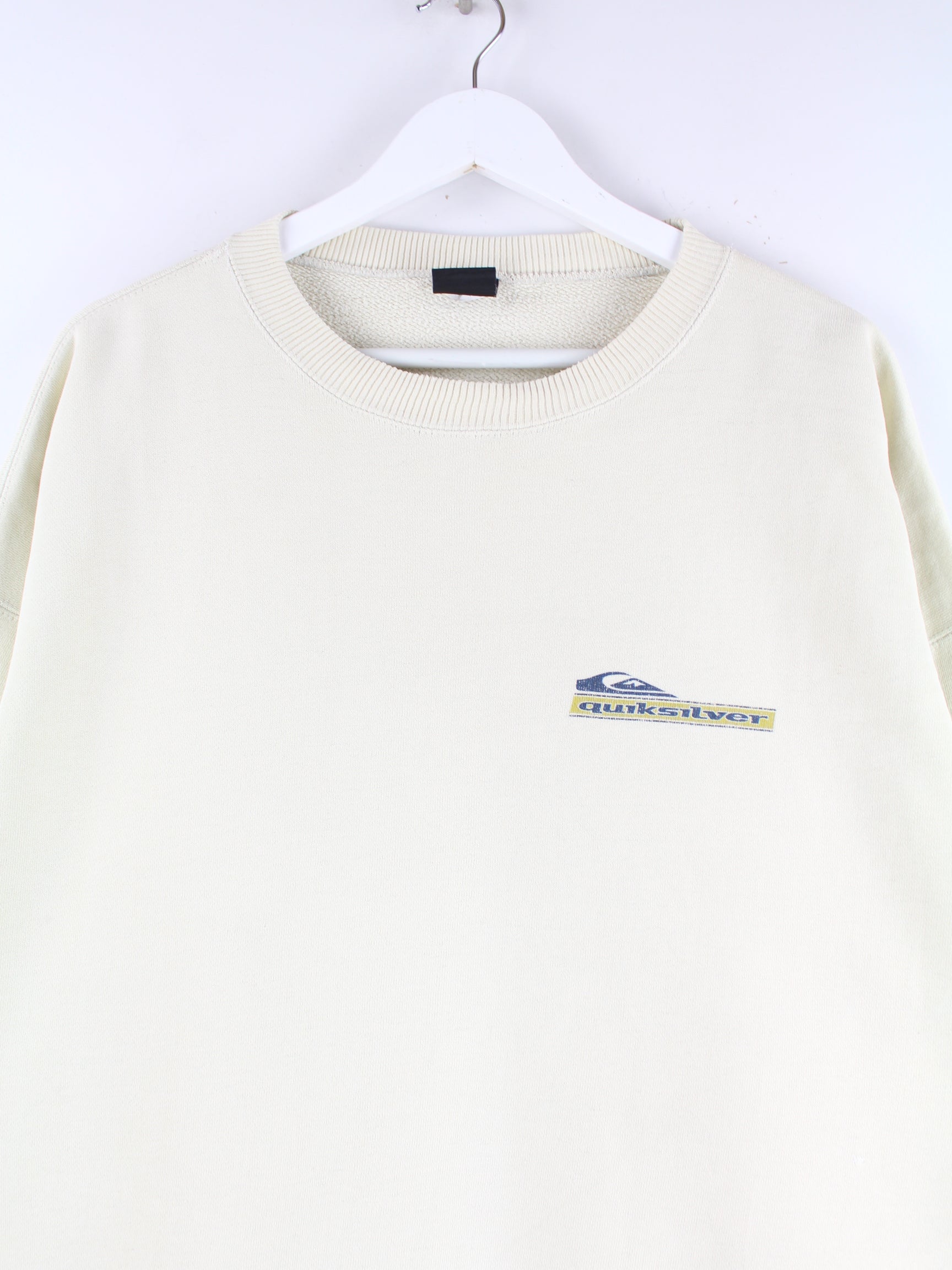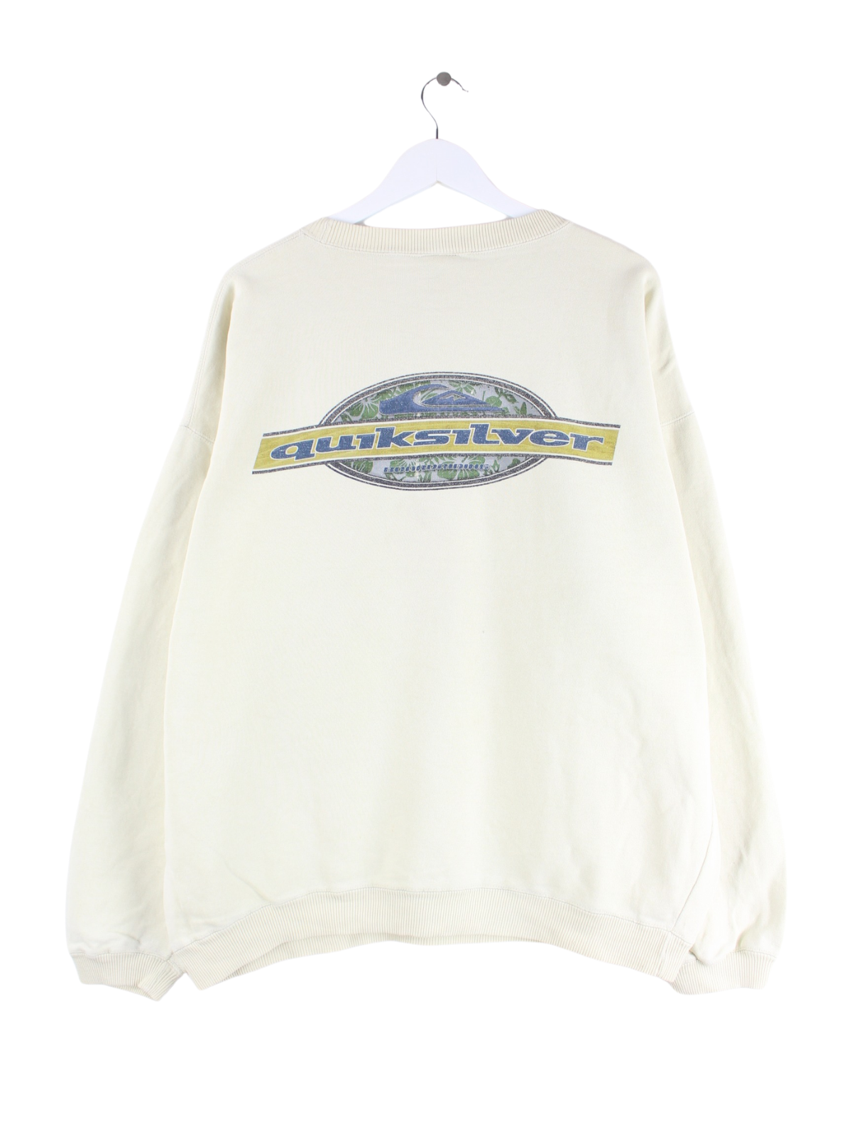 Sweater der Brand Quiksilver in Größe XL aus den 80'ern. Er ist aus einer Baumwollmischung hergestellt und in Beige bei uns vorrätig. Mit seltenem Vintage Print.