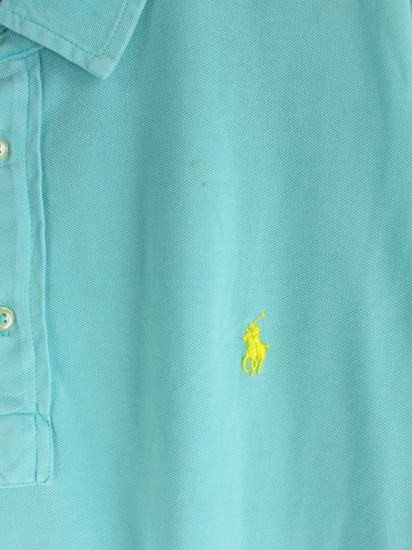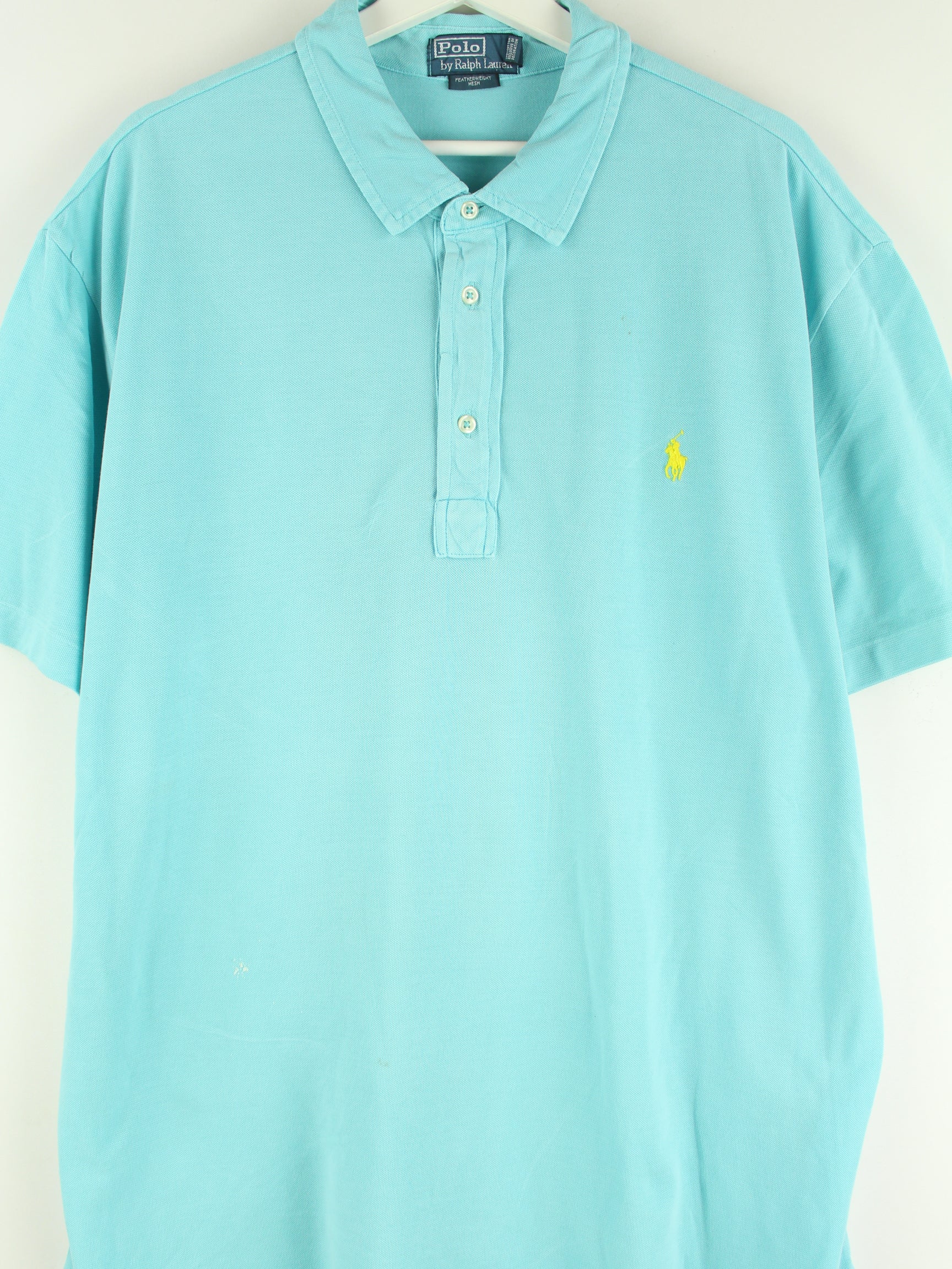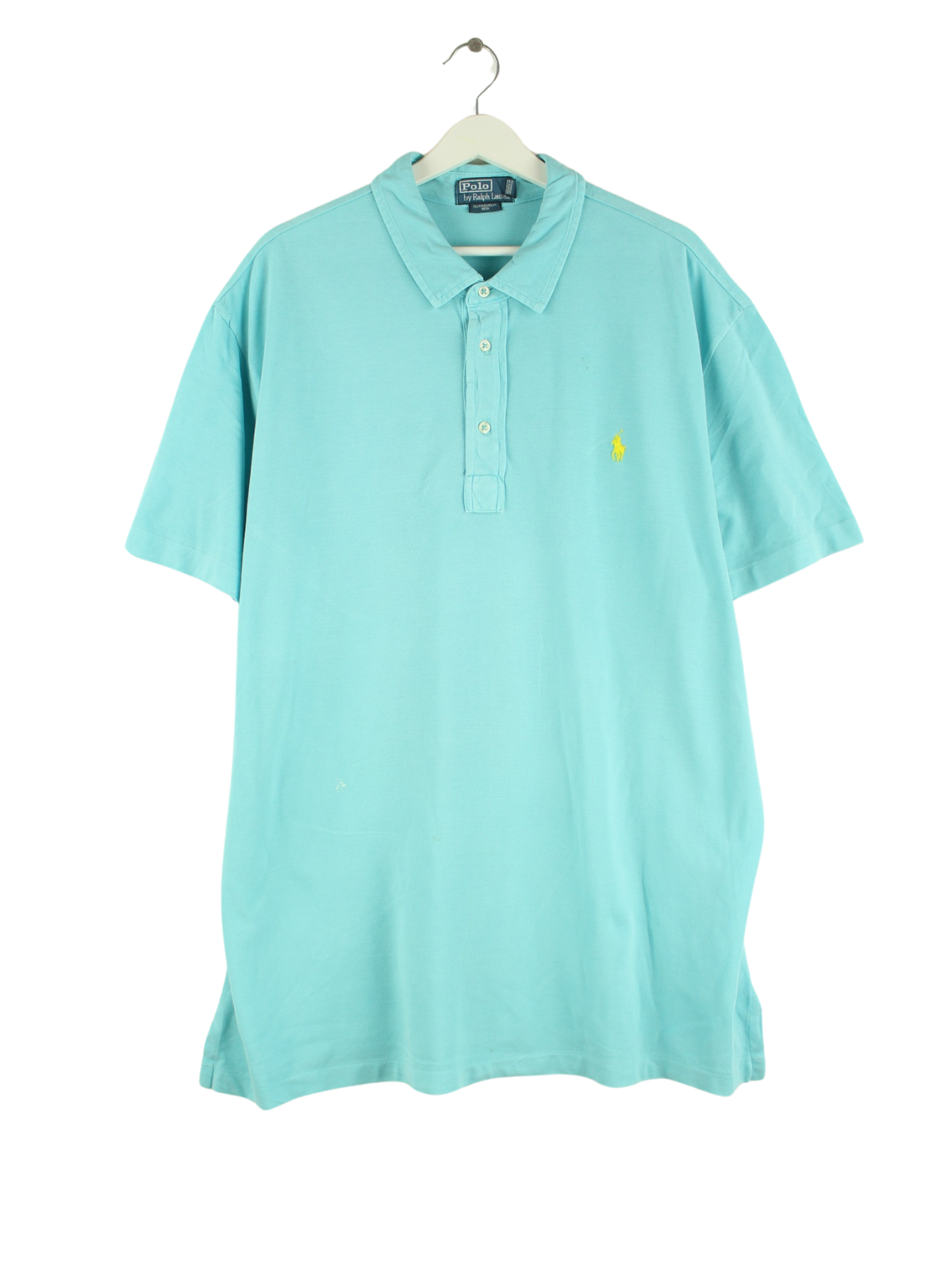 Türkisfarbenes Poloshirt vom Label Ralph Lauren aus den 90'ern in Größe XXL. Es ist aus Baumwolle angefertigt und in gutem Zustand vorrätig.