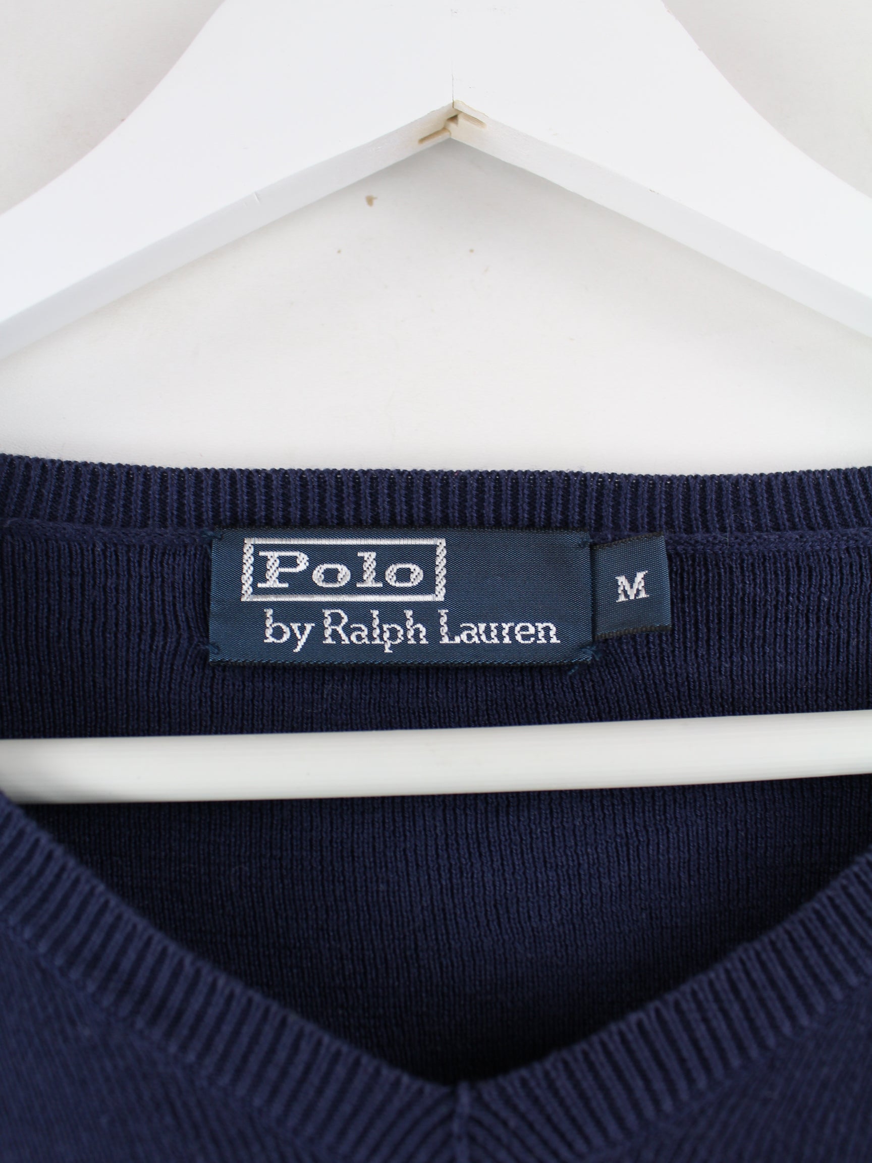 Blauer Pullover der Marke Ralph Lauren aus den 90'ern in Größe M. Er ist aus Baumwolle produziert und in gutem Zustand vorrätig.