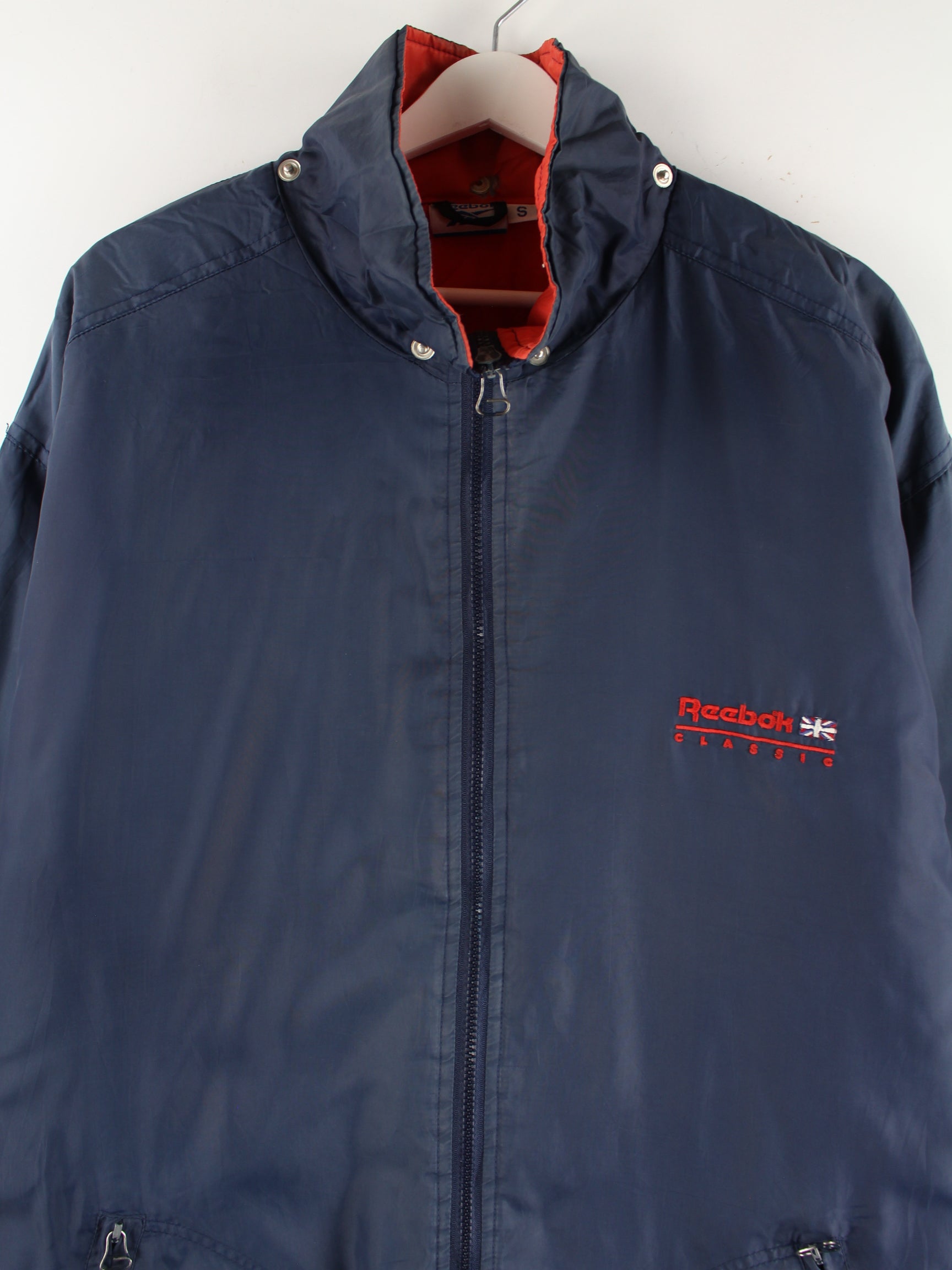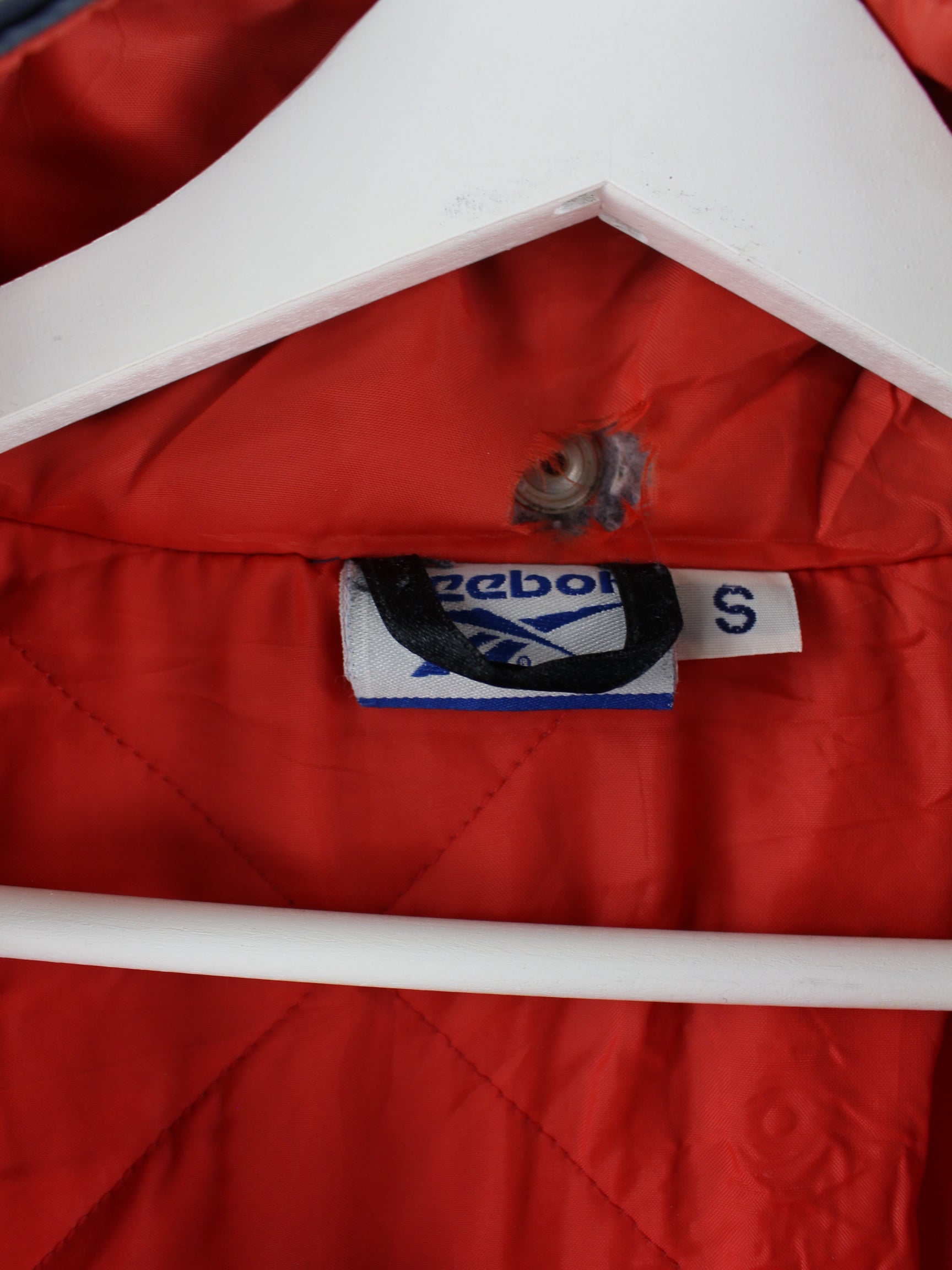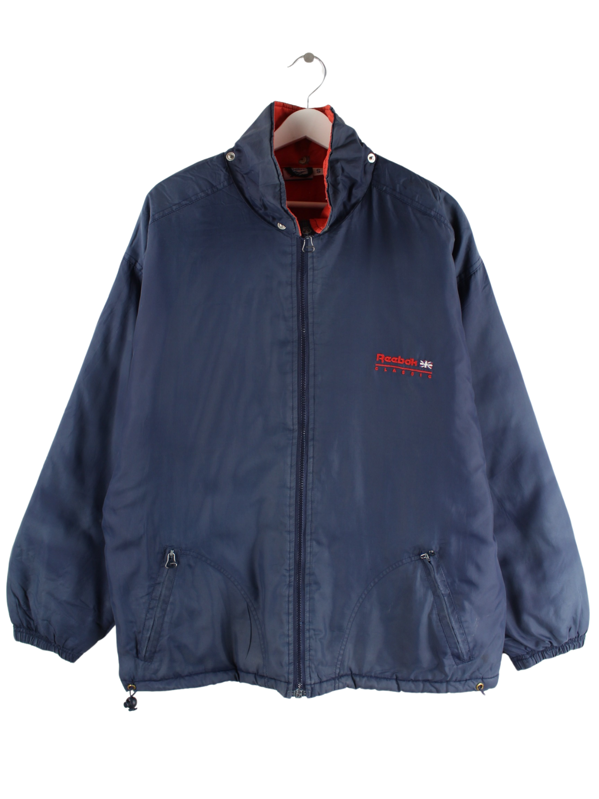 Blaue Jacke mit Stickereien der Brand Reebok in Größe L. Sie ist aus Synthetik und in sehr gutem Zustand in Stock.