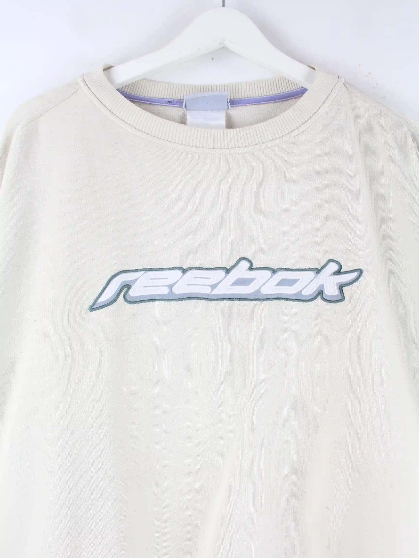 Sweater des Labels Reebok mit Stickereien in Größe XL. Er ist aus einer Baumwollmischung produziert und in Beige zu haben.