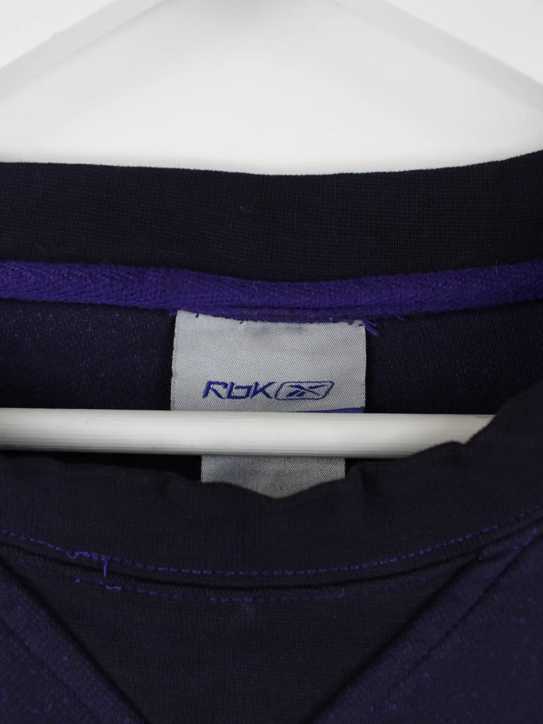 Lilafarbener Sweater der Marke Reebok in Größe XL. Er ist aus einer Baumwollmischung angefertigt und in sehr gutem Zustand bei uns vorrätig. Mit schönem Vikings Print.