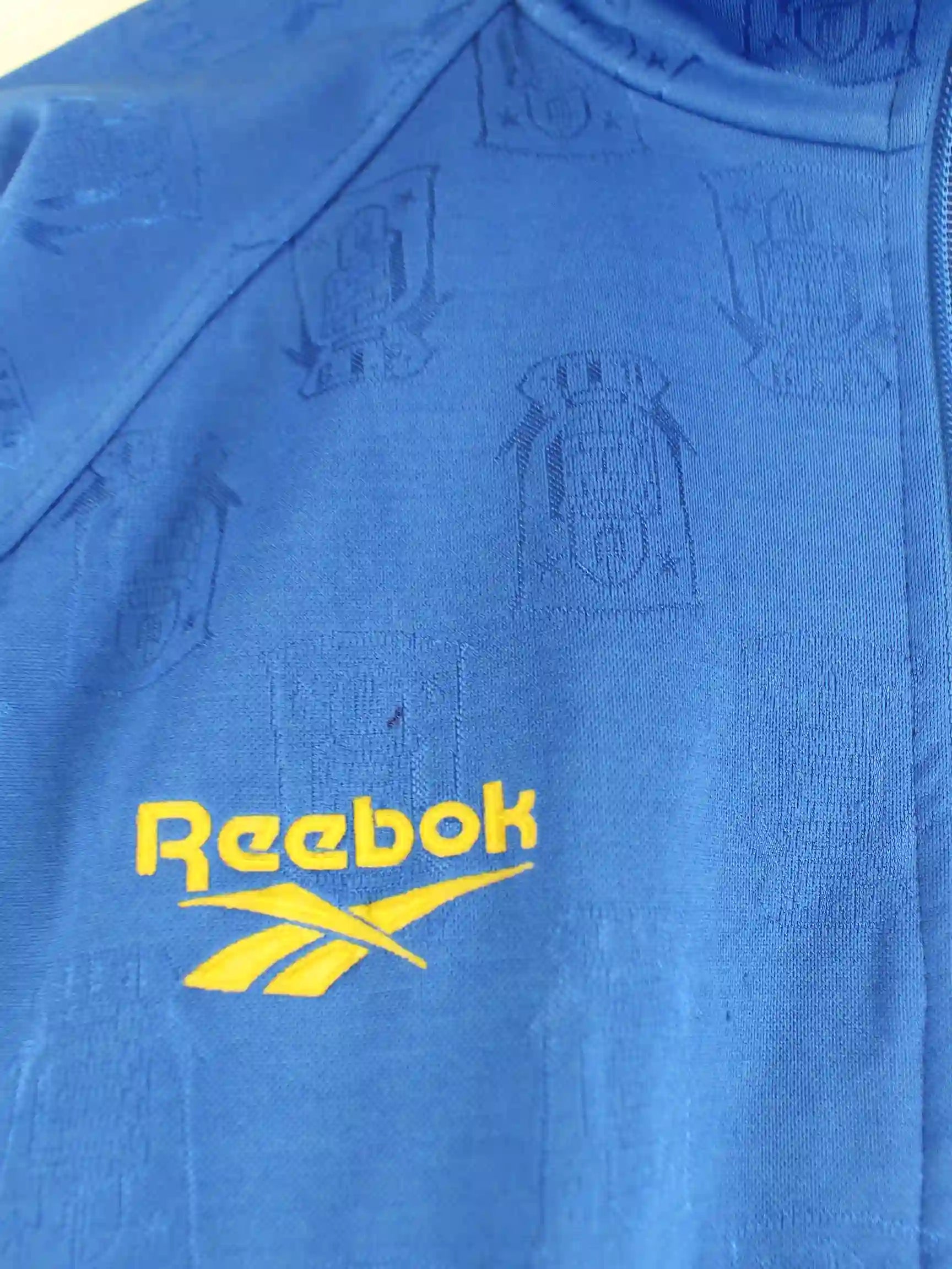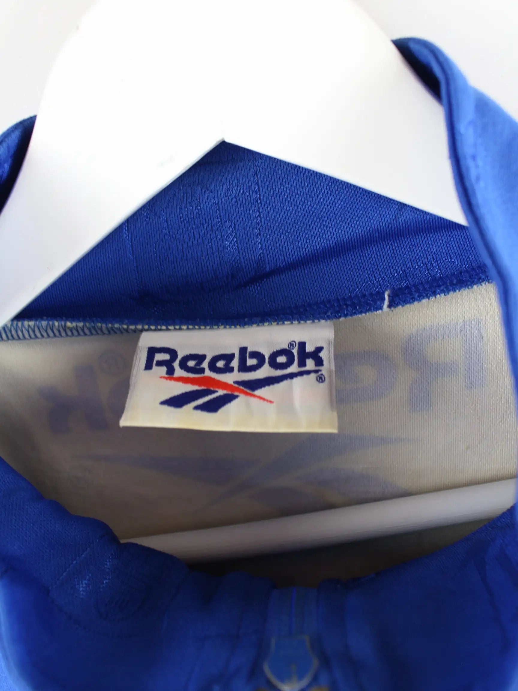 Blaue Trainingsjacke vom Label Reebok aus den 90'ern in Größe M. Sie ist aus Synthetik gemacht und in gutem Zustand im Bestand.