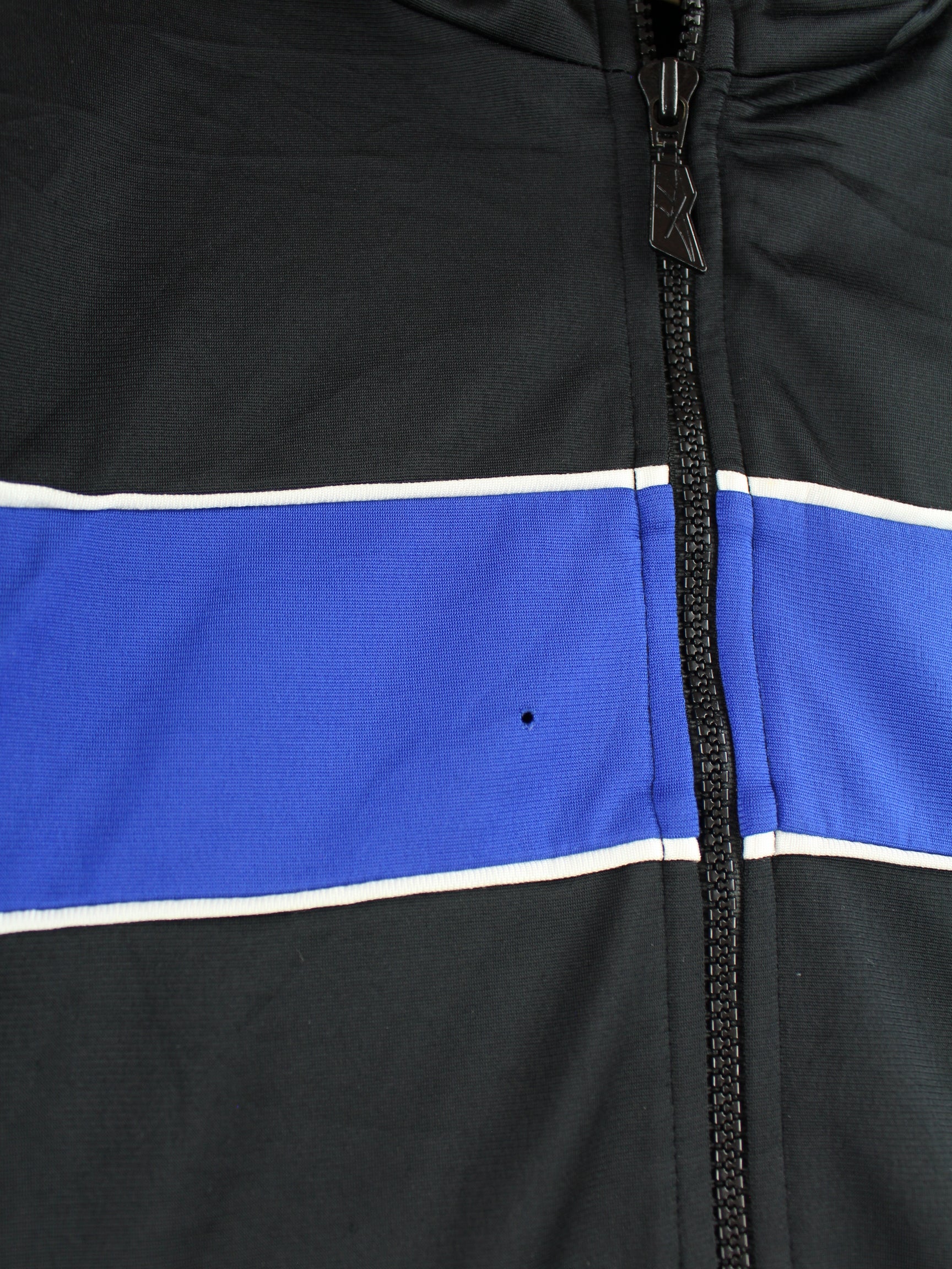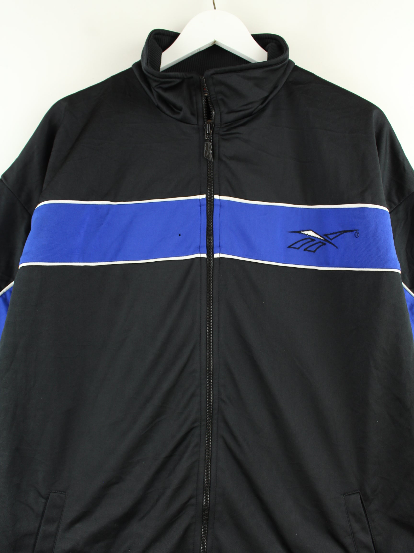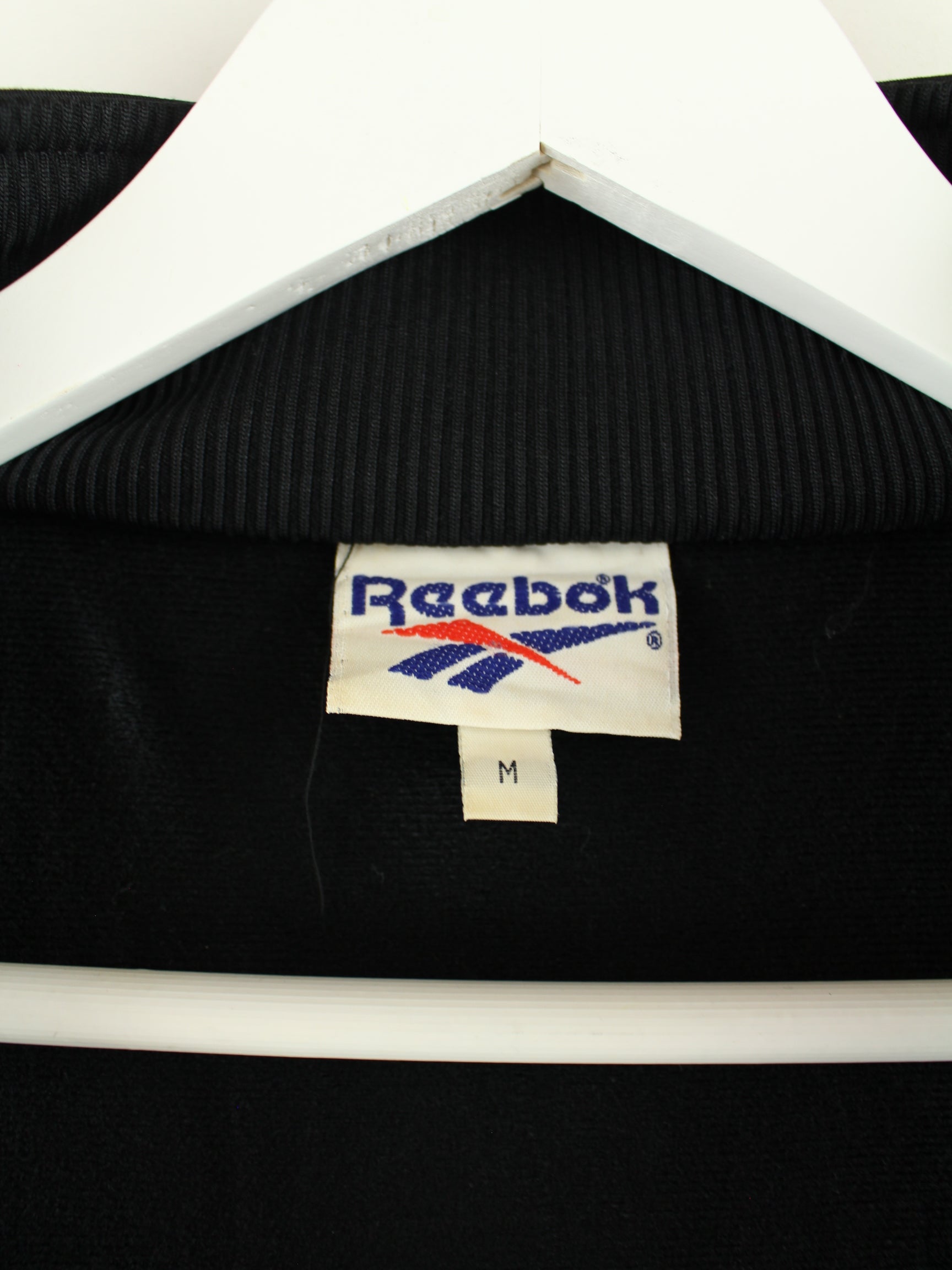 Schwarze Trainingsjacke mit gestickten Motiven von Reebok aus den 90'ern in Größe M. Sie ist aus Synthetik und in gutem Zustand auf Lager.