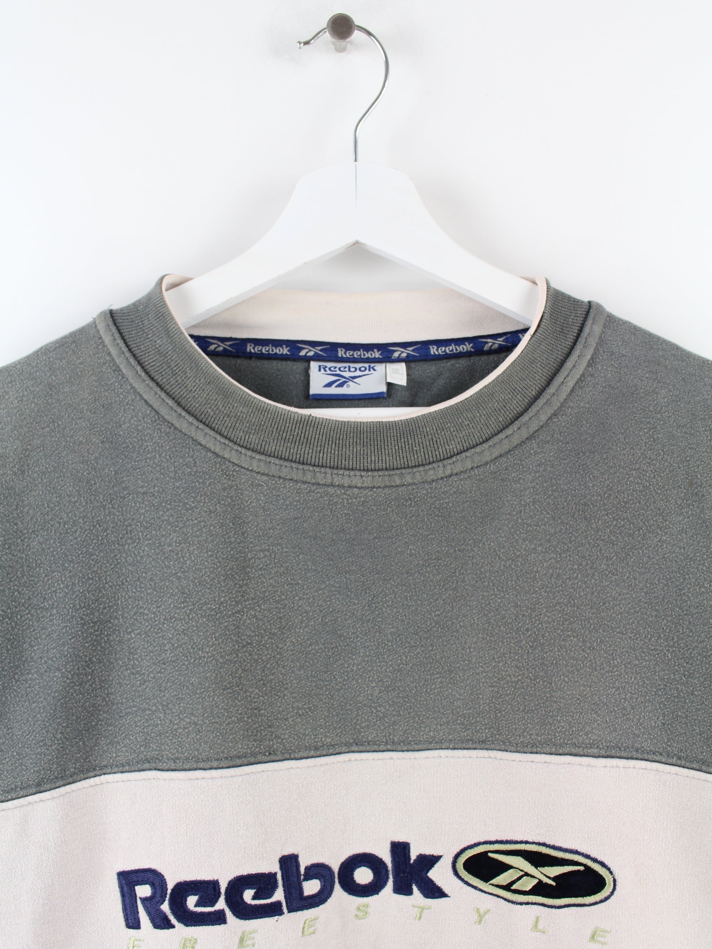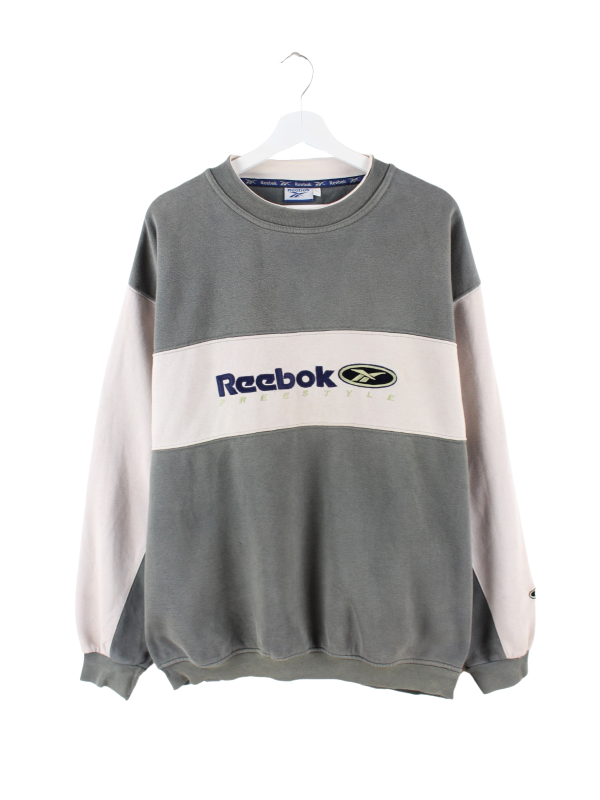 Grauer Sweater der Marke Reebok, mit großem Logo auf der Front.