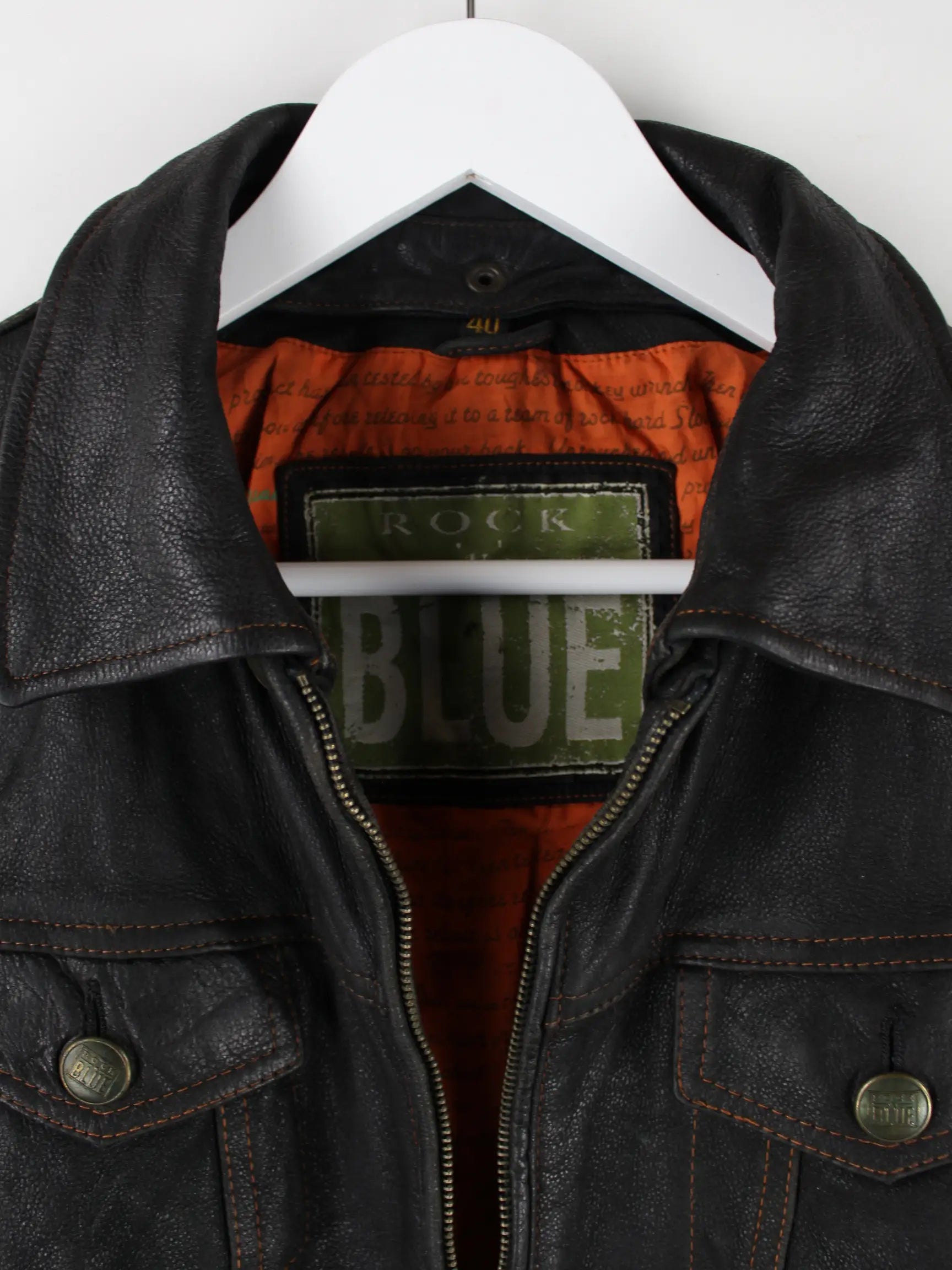 Schwarze Jacke vom Label ROCKANDBLUE aus den 90'ern in Größe M. Sie ist aus Leder produziert und in gutem Zustand bei uns vorrätig.