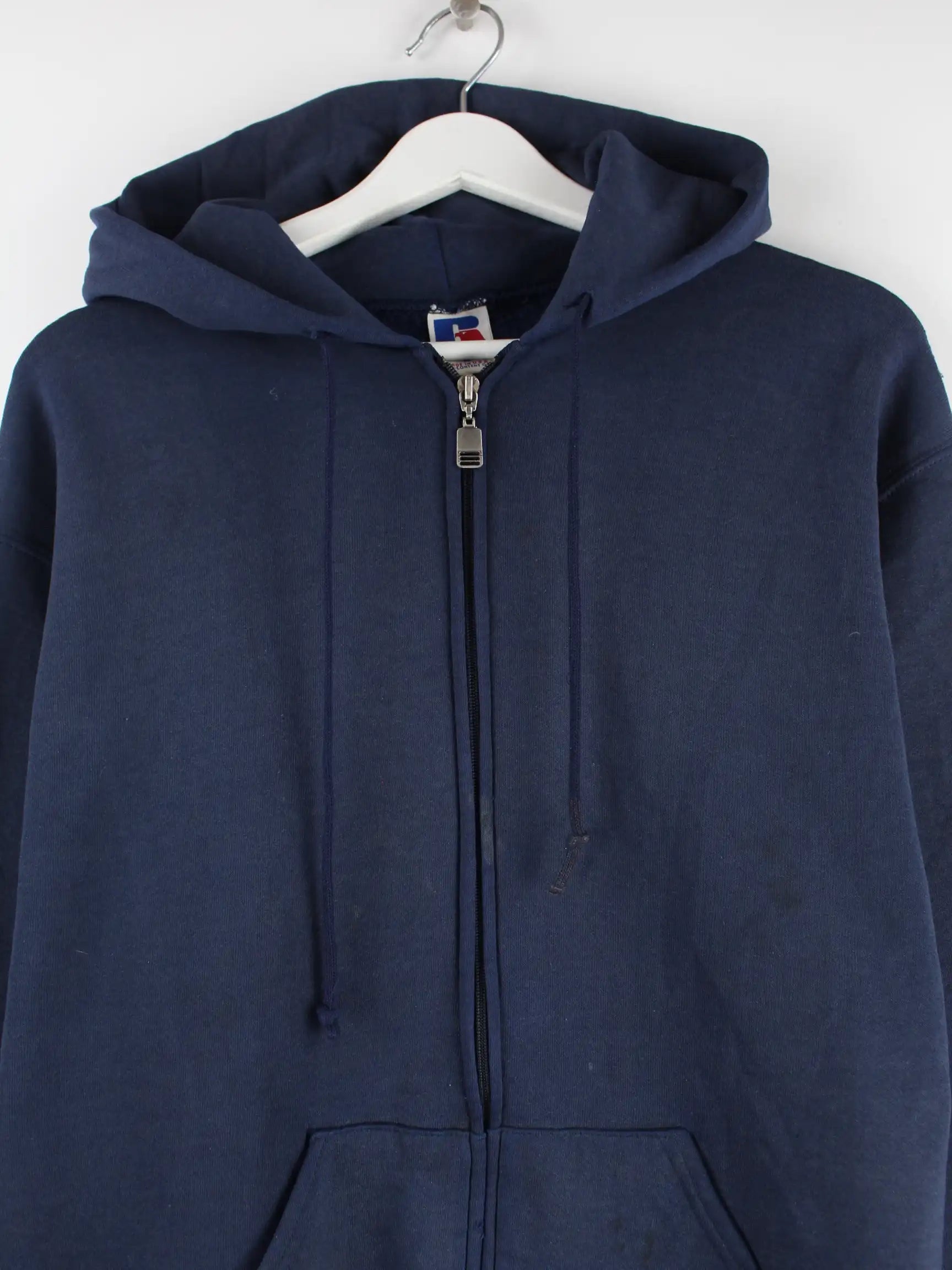 Hoodie von Russell Athletic mit durchgehendem Reißverschluß in Größe M. Er ist aus einer Baumwollmischung und in Blau im Angebot.
