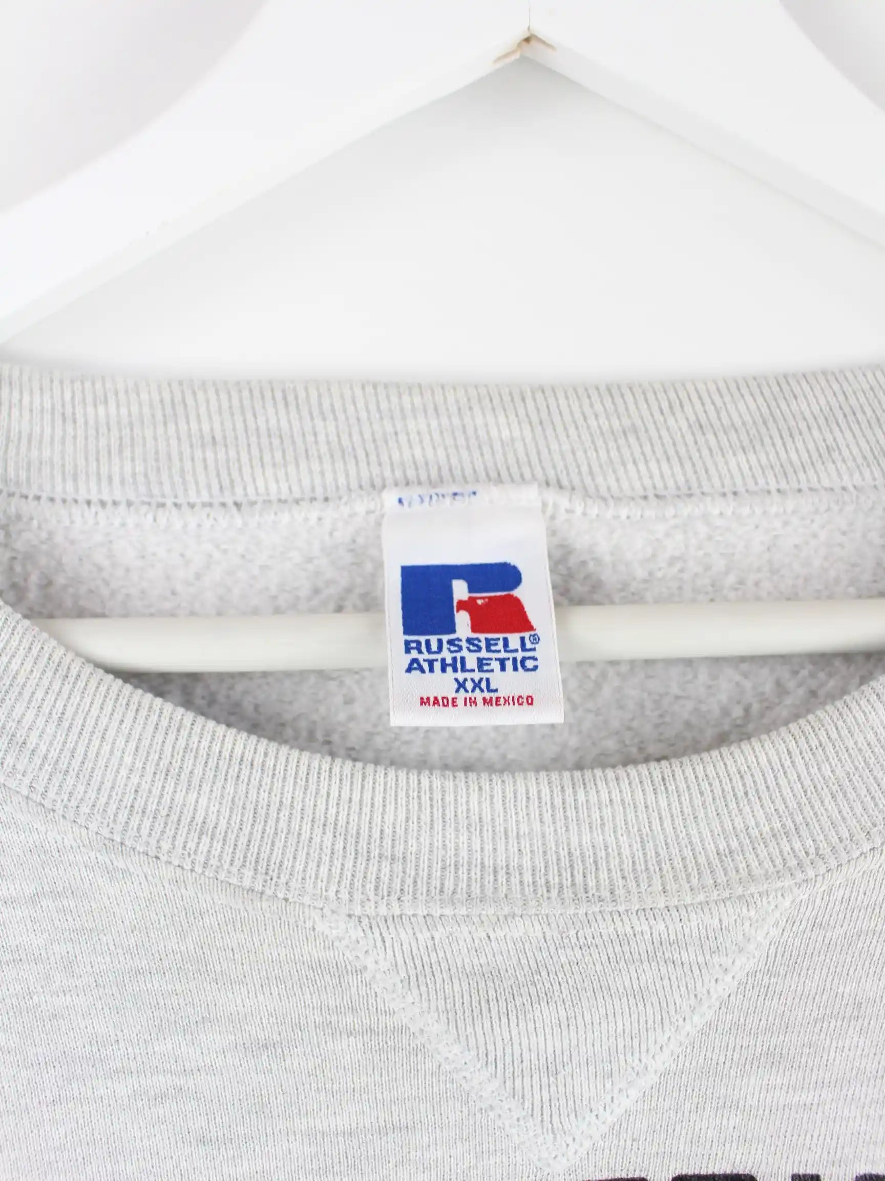 Sweater aus dem Hause Russell Athletic in Größe XXL. Er ist aus einer Baumwollmischung gefertigt und in Grau zu bekommen. Mit seltenem Football Print.