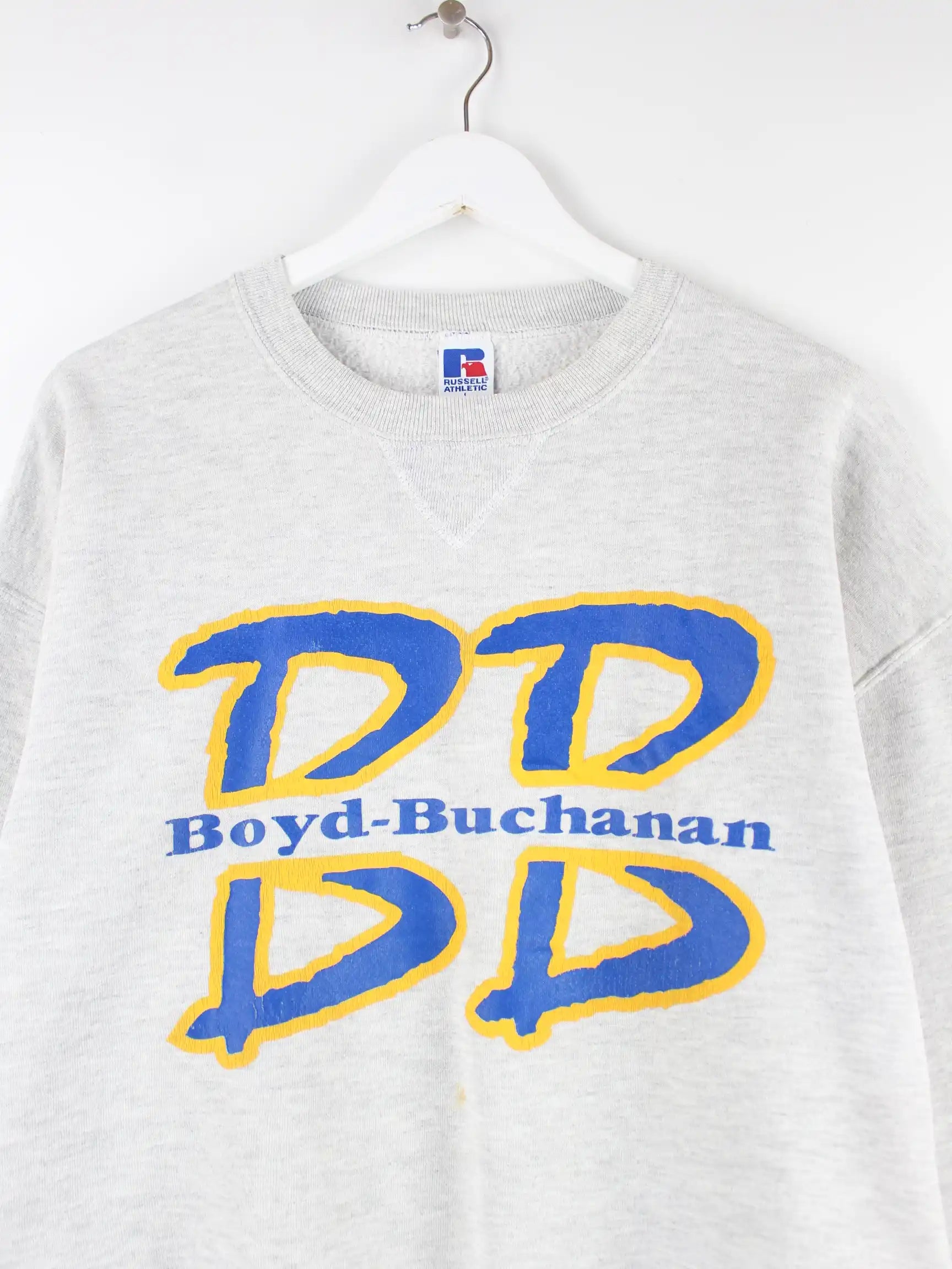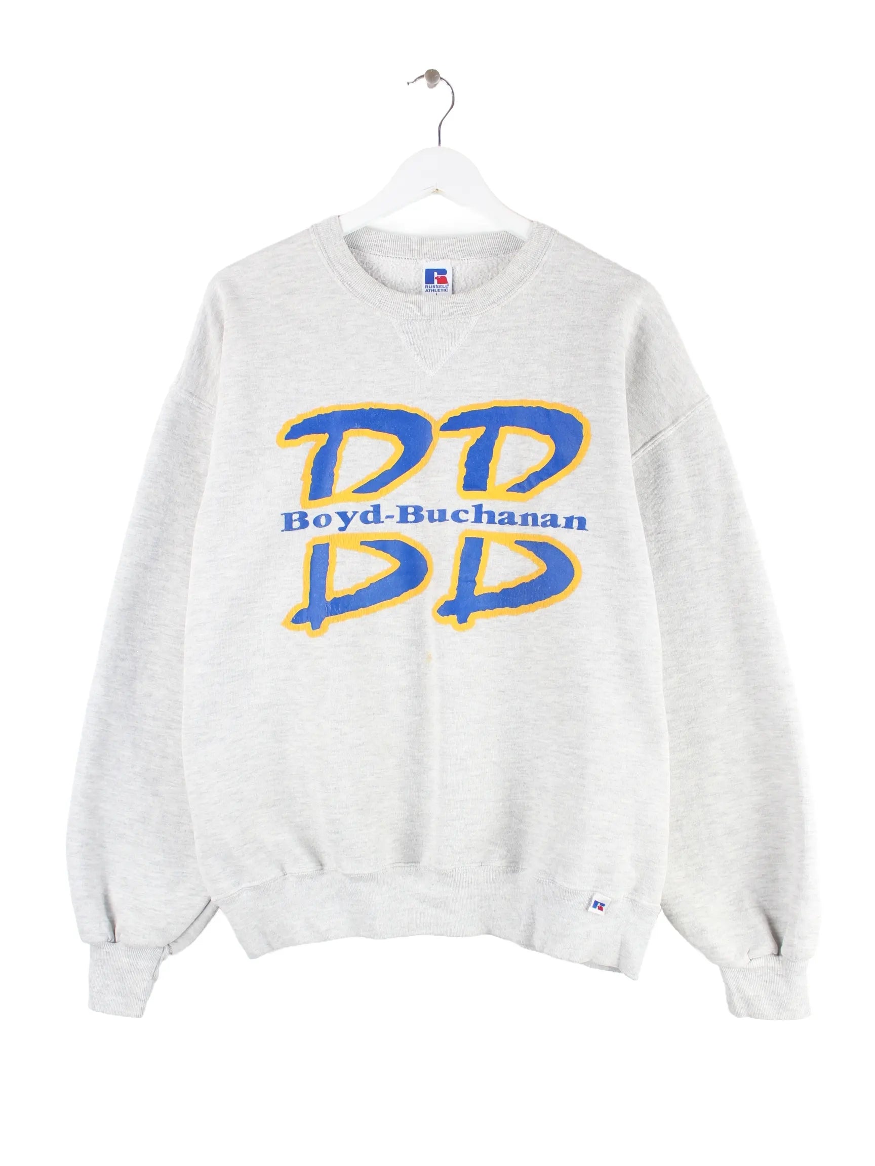 Grauer Sweater aus dem Hause Russell Athletic in Größe L. Er ist aus einer Baumwollmischung . Den Zustand würden wir als 'In Ordnung' bezeichnen (vergl. Bilder).Mit tollem 00s Print.
