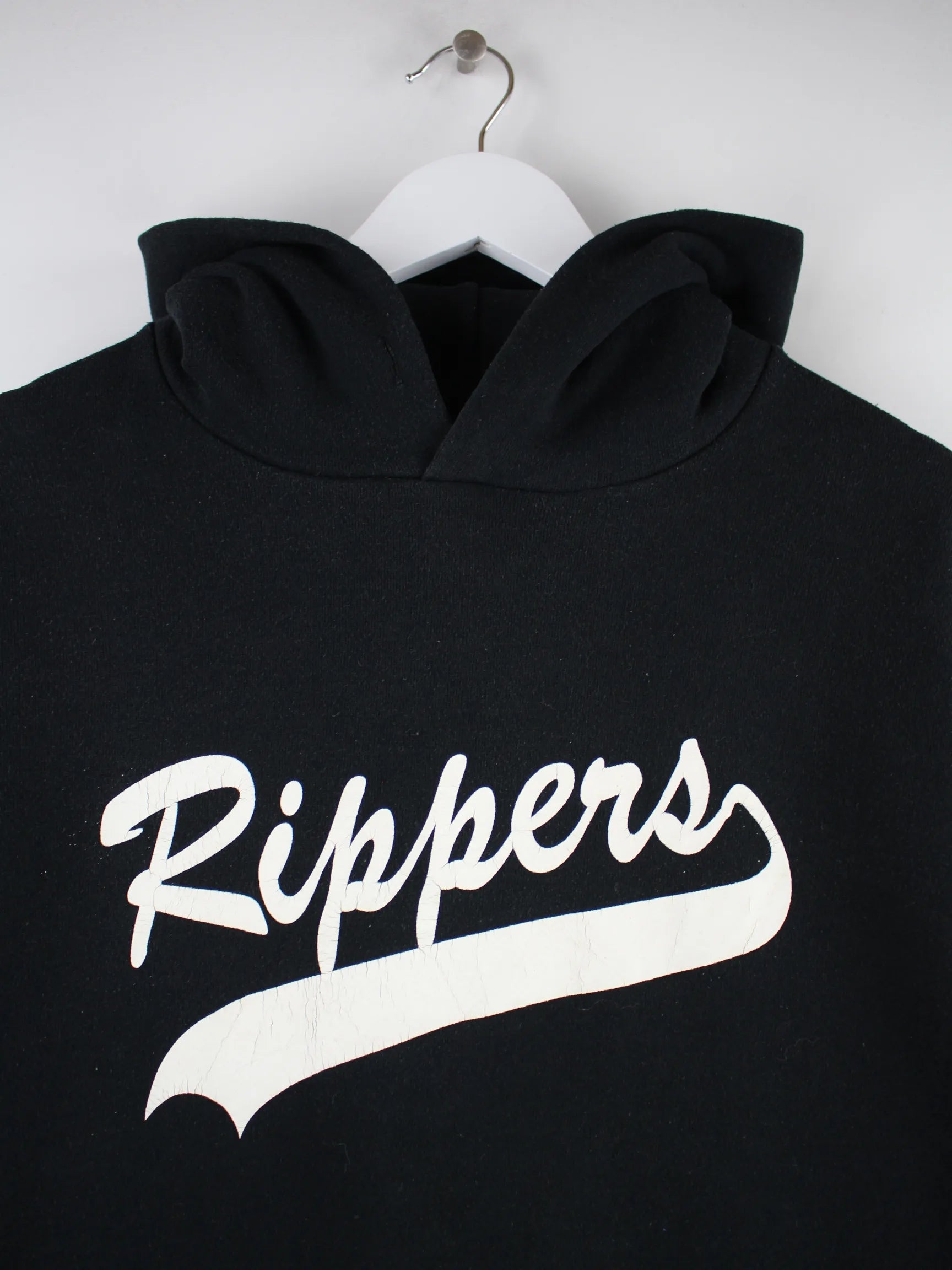 Schwarzer Hoodie aus dem Hause Russell Athletic in Größe S. Er ist aus einer Baumwollmischung gefertigt und in gutem Zustand vorrätig. Mit chiquem Rippers Print.