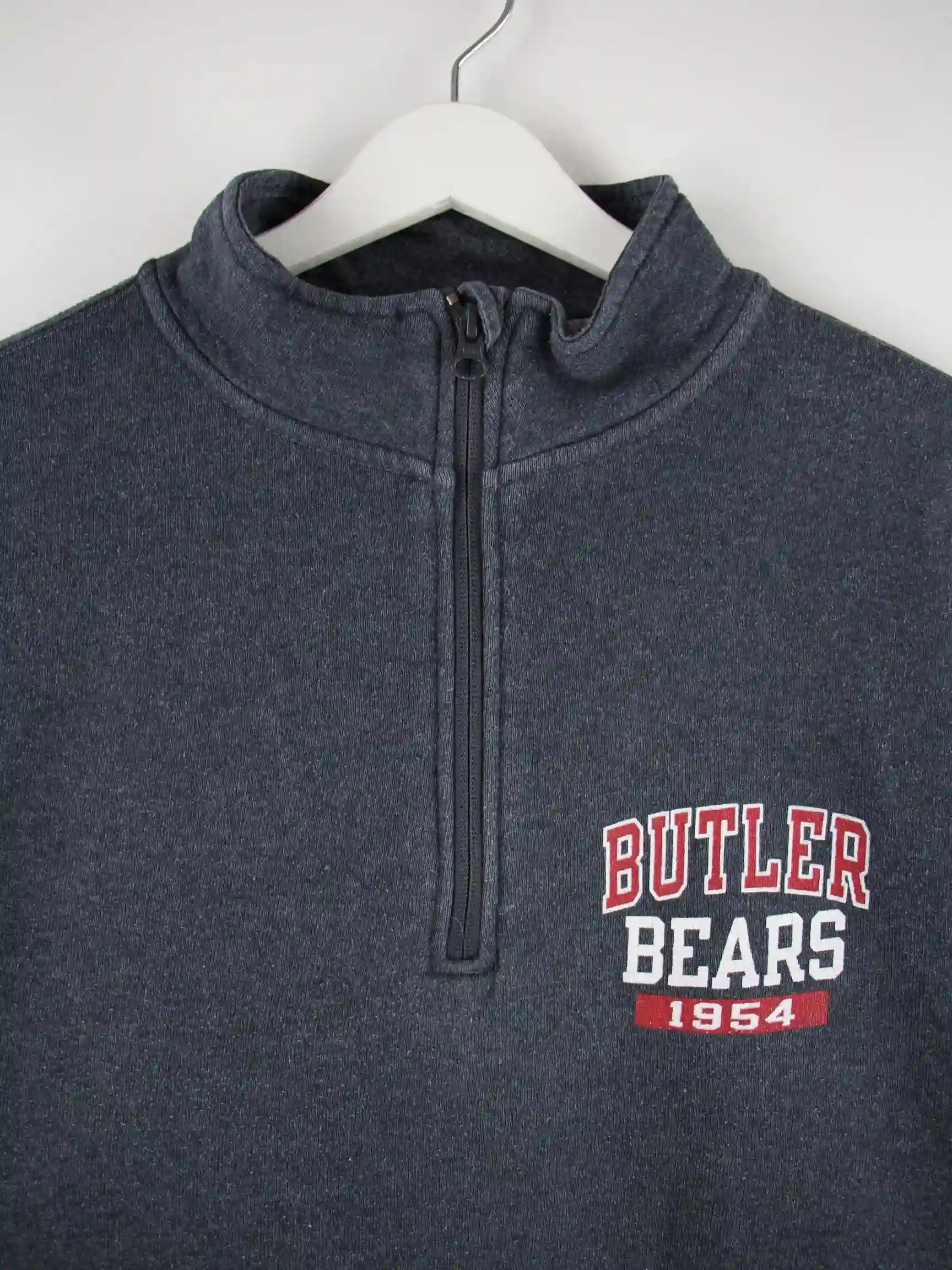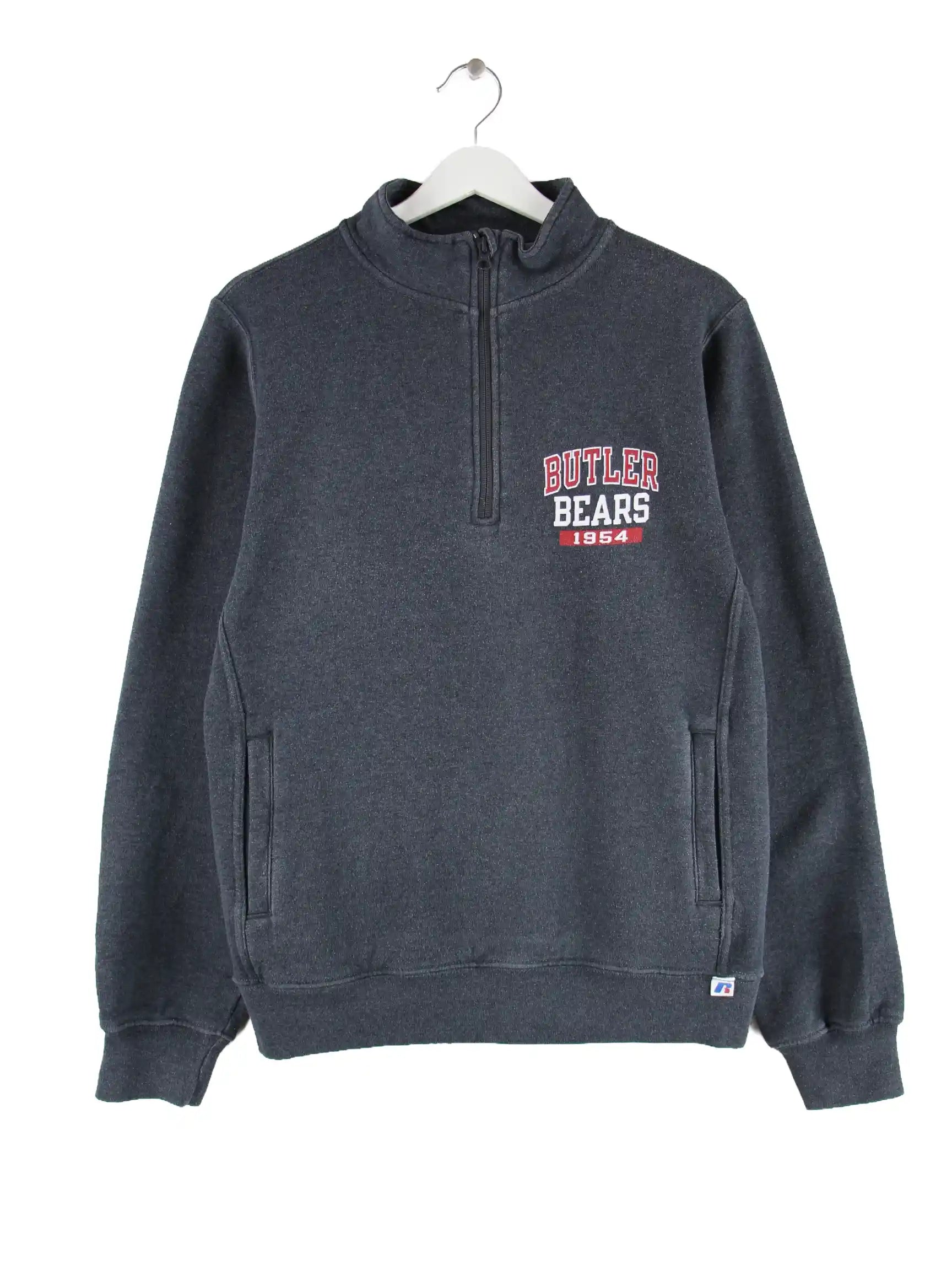 Grauer Sweater mit halbem Reißverschluß vom Label Russell Athletic in Größe S. Er ist aus einer Baumwollmischung hergestellt und in gutem Zustand in Stock. Mit seltenem Bears Print.