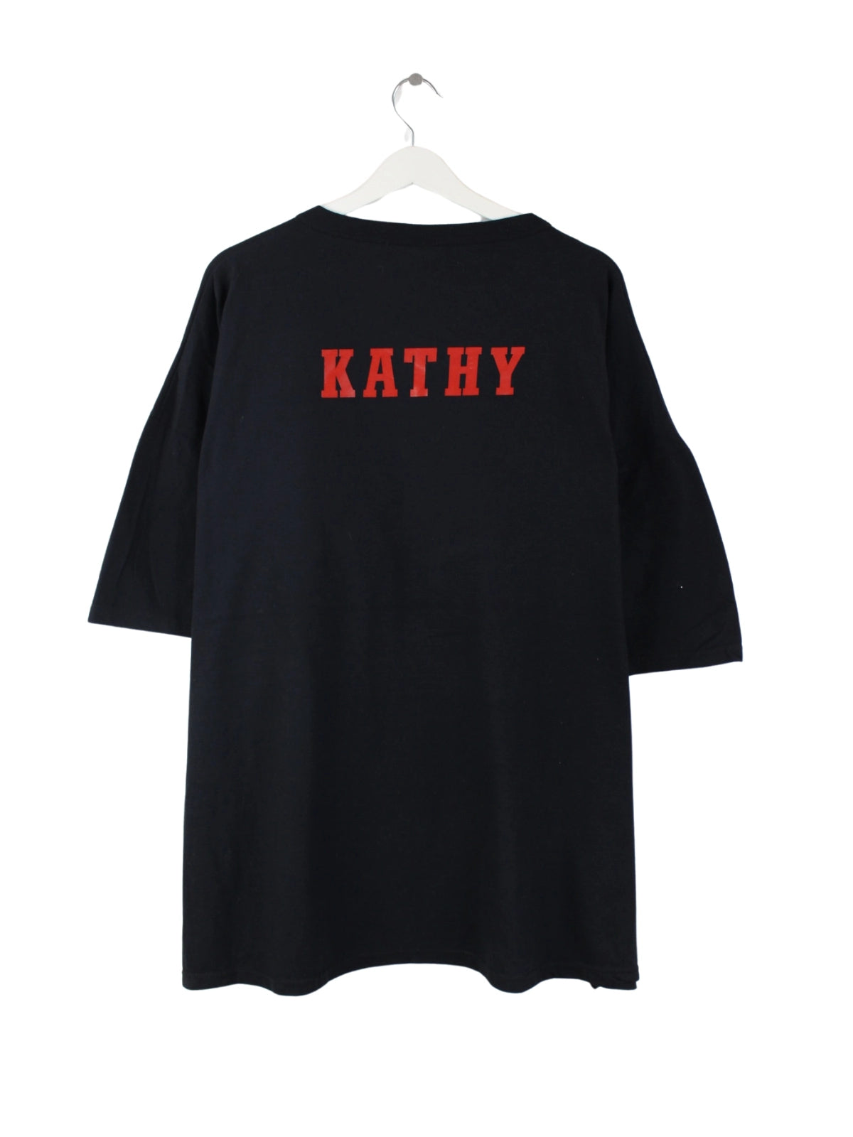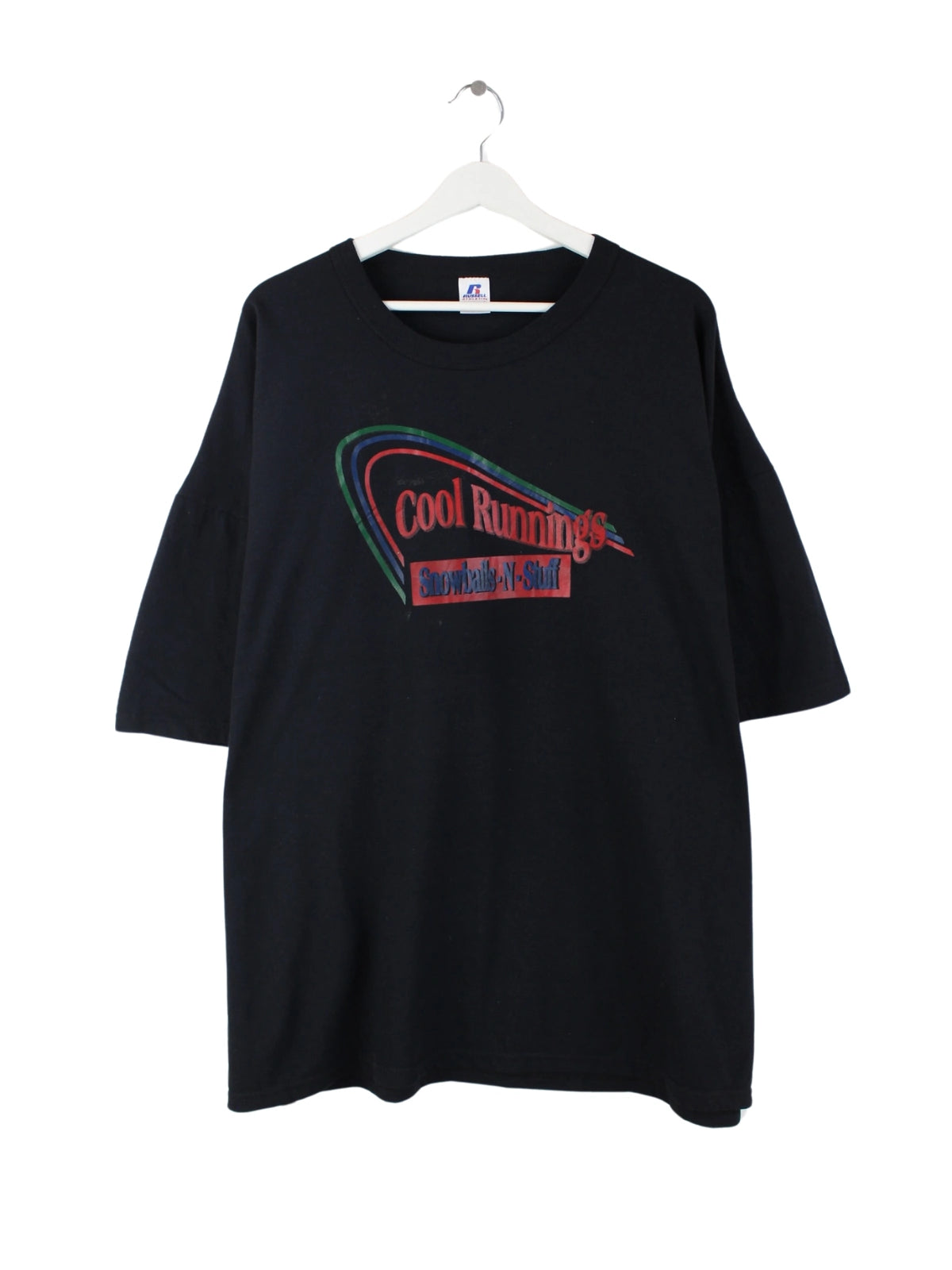 Schwarzes T-Shirt des Labels Russell Athletic in Größe 3XL. Es ist aus Baumwolle hergestellt und in gutem Zustand auf Lager. Mit chiquem Running Print.