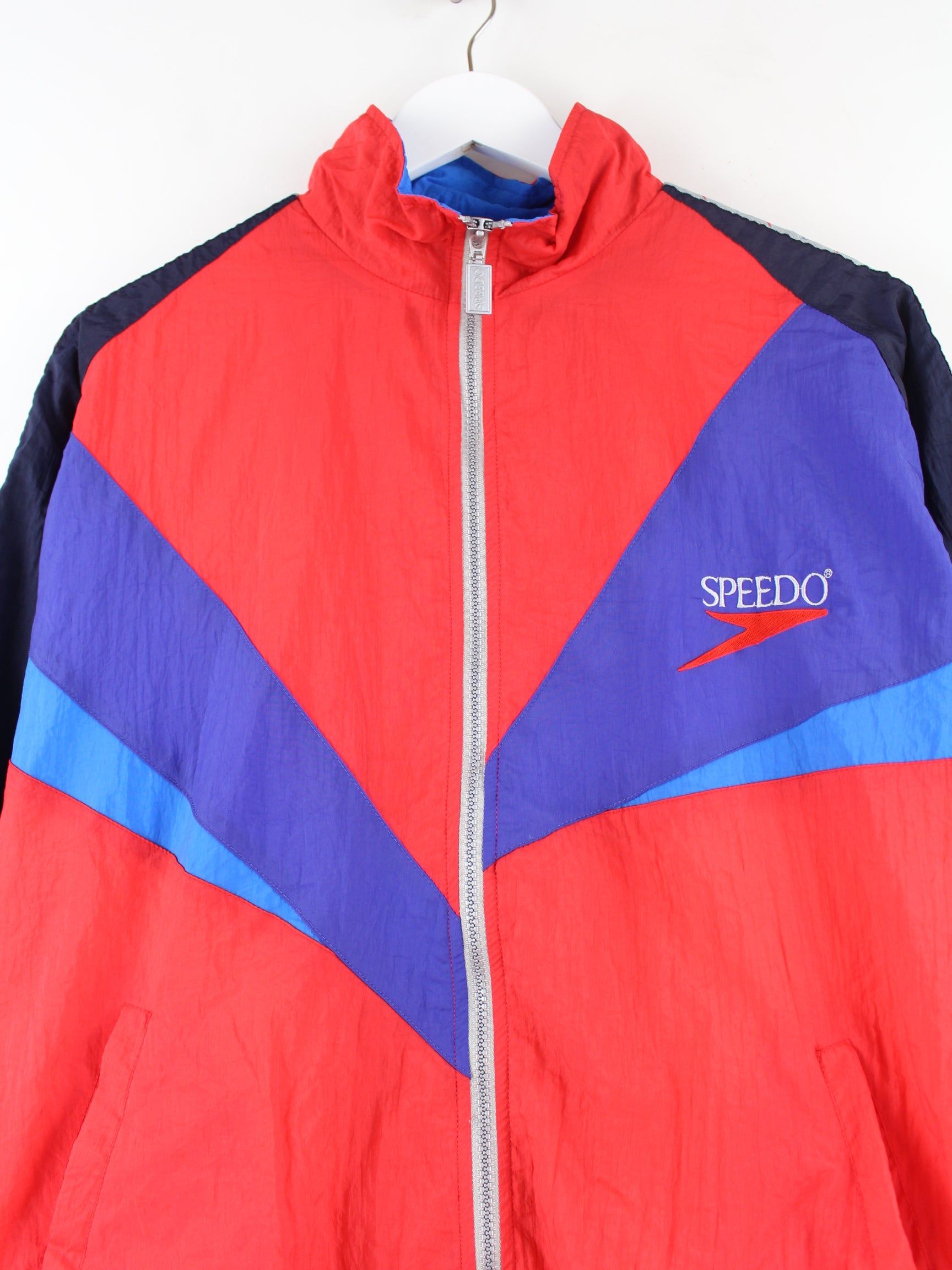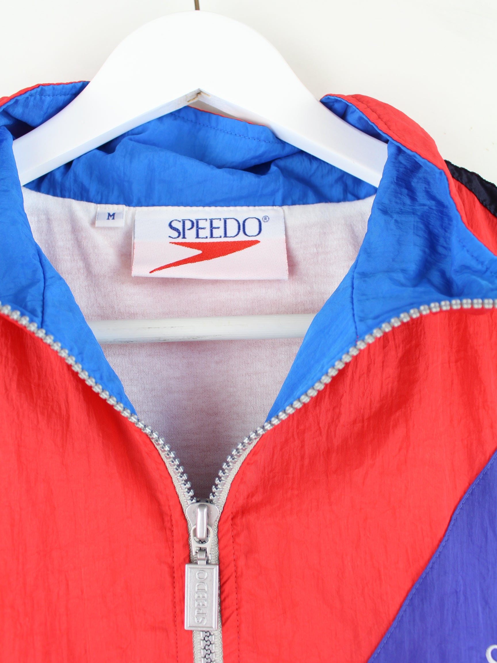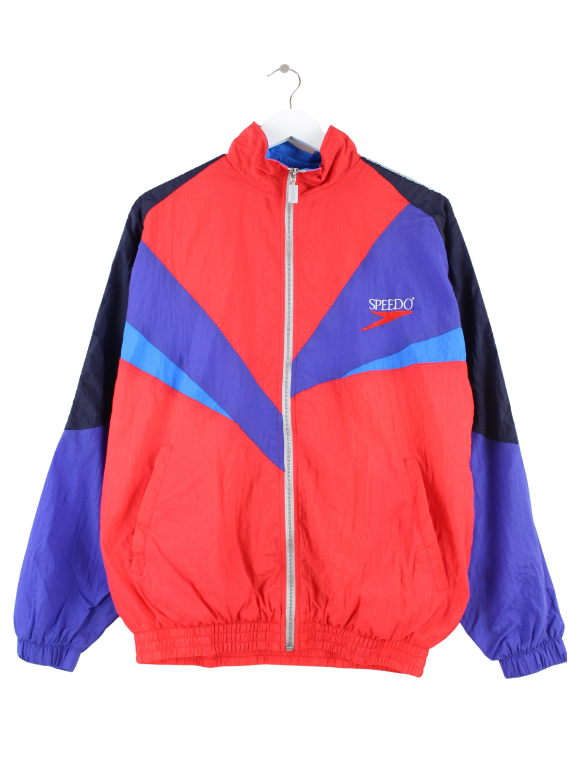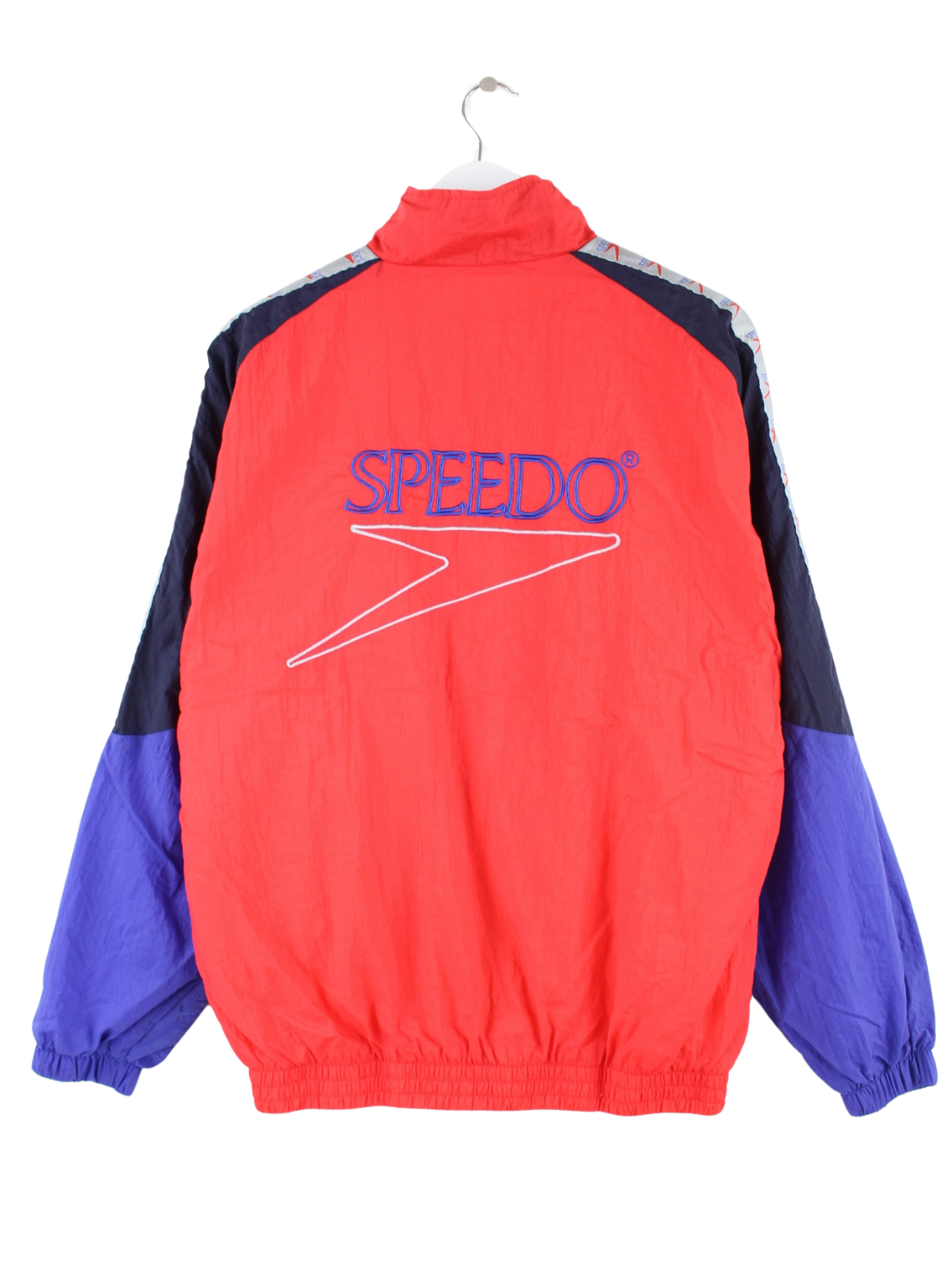 Trainingsjacke des Labels Speedo mit gesticktem Logo in Größe M aus den 80'ern. Sie ist aus Synthetik angefertigt und in bunten Farben lieferbar.