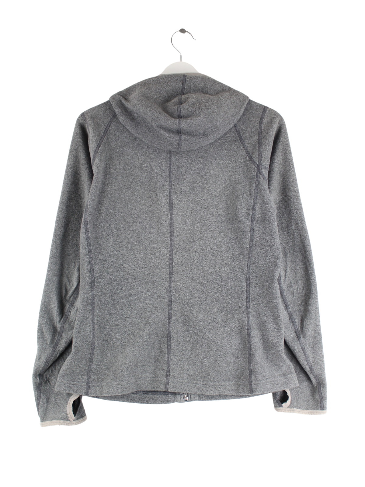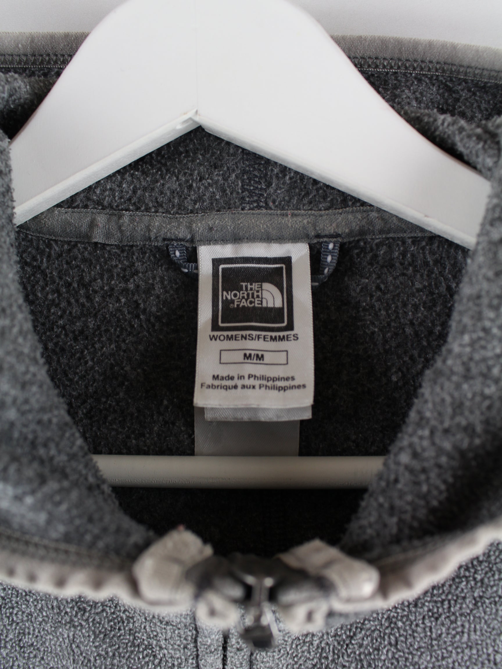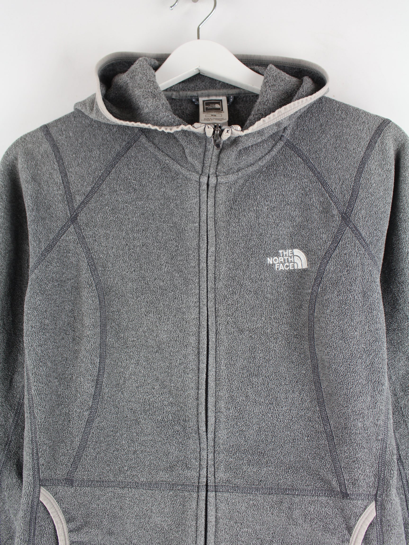 Hoodie des Labels The North Face mit langem Reißverschluß in Größe M. Er ist aus weichem Fleece angefertigt und in Grau in Stock.