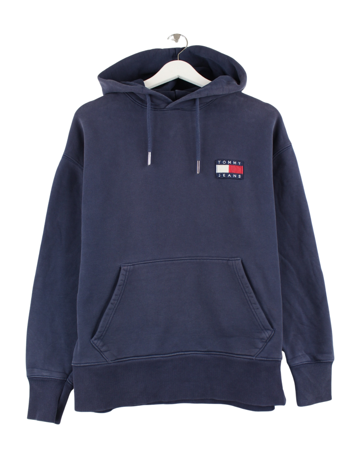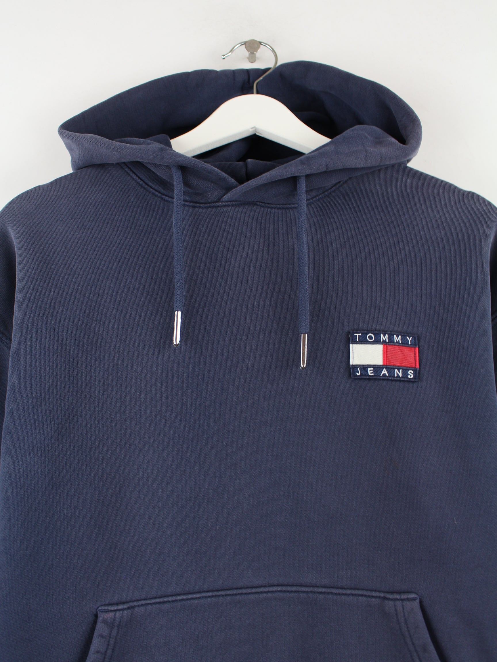Blauer Hoodie mit Stickereien von Tommy Hilfiger in Größe S. Er ist aus einer Baumwollmischung und in gutem Zustand vorrätig.