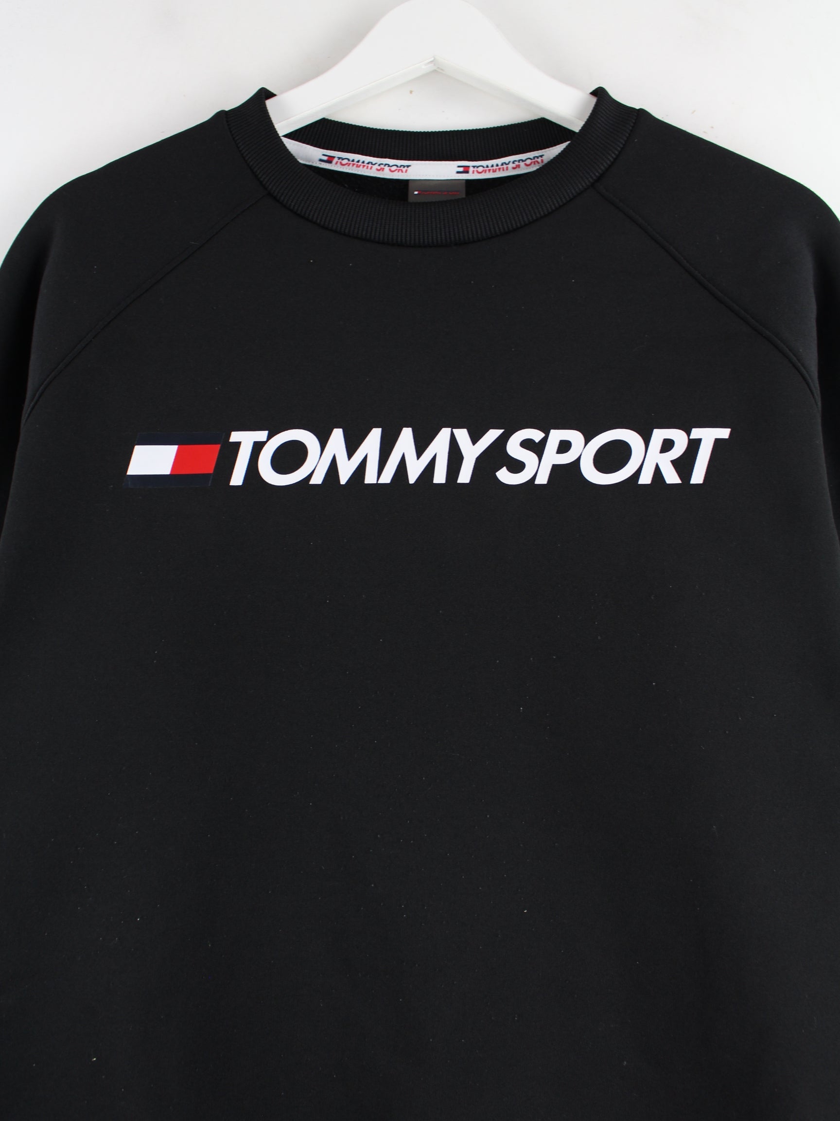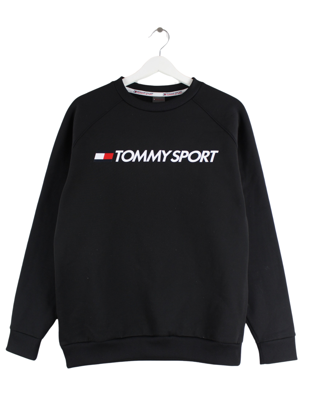 Schwarzer Sweater der Marke Tommy Hilfiger in Größe S. Er ist aus einer Baumwollmischung gefertigt und in gutem Zustand bei uns zu bekommen. Mit tollem Sport Print.