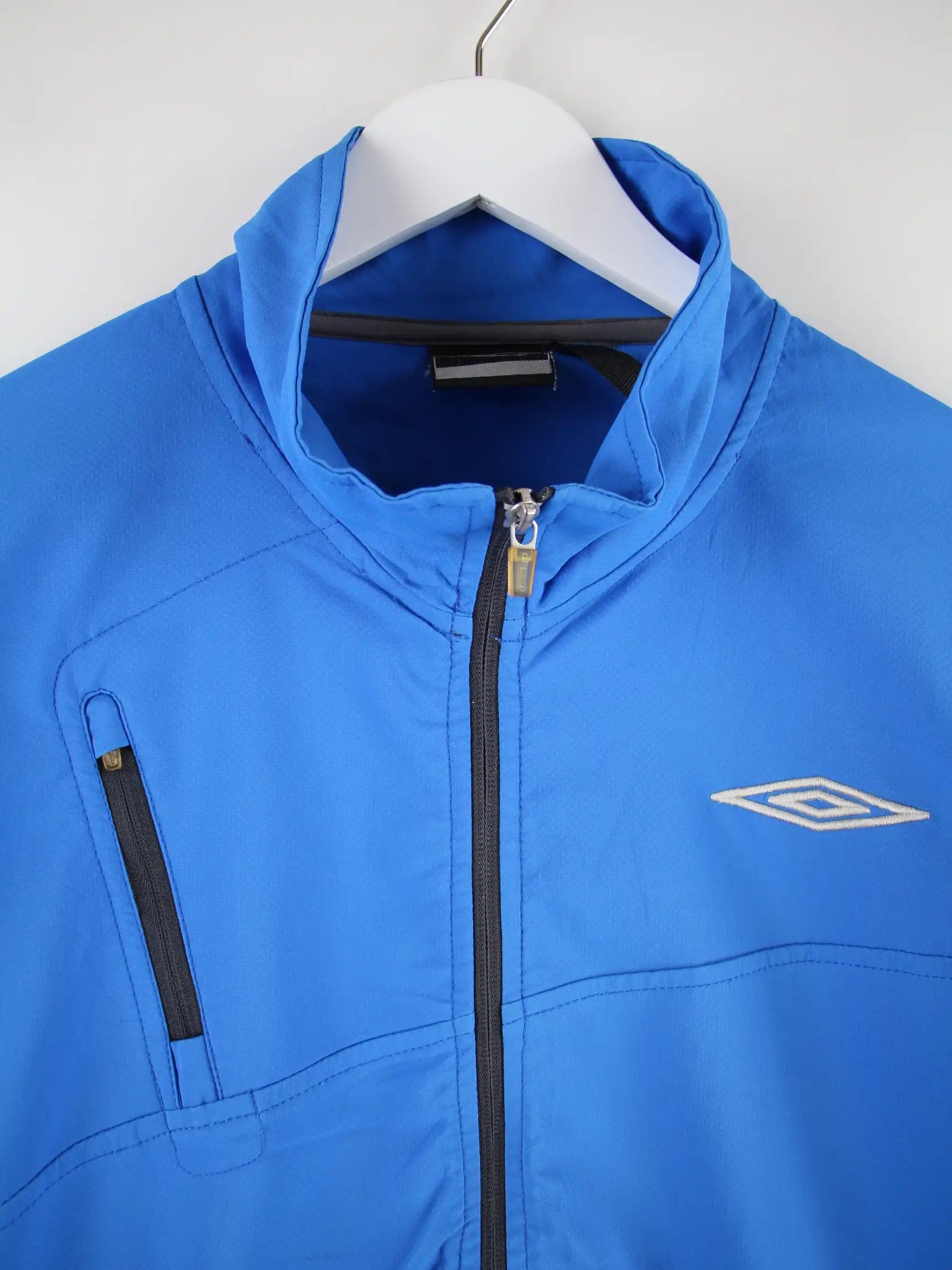Blaue Trainingsjacke aus dem Hause Umbro in Größe XL. Sie ist aus Synthetik angefertigt und in sehr gutem Zustand im Bestand.