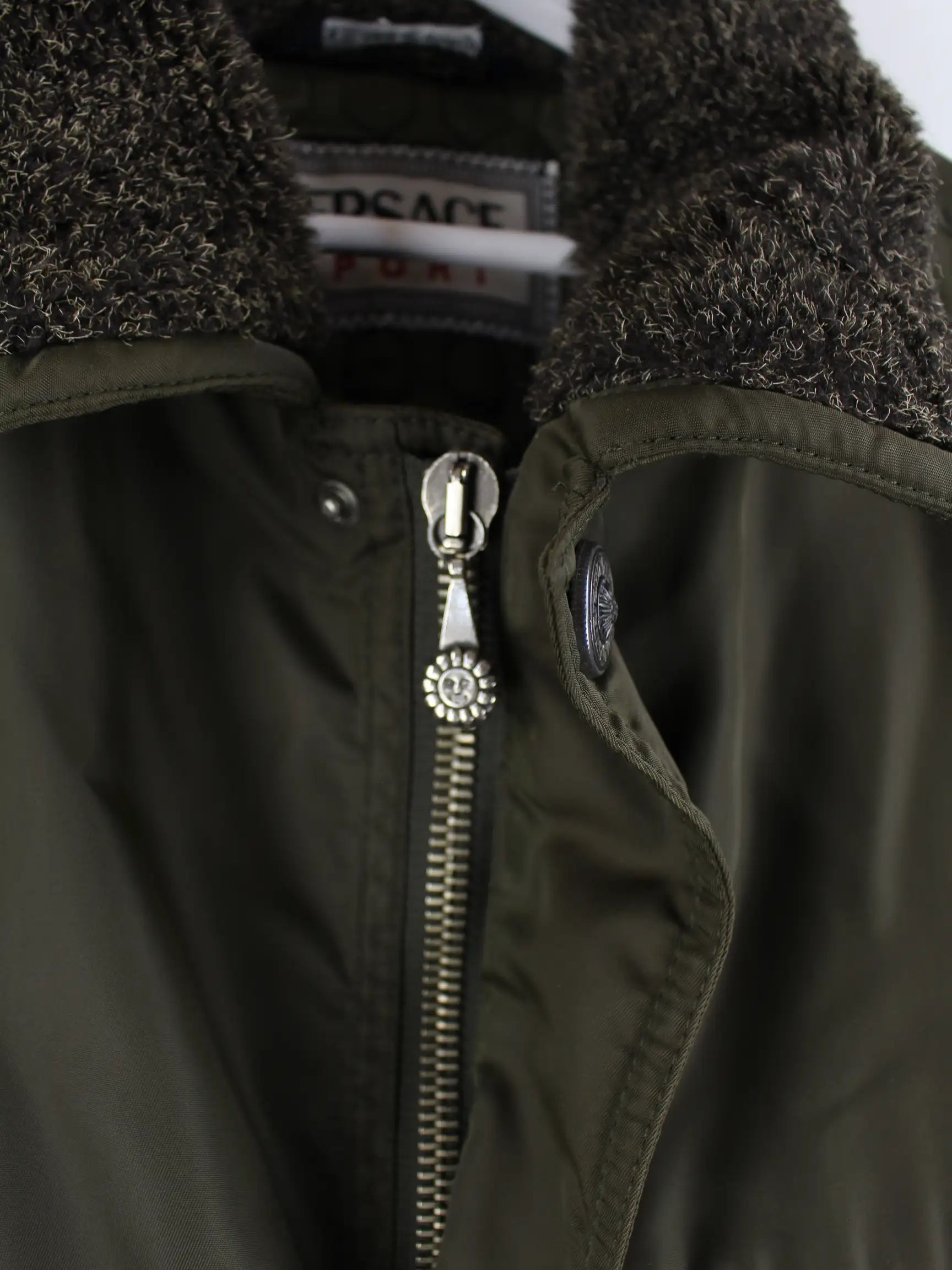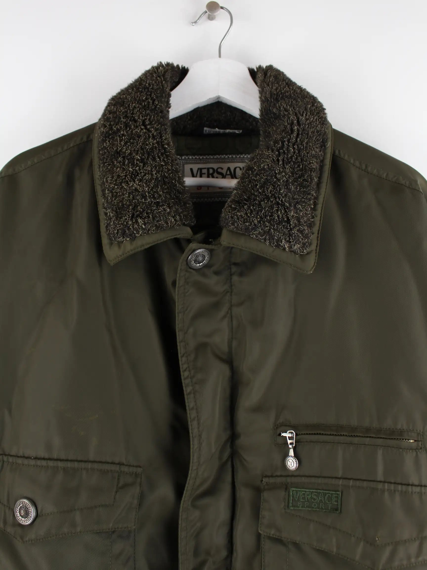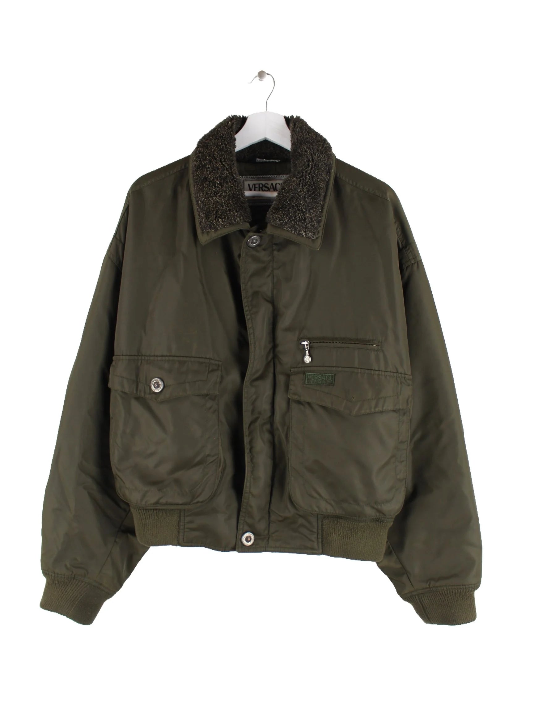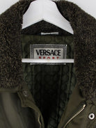 Grüne Jacke des Labels Versace aus den 90'ern in Größe L. Sie ist aus Synthetik angefertigt und in gutem Zustand in Stock.