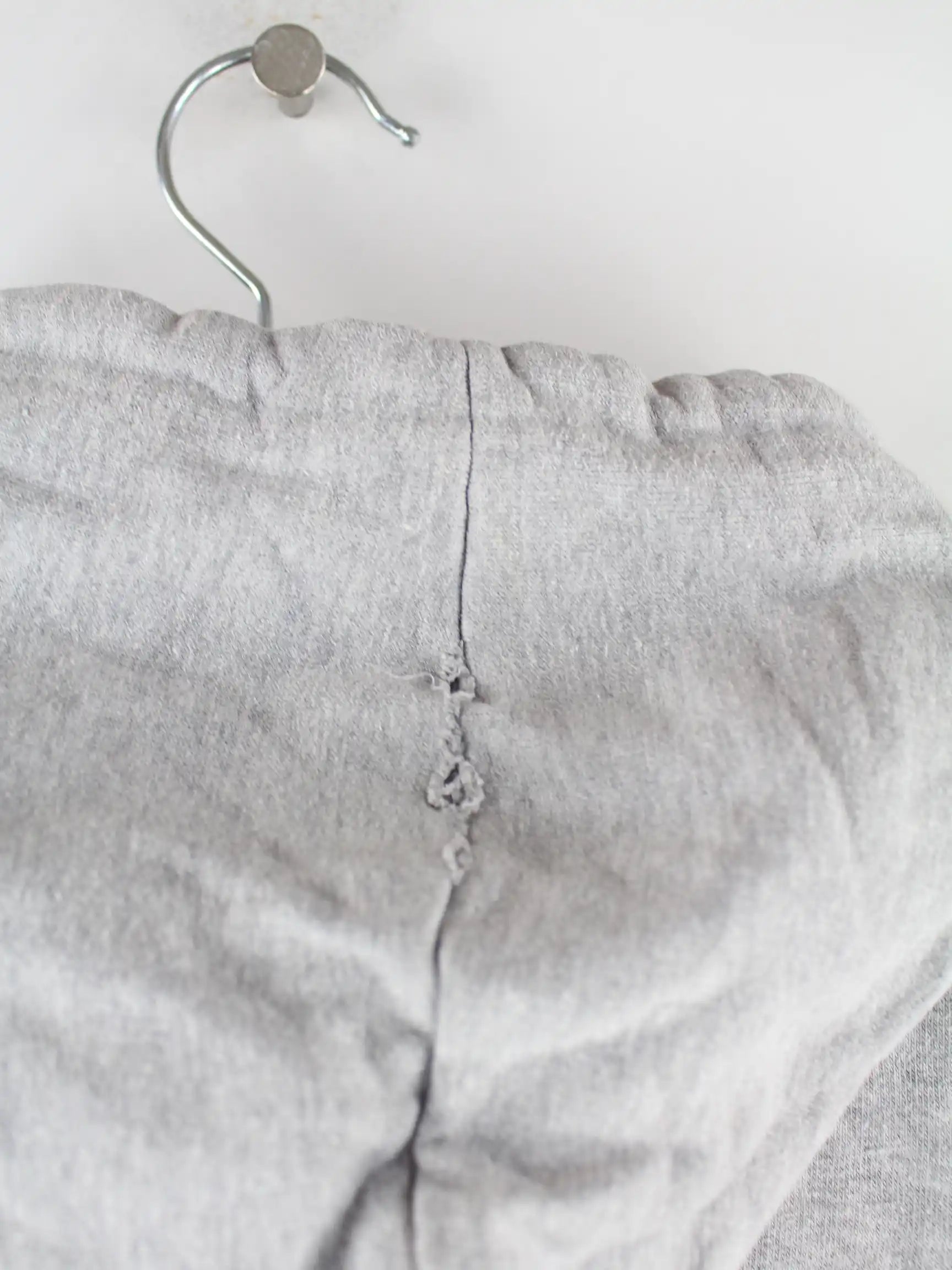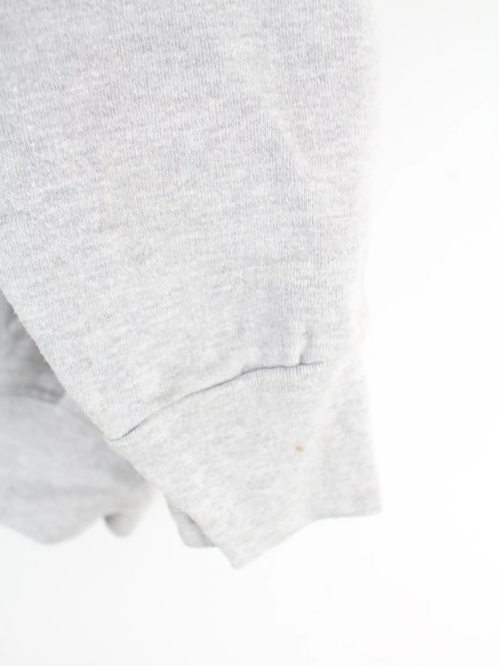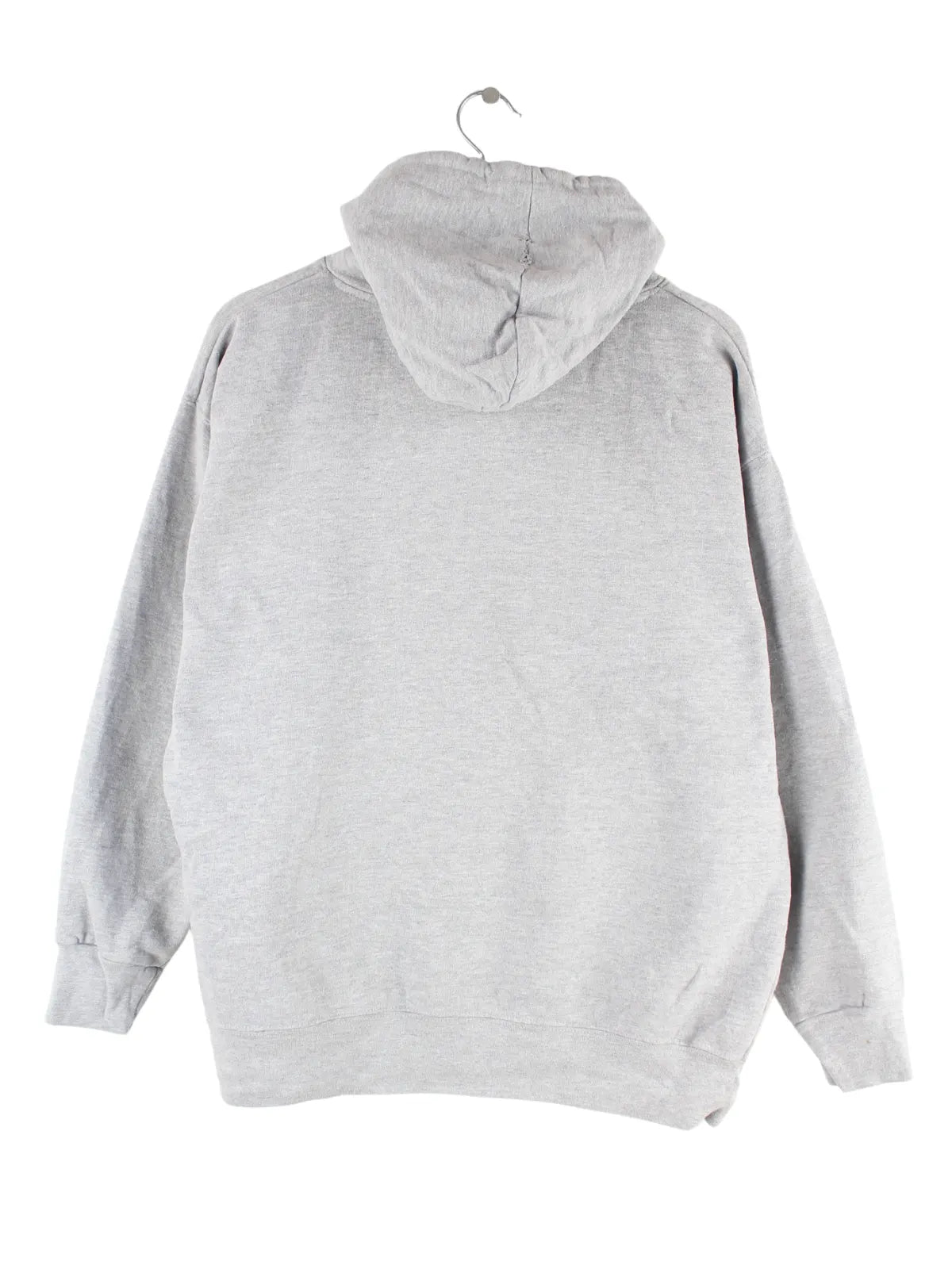 Vintage Hoodie mit gestickten Motiven in Größe L. Er ist aus einer Baumwollmischung produziert und in Grau im Bestand.